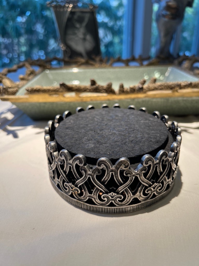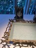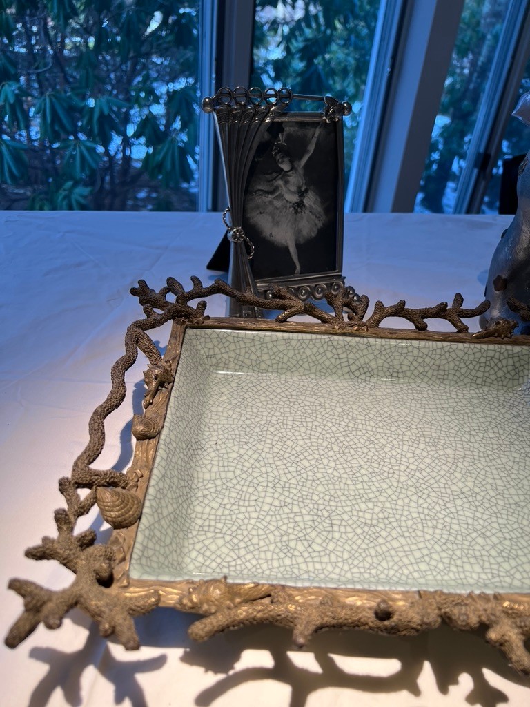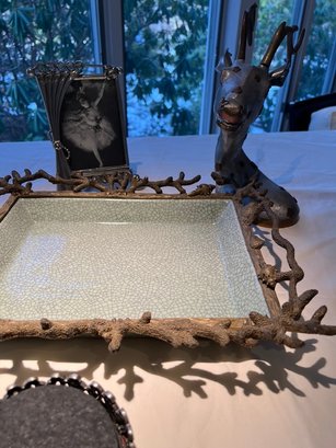 Ceramic dish framed in metal, with cork coasters, delicate frame, deer statue with stainless and brass