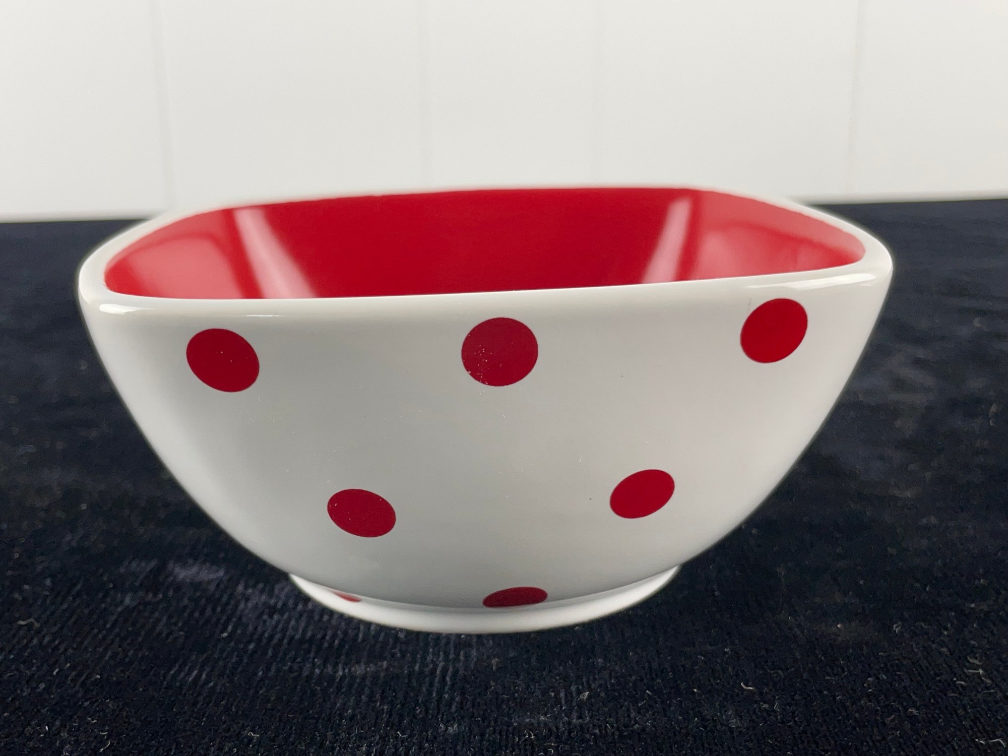 Square shaped rounded edges bowl. Red interior, patterned design exterior. Made in china. Few minimal scratches seen in images. See photos for more conditions and sizing.