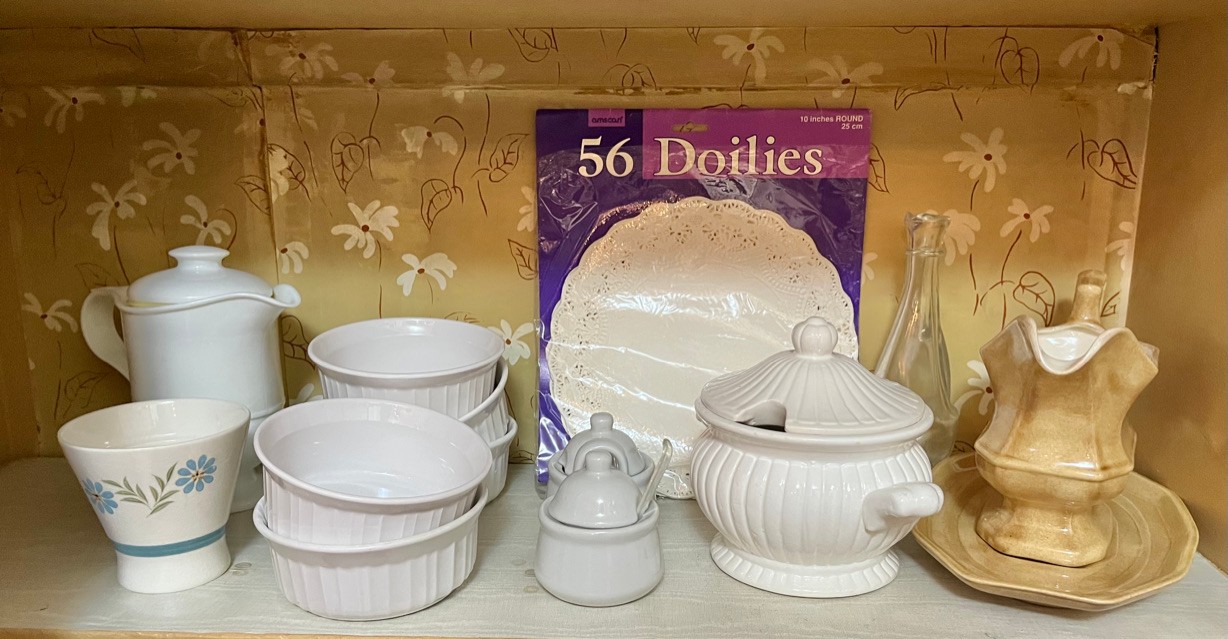 Sup, lidded pitcher & doilies