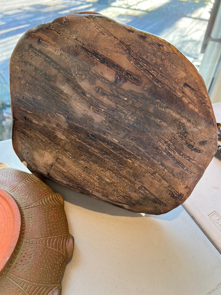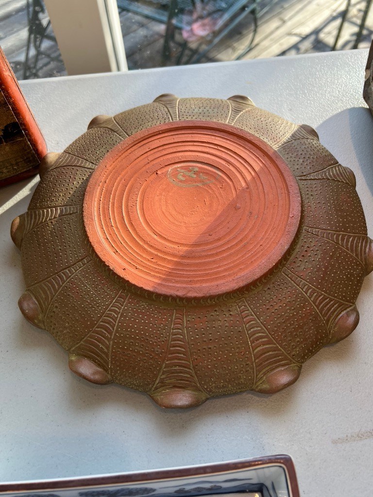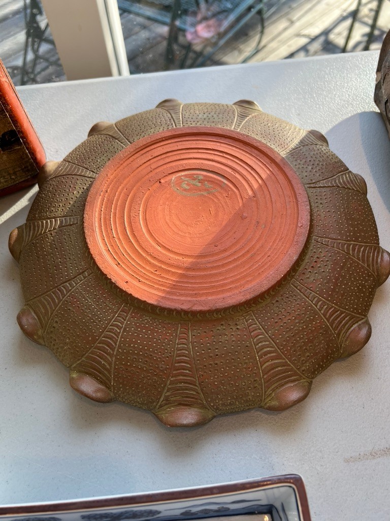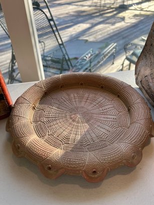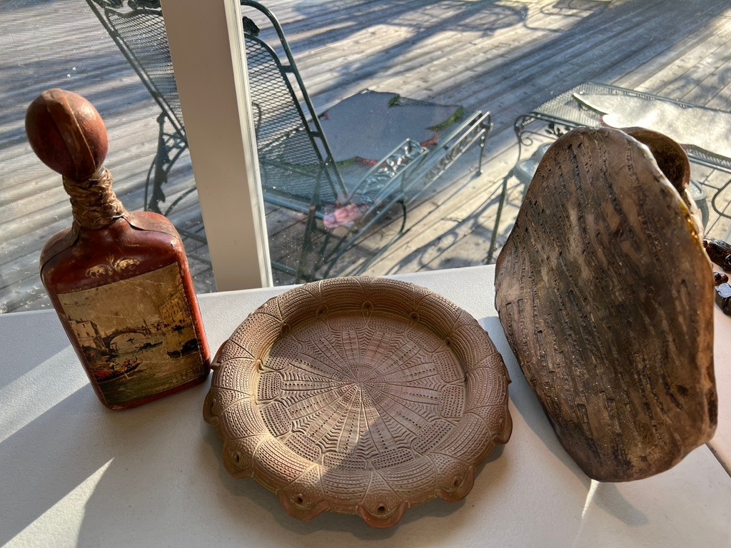 ceramic vase, ceramic ash tray, leather covered bottle