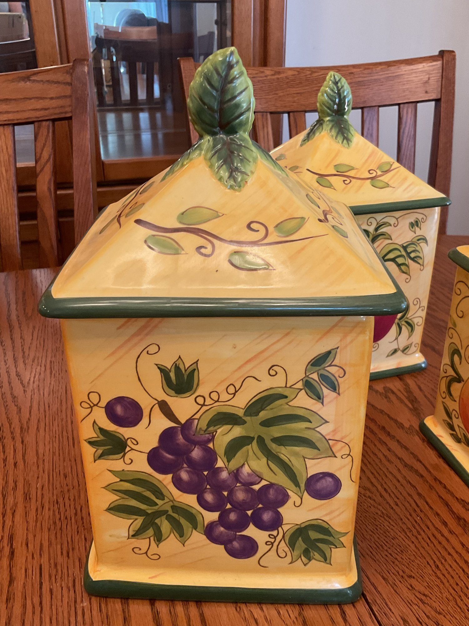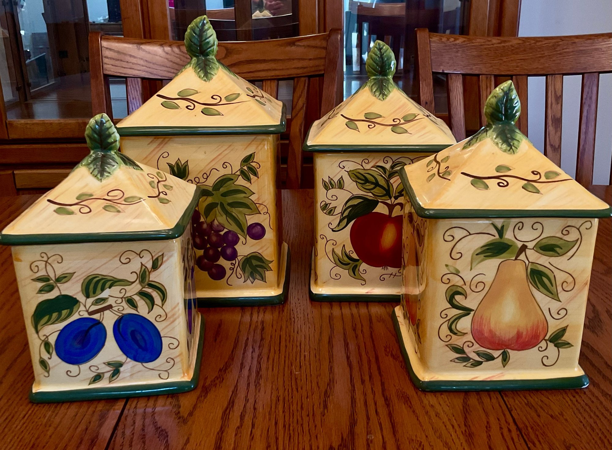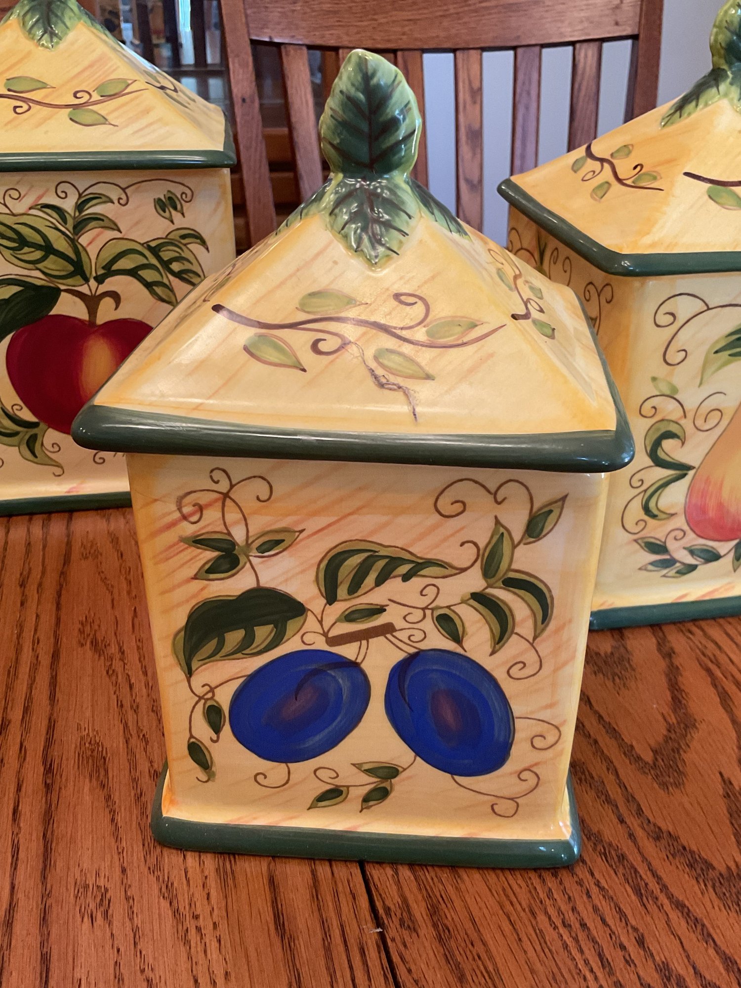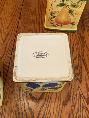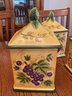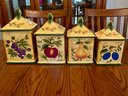 This is a charming 4-piece ceramic kitchen canister set from Certified International. Each square-tapered canister features a vibrant, hand-painted style fruit motif—grapes, apple, pear, and plums—accented with scrolling vines and deep green trim on a warm yellow ground. The lids are topped with sculptural green leaf finials.