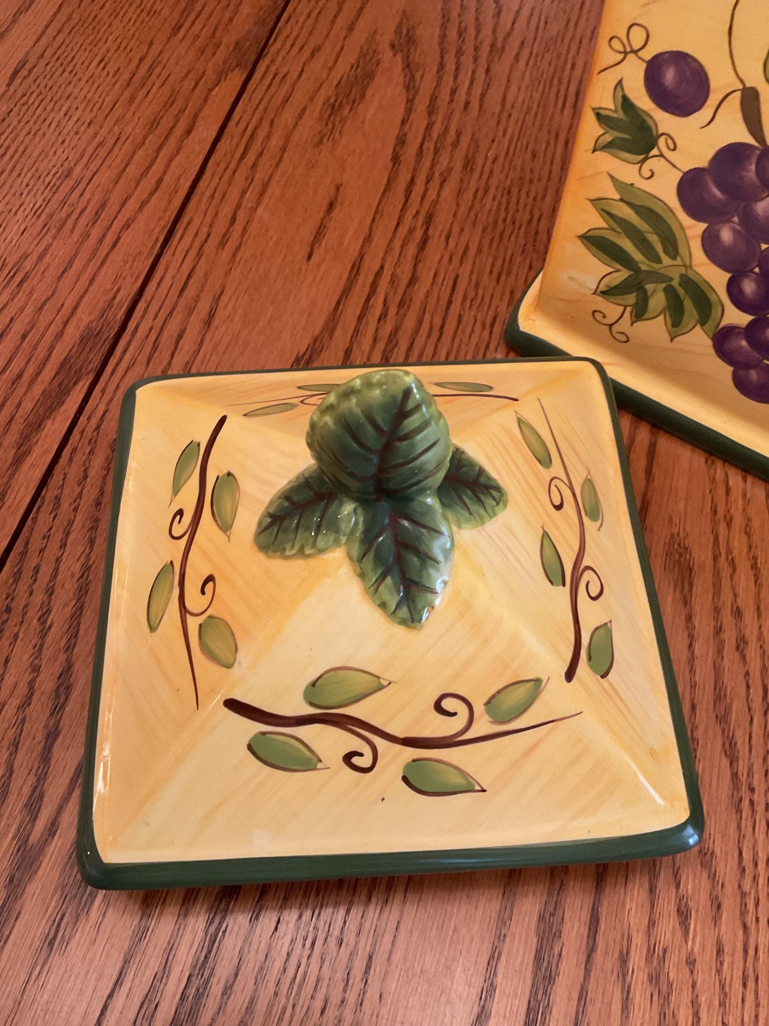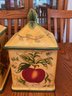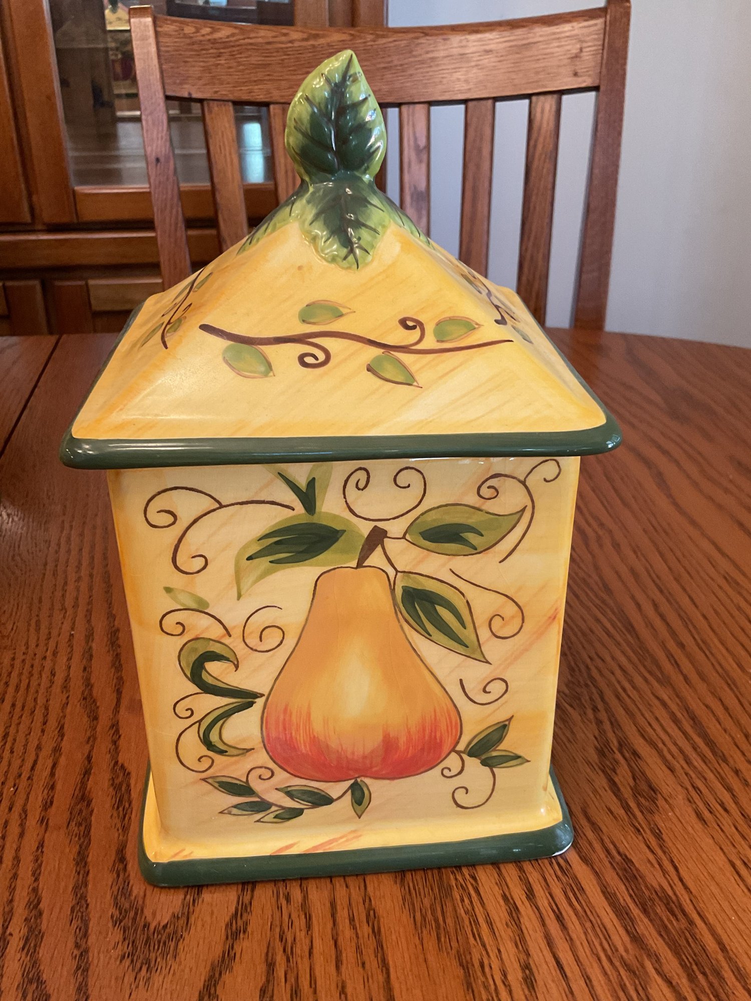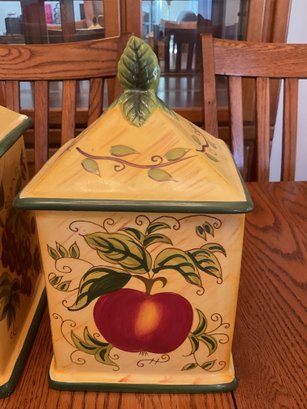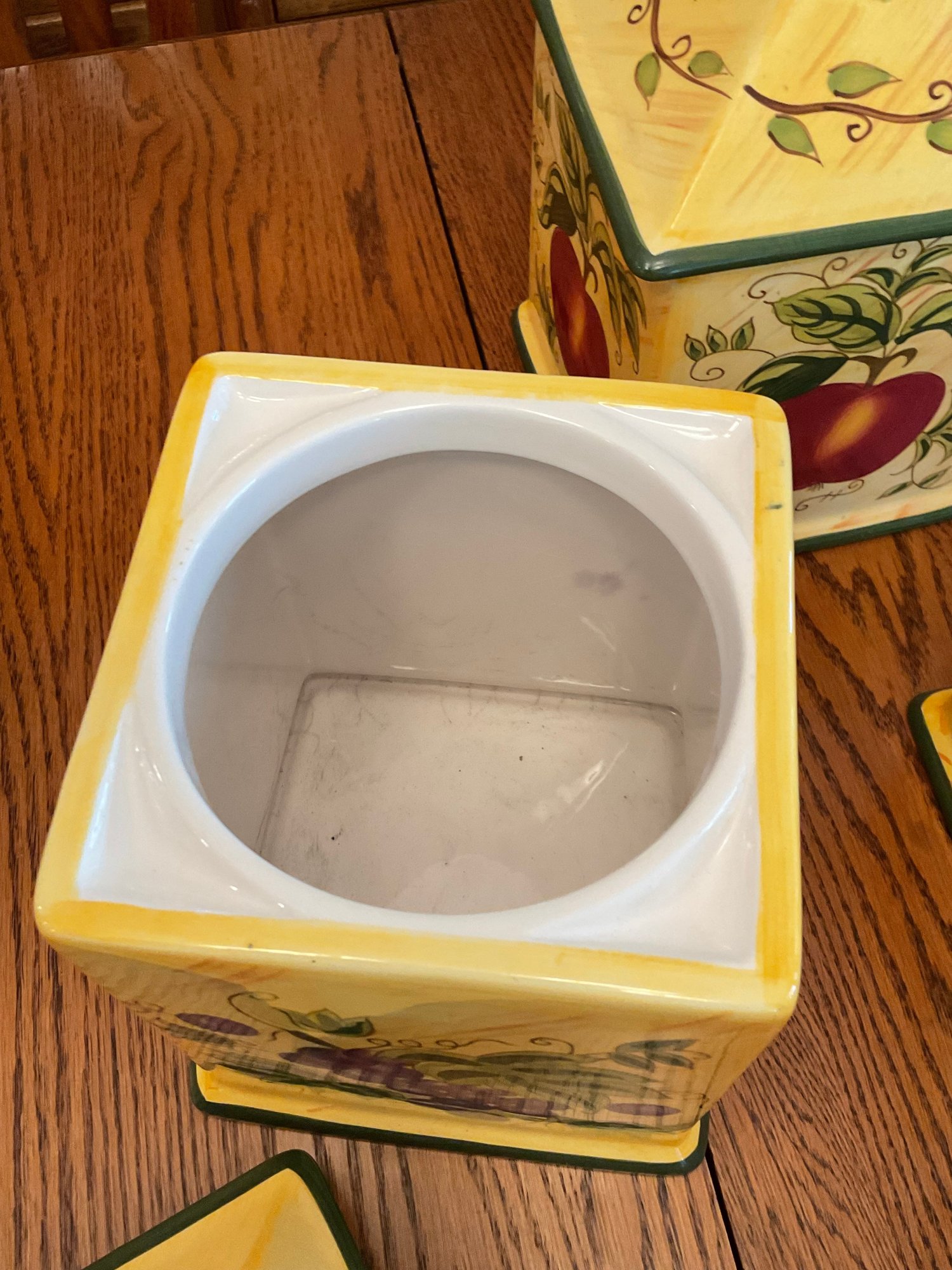 This is a charming 4-piece ceramic kitchen canister set from Certified International. Each square-tapered canister features a vibrant, hand-painted style fruit motif—grapes, apple, pear, and plums—accented with scrolling vines and deep green trim on a warm yellow ground. The lids are topped with sculptural green leaf finials.