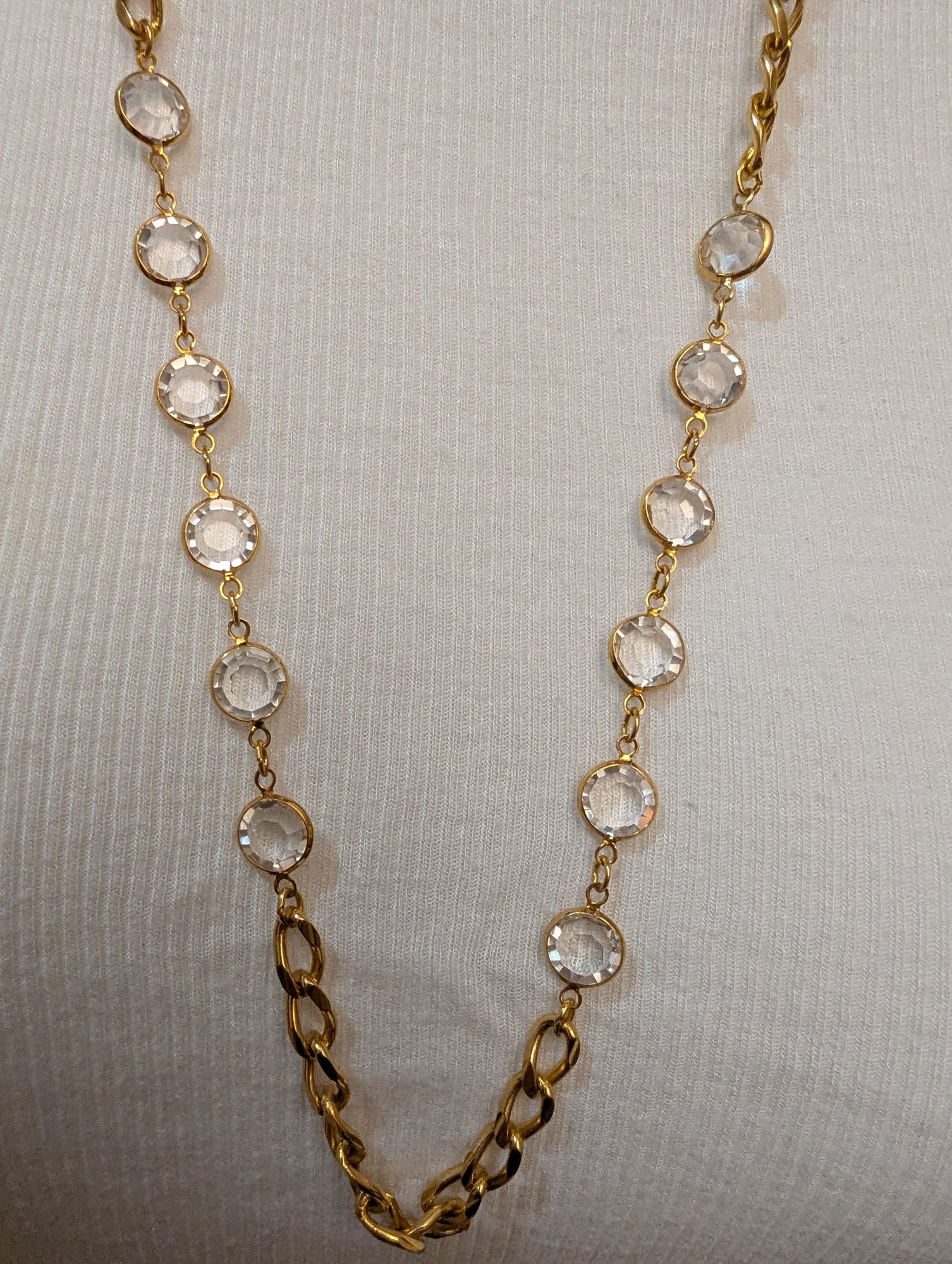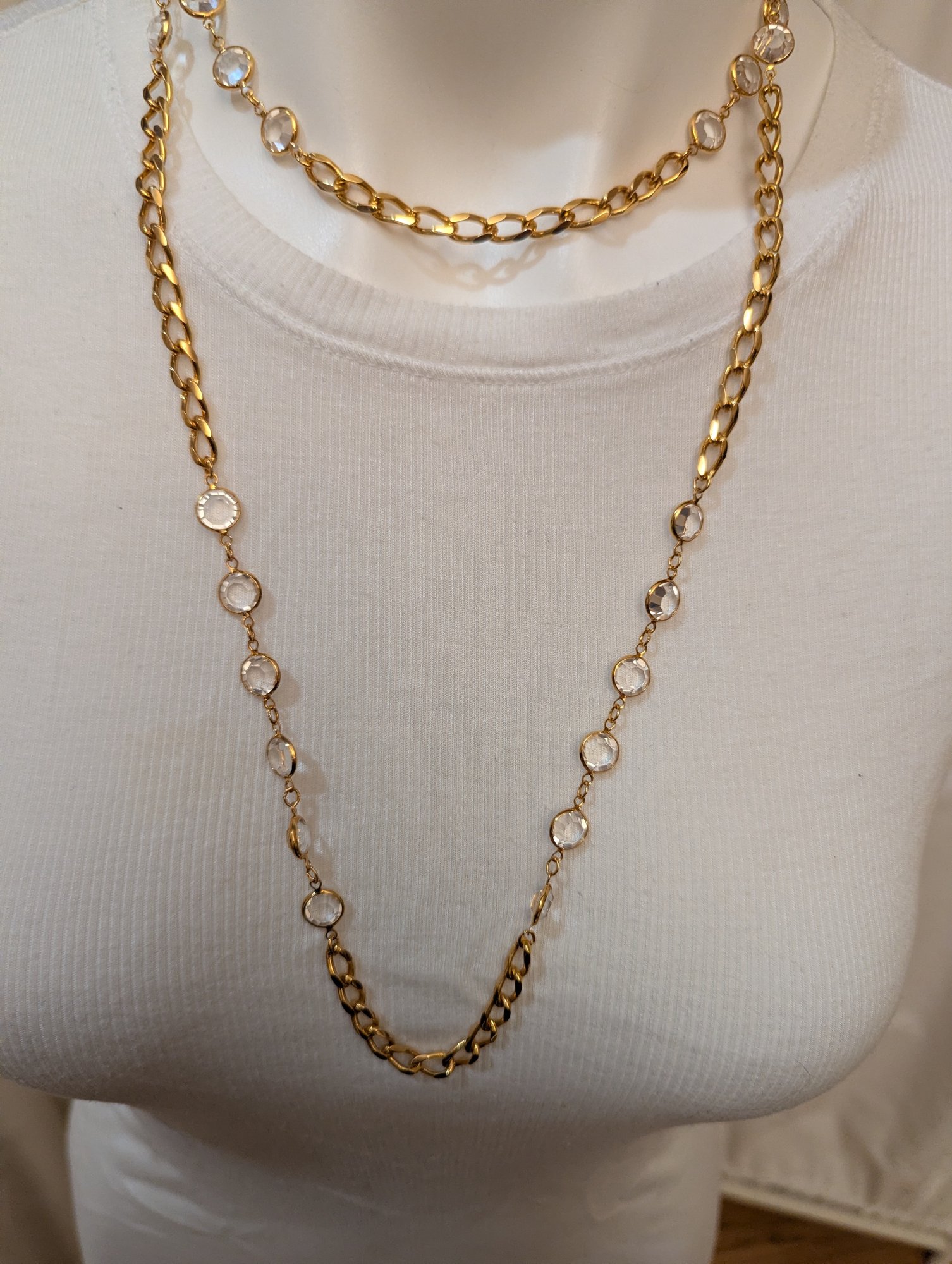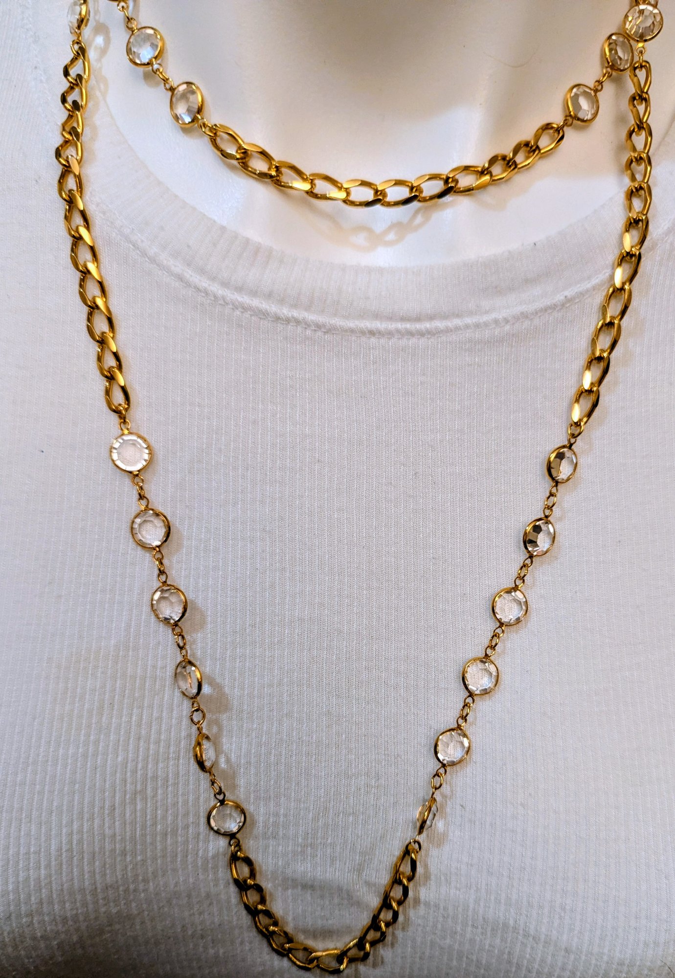 Channel Style 40" Clear Facet Cut Crystals Open Bezel Necklace In Gold Plate