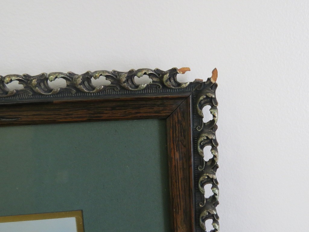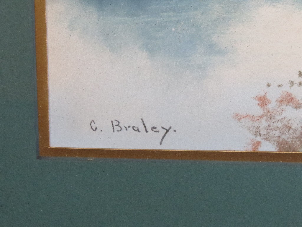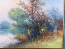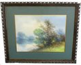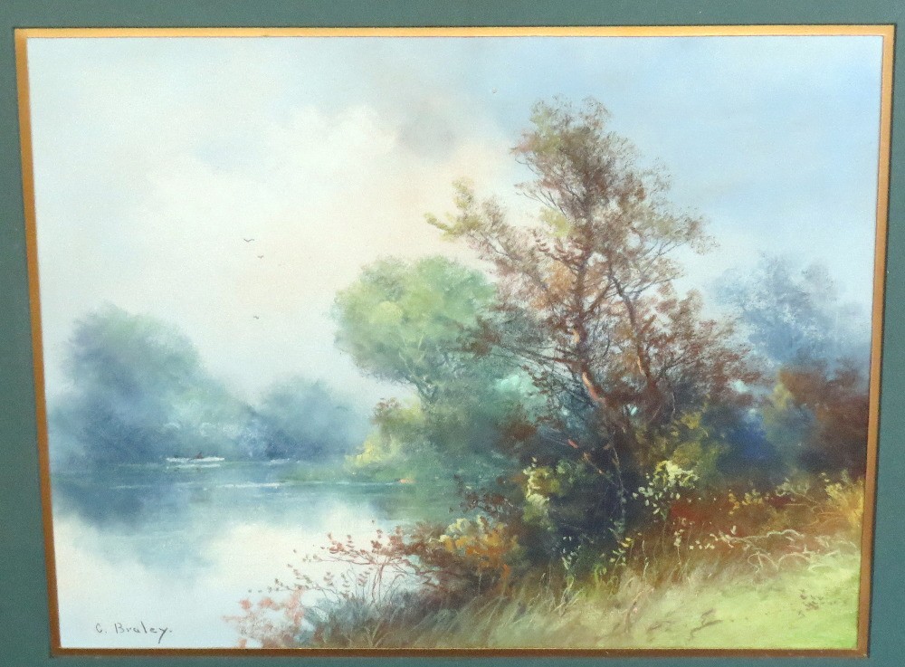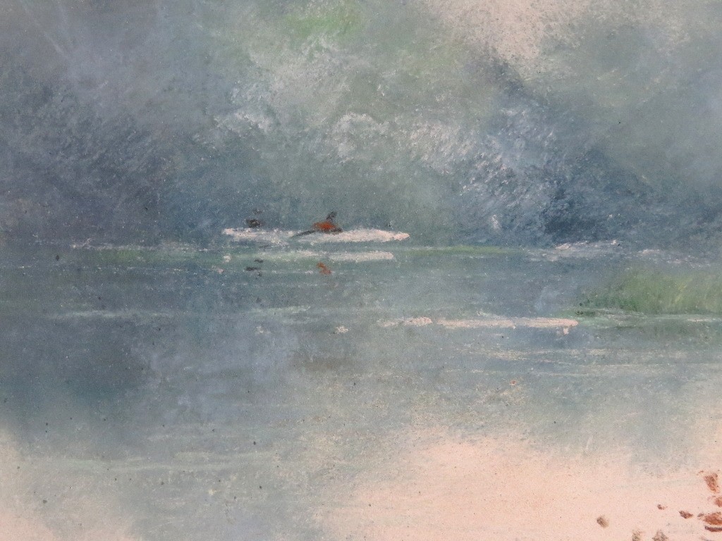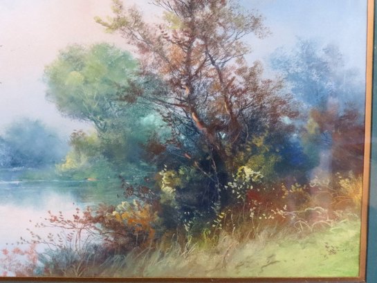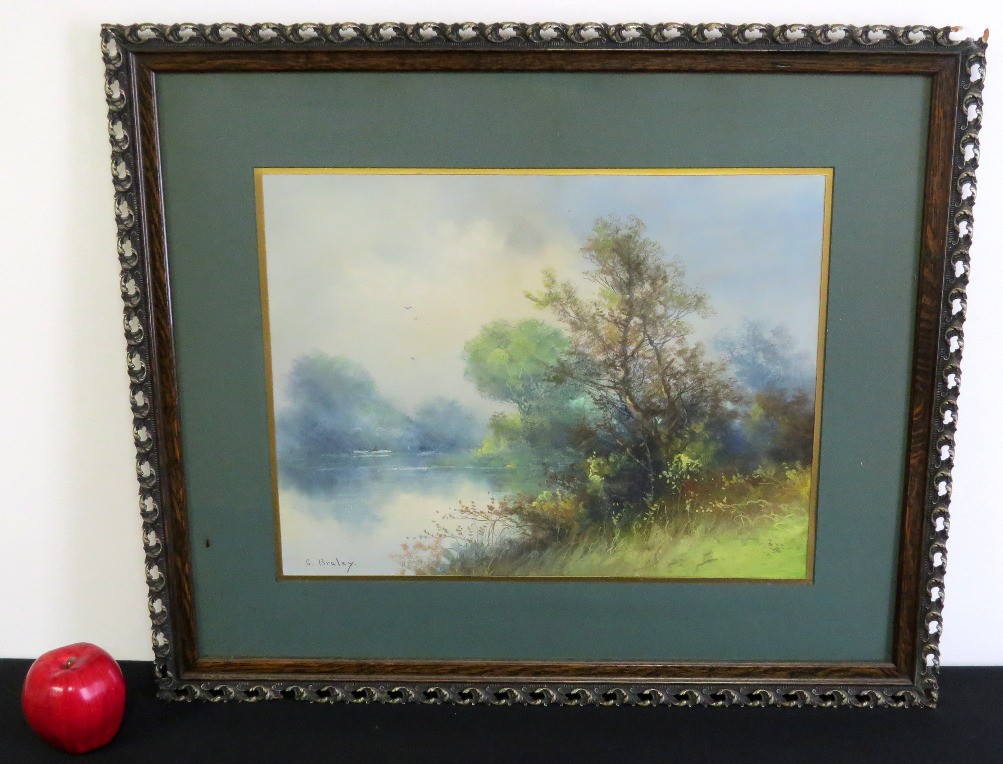 Clarence Braley (Mass, 1854-1927) pastel on paper of a summer landscape on water's edge, a single fisherman in their boat on the far side. Original 19th frame, measuring 26.5" x 22" in size framed, minor loss at frame edge.