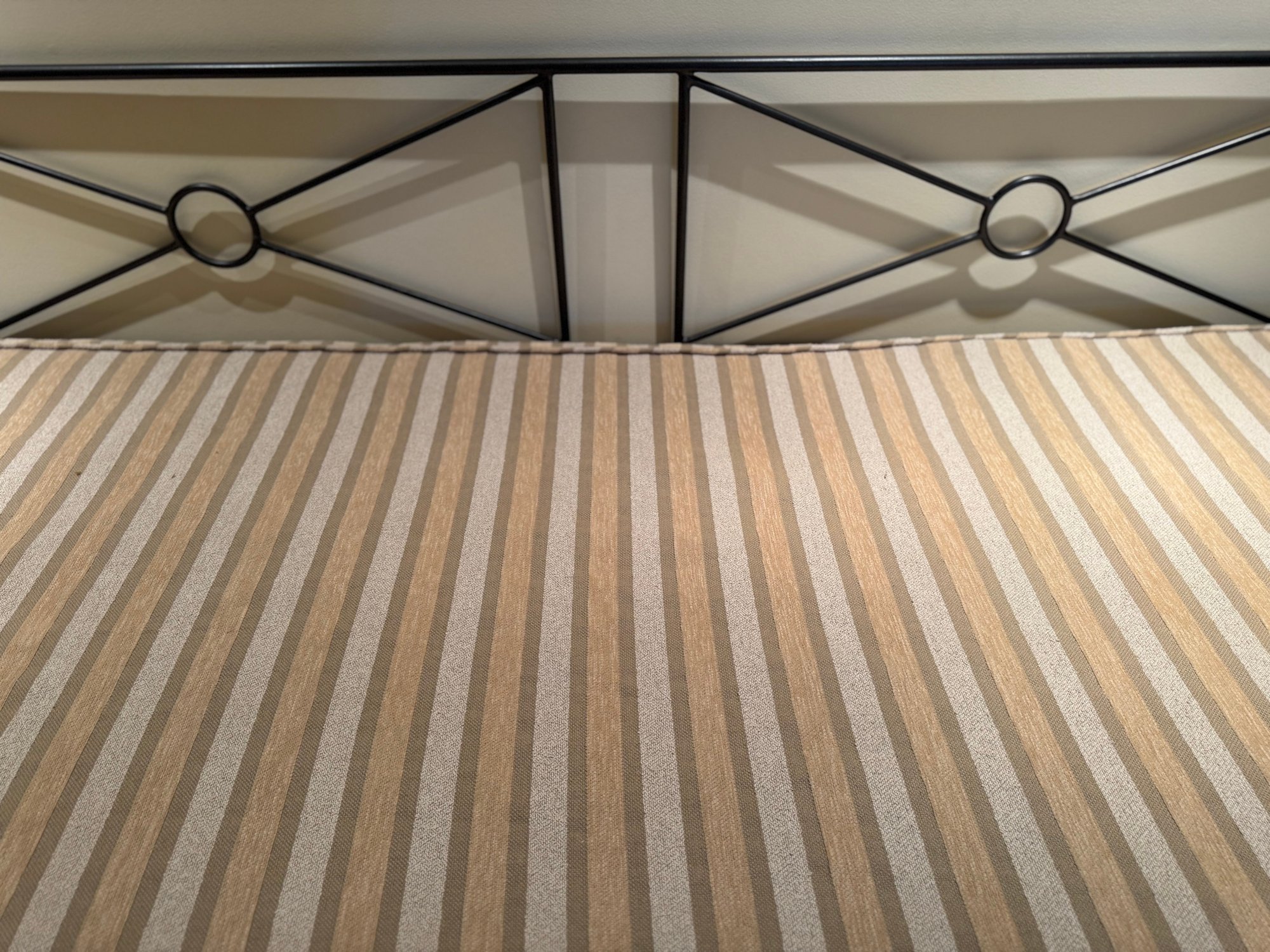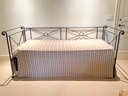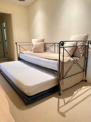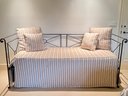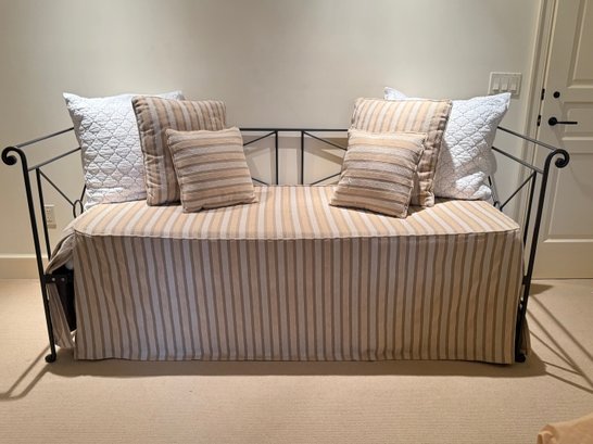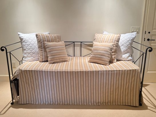 Beautiful classic style Charles P. Rogers daybed bed either trundle bed for guests. Frame is an iron open minimal design in a charcoal finish that can blend beautifully with contemporary or country interiors. The top cover was custom made and Includes 4 matching stripe pillows. Very nice condition where it has been used in a guest room of this weekend home.