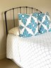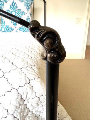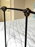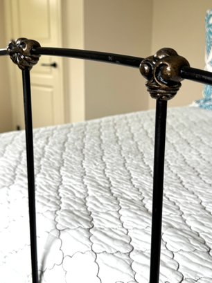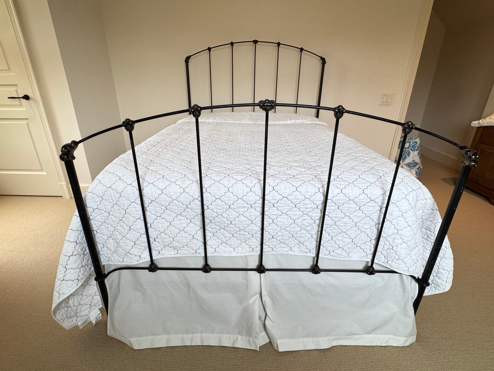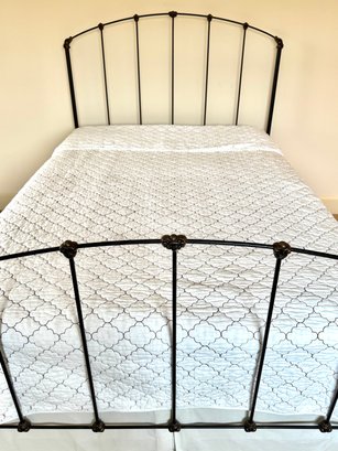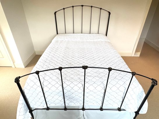 Simple and minimally modern lovely iron bed by Charles P. Rogers Furniture. In lovely condition where it has been used in the guest room of this weekend home. Linens include: Tailored bedskirt, Sage Duvet cover and insert, Fitted sheet, 2 standard pillow shams. *Note that the white coverlet & blue floral pillows in photo are not included