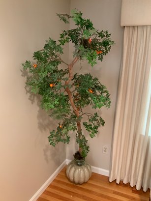 Fabulous and unusual style decorative tree has real wood trunk with multiple branches and small orange fruit for a colorful accent. Heavy glass base filled with sand for stability. Includes a faux bird's nest with a small orange bird. Very pretty tree, the pictures do not capture its charm.