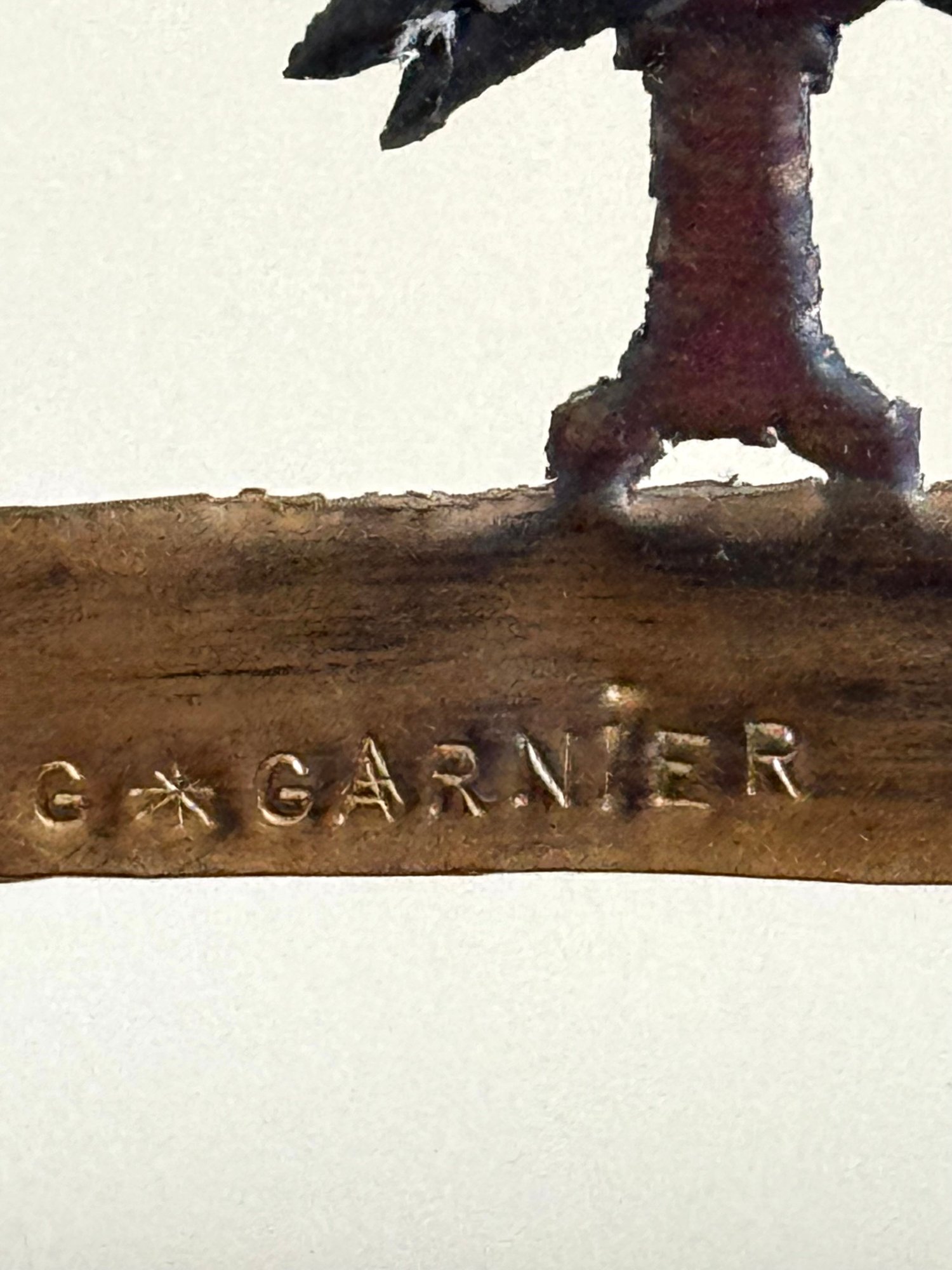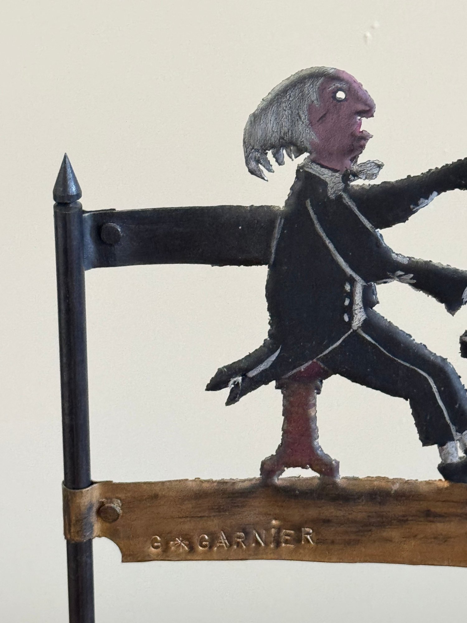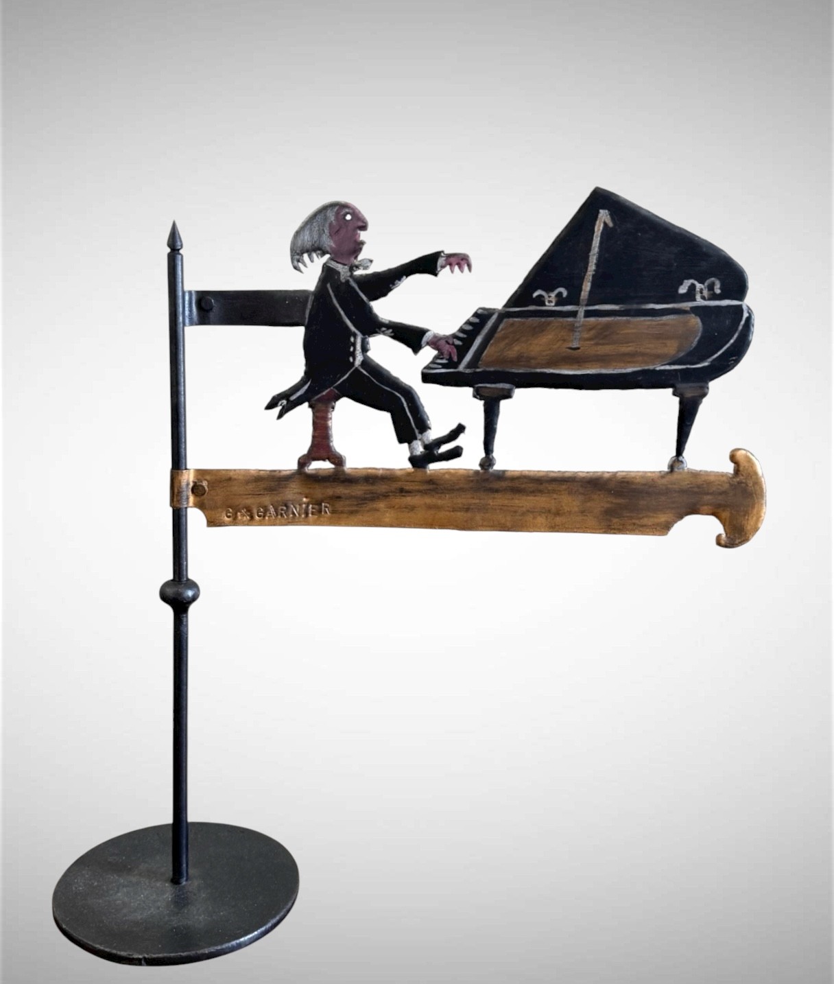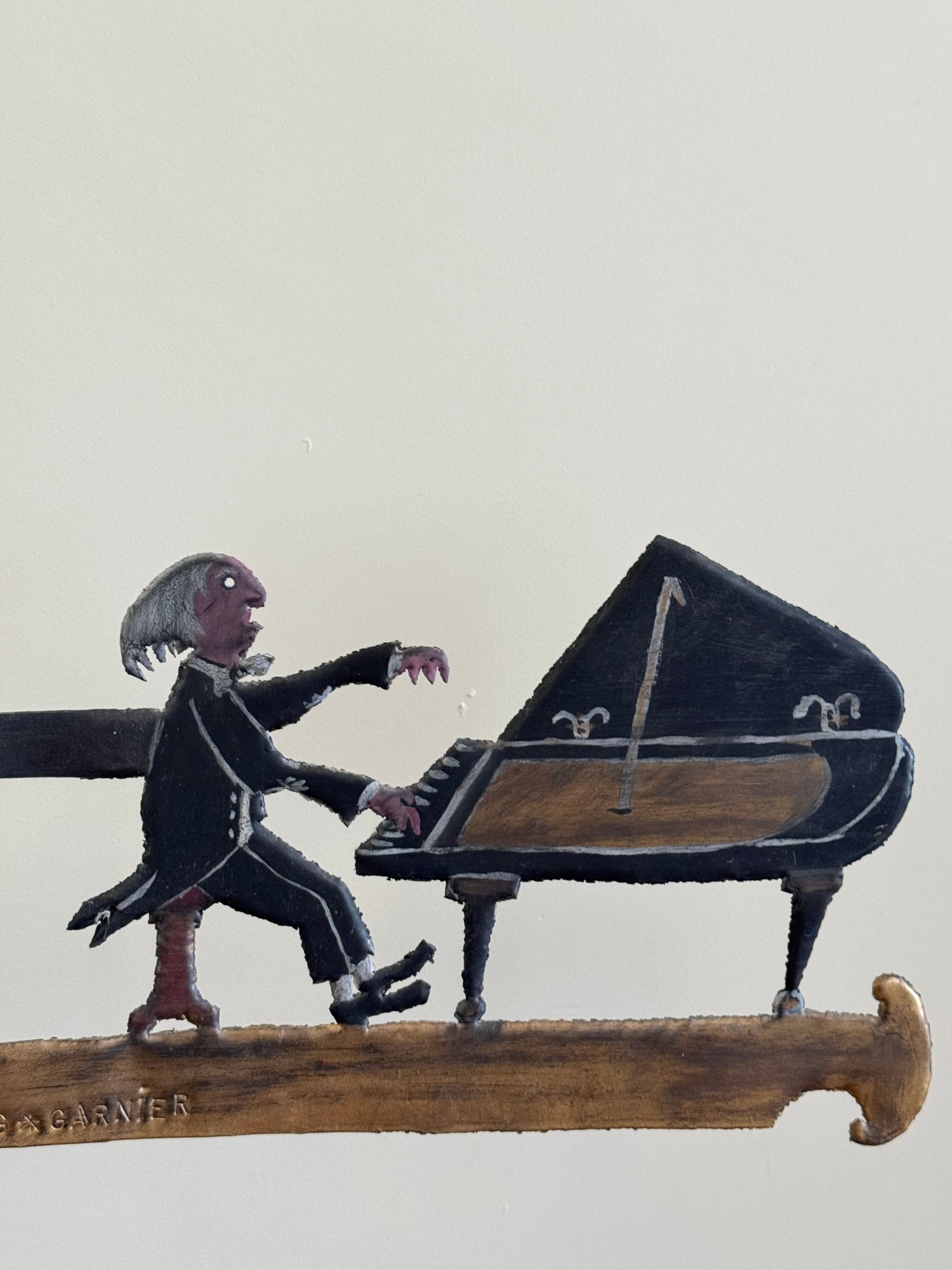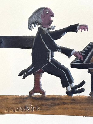 Sweet and utterly charming metal folk art depicting, a joyous musician playing his piano. Signed on plank