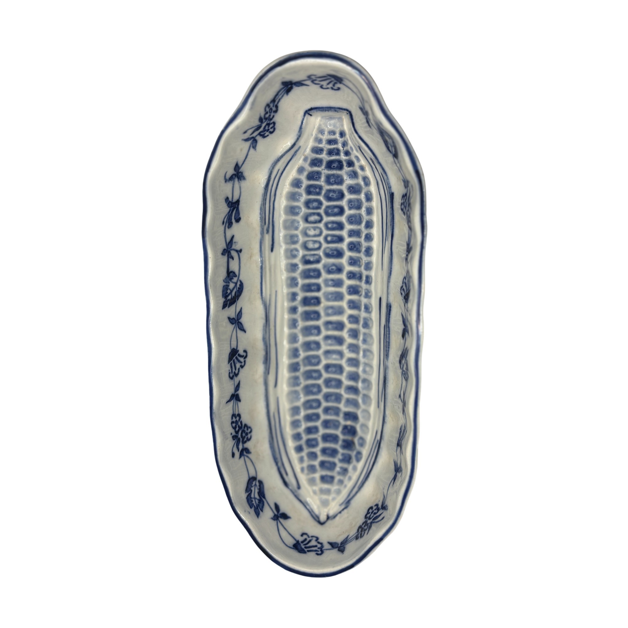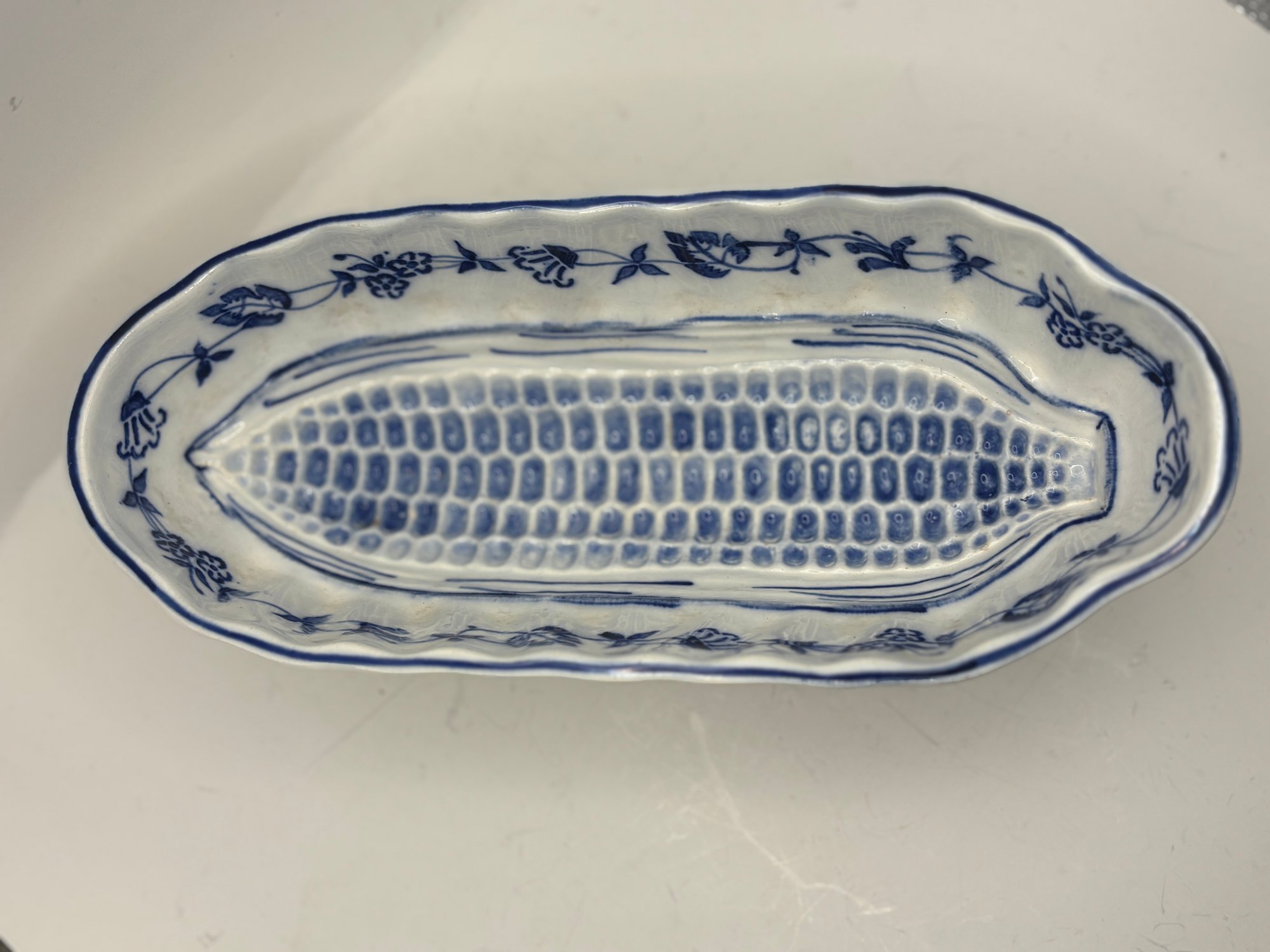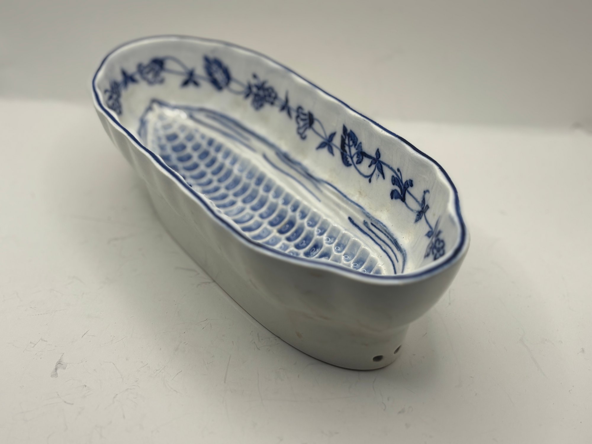 Charming blue and white oval serving dish specifically designed for corn on the cob, featuring a molded ear-of-corn relief in the center to cradle and elevate the cob while catching butter and juices below. The interior is decorated with a delicate cobalt floral garland and hand-drawn accent lines, finished with a softly scalloped rim. Marked G.M.T. & Bro., Germany on the underside. A wonderful specialty serving piece that blends function with classic European porcelain style.
