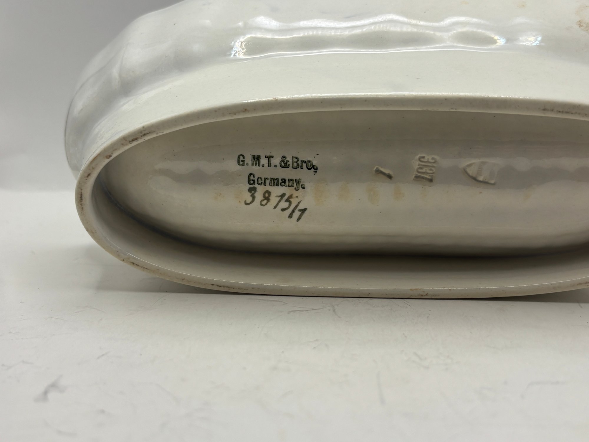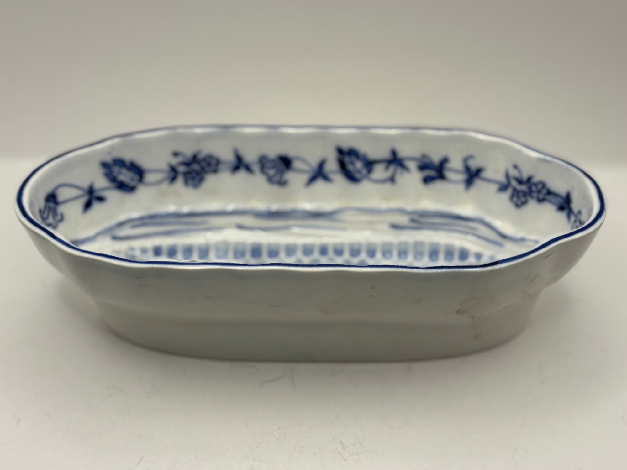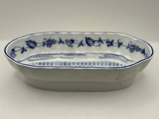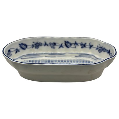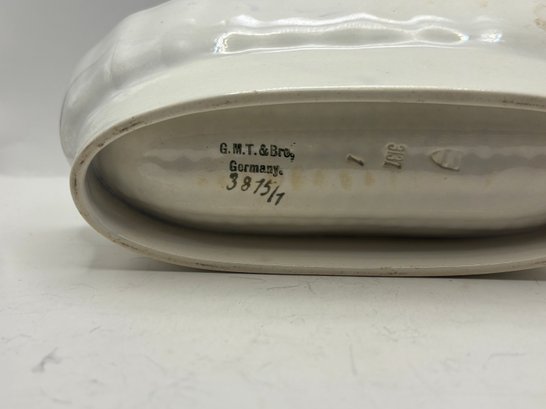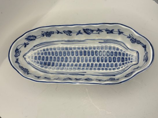 Charming blue and white oval serving dish specifically designed for corn on the cob, featuring a molded ear-of-corn relief in the center to cradle and elevate the cob while catching butter and juices below. The interior is decorated with a delicate cobalt floral garland and hand-drawn accent lines, finished with a softly scalloped rim. Marked G.M.T. & Bro., Germany on the underside. A wonderful specialty serving piece that blends function with classic European porcelain style.