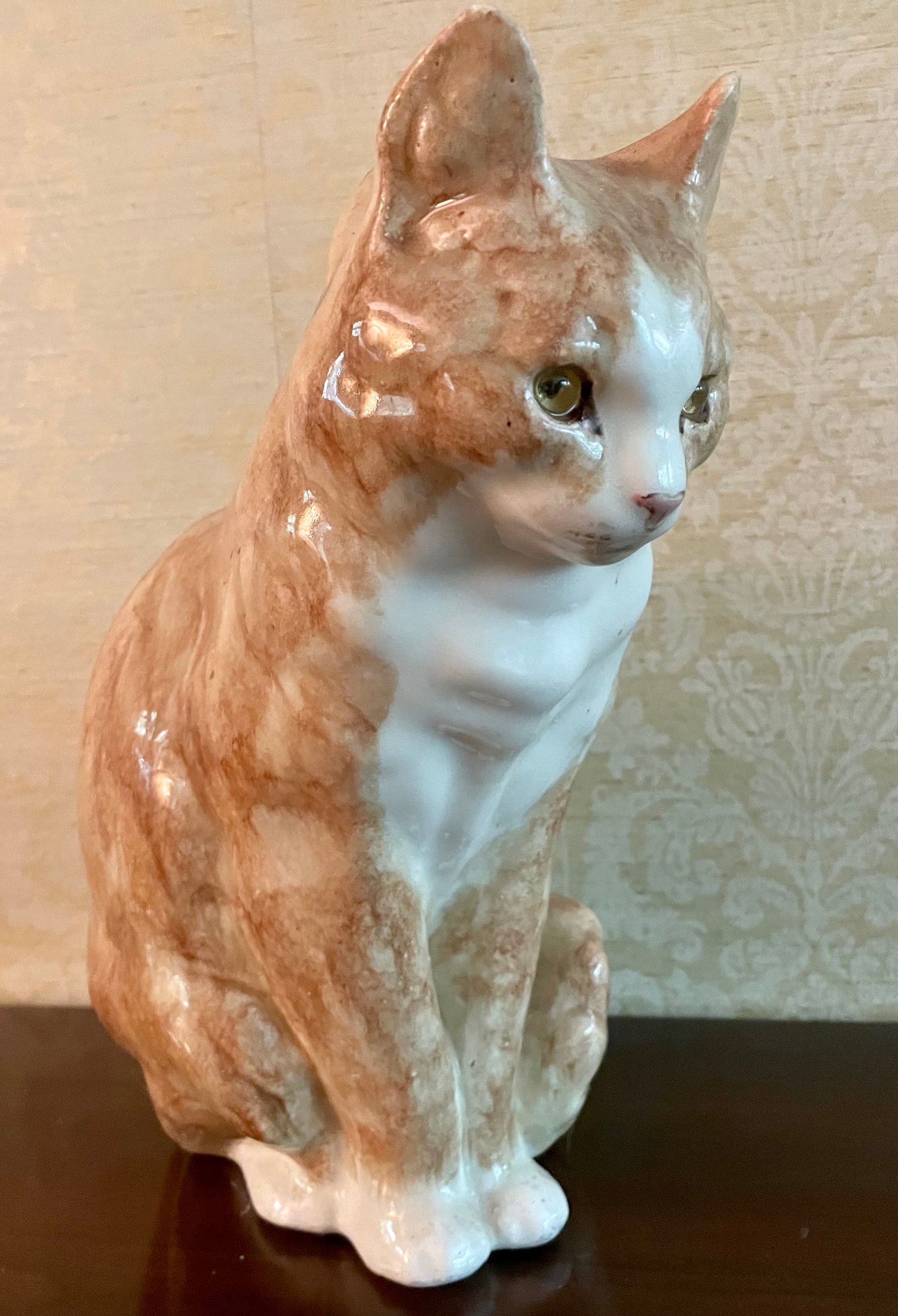 This lovely English glazed ceramic cat has beautiful glass eyes. It is 11 1/2" high by 11" long by 5" wide. It looks like a signature on the bottom but I don't recognize it. It is marked England. The cat is in excellent condition.