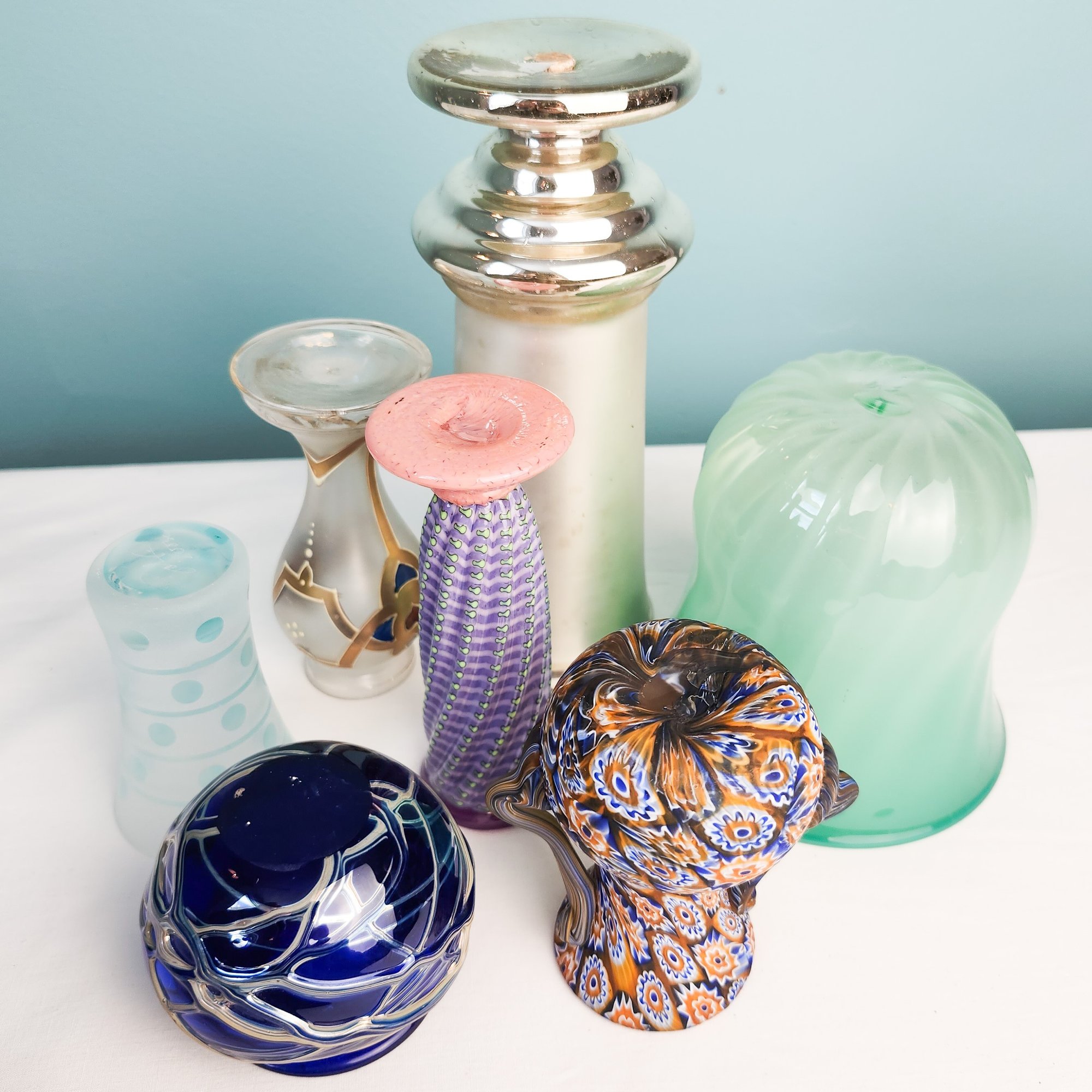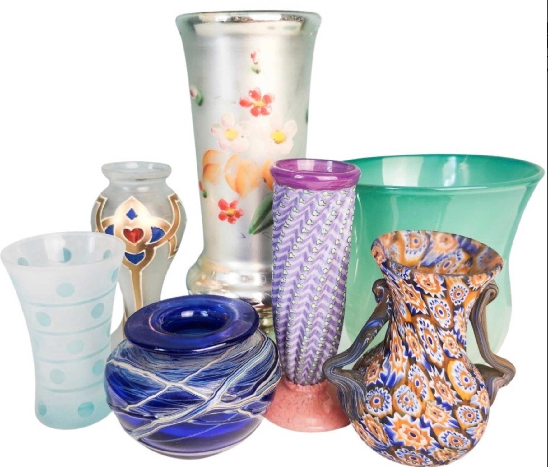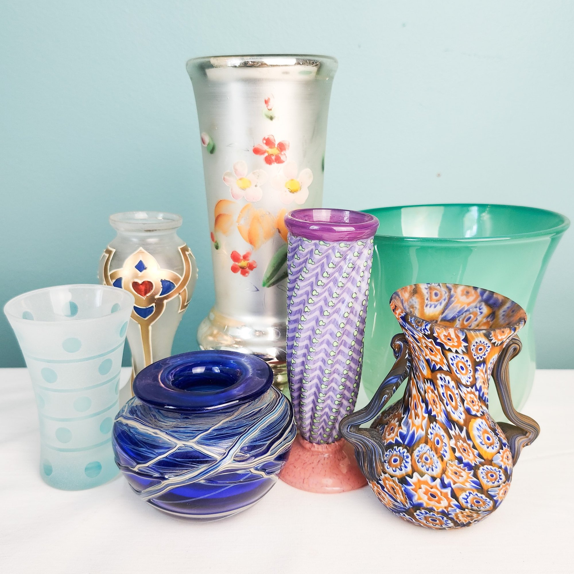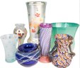 Seven pretty vases including two artist signed and one with paperwork about the artist.
