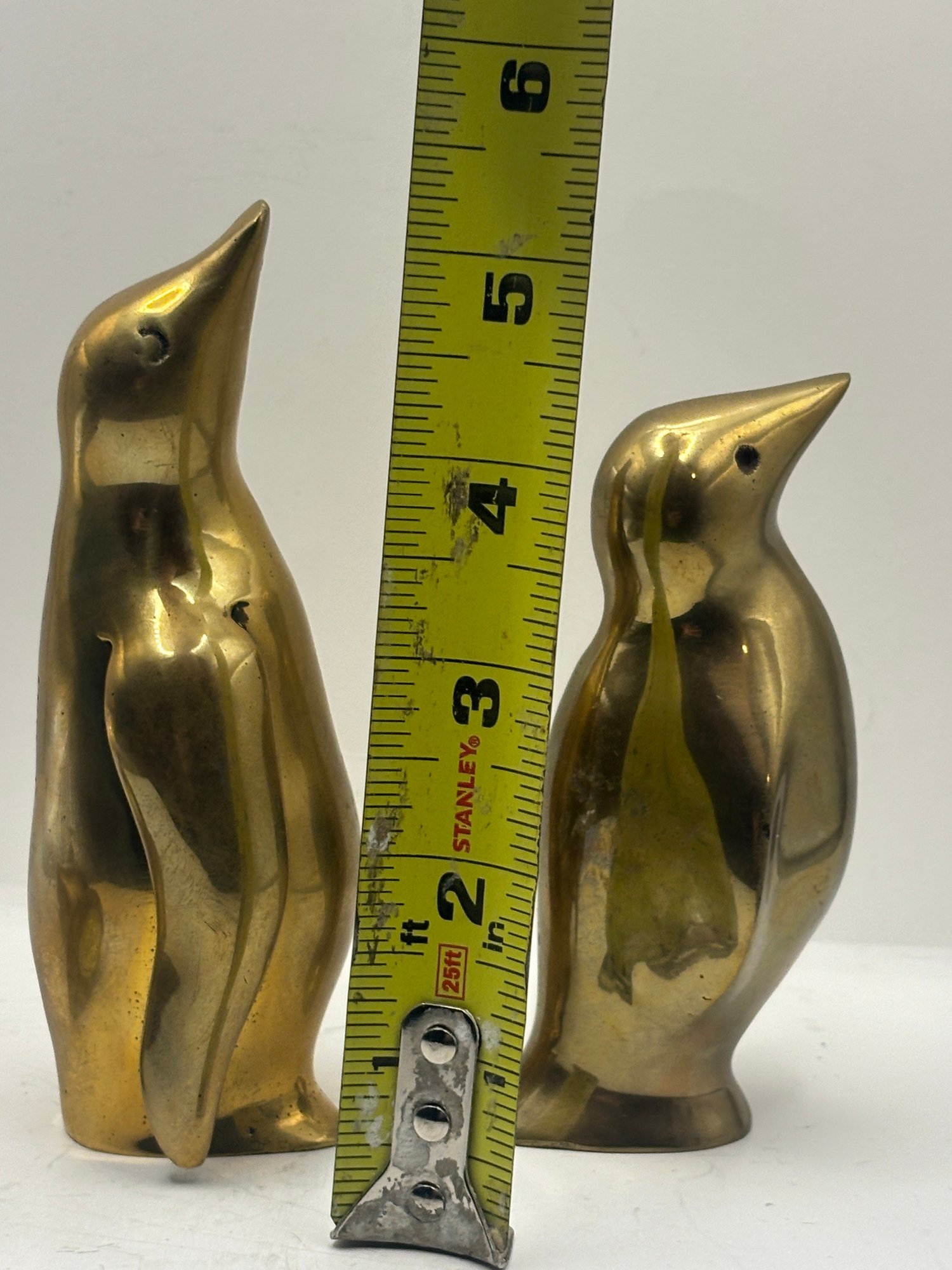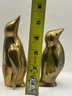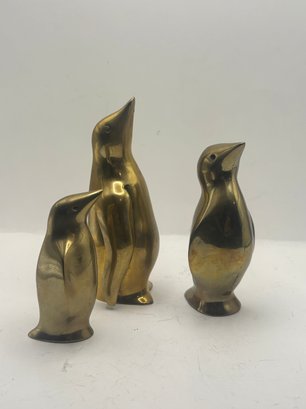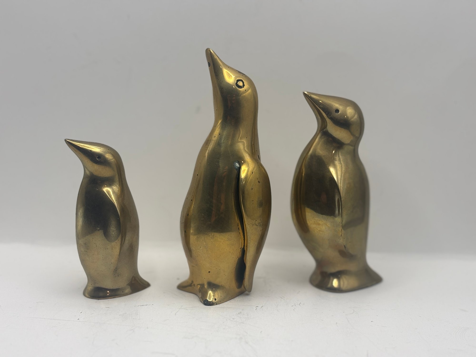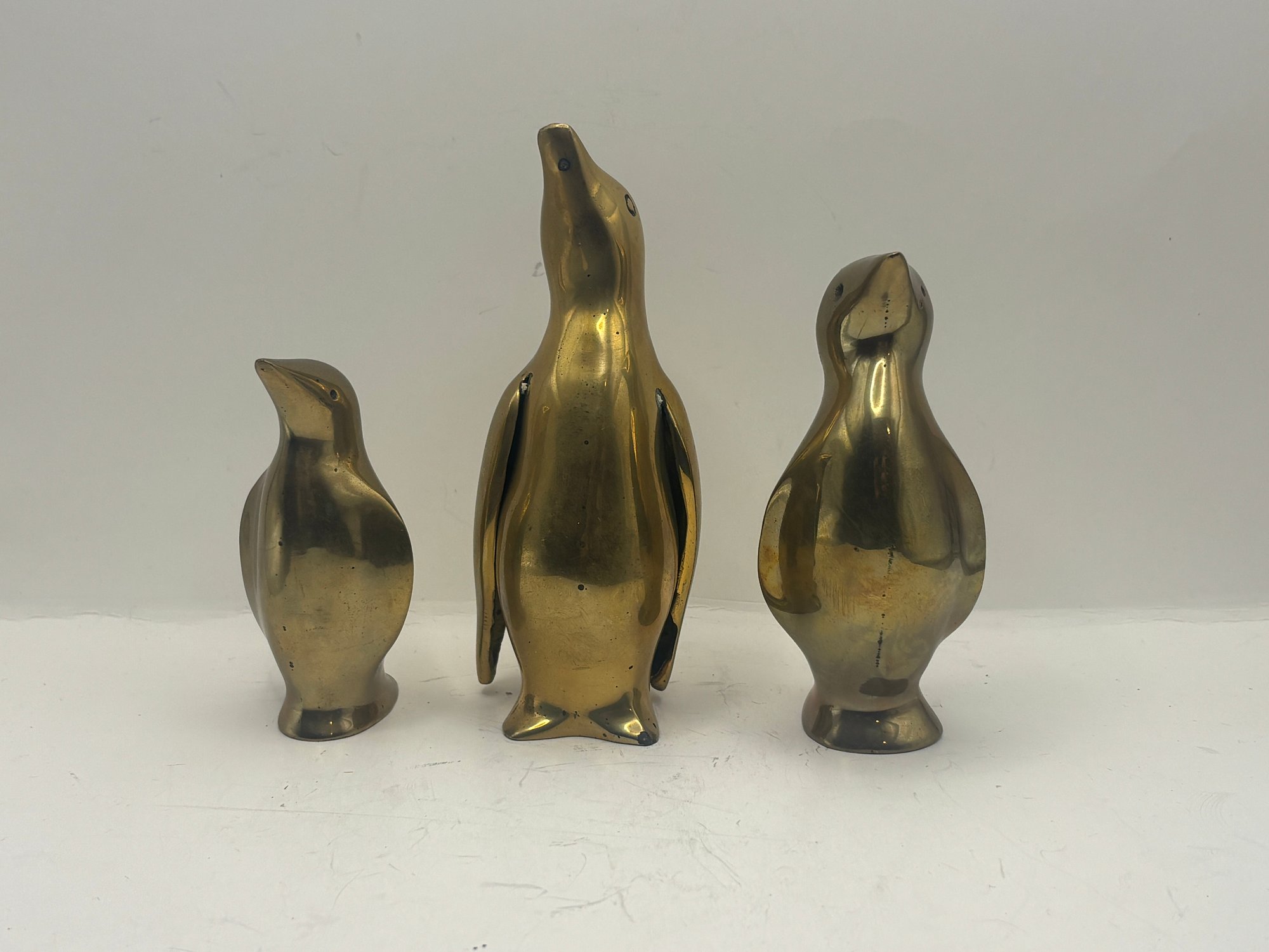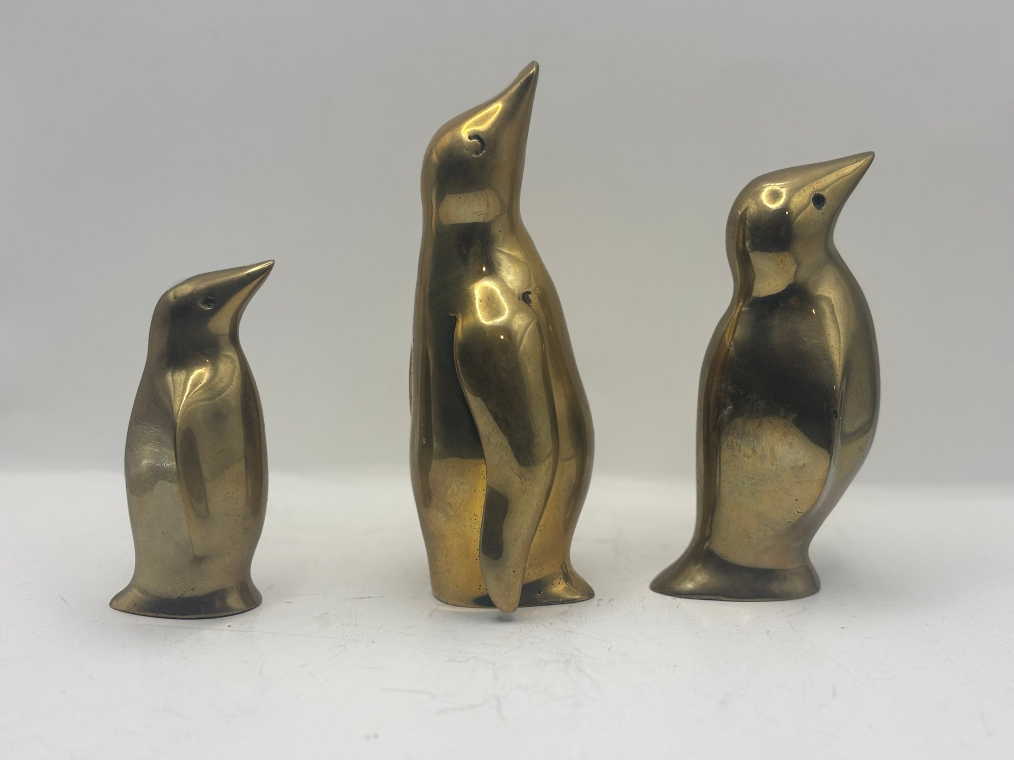 Charming trio of mid-century style solid brass penguin figurines with smooth, sculptural silhouettes and warm golden patina. Each figure features subtly different proportions, creating an appealing graduated display when grouped together. One retains its original Graduates Inc., San Francisco foil label noting solid brass and handcrafted production. A delightful decorative set for shelves, desks, or curated vignette displays, blending playful character with classic modern form.