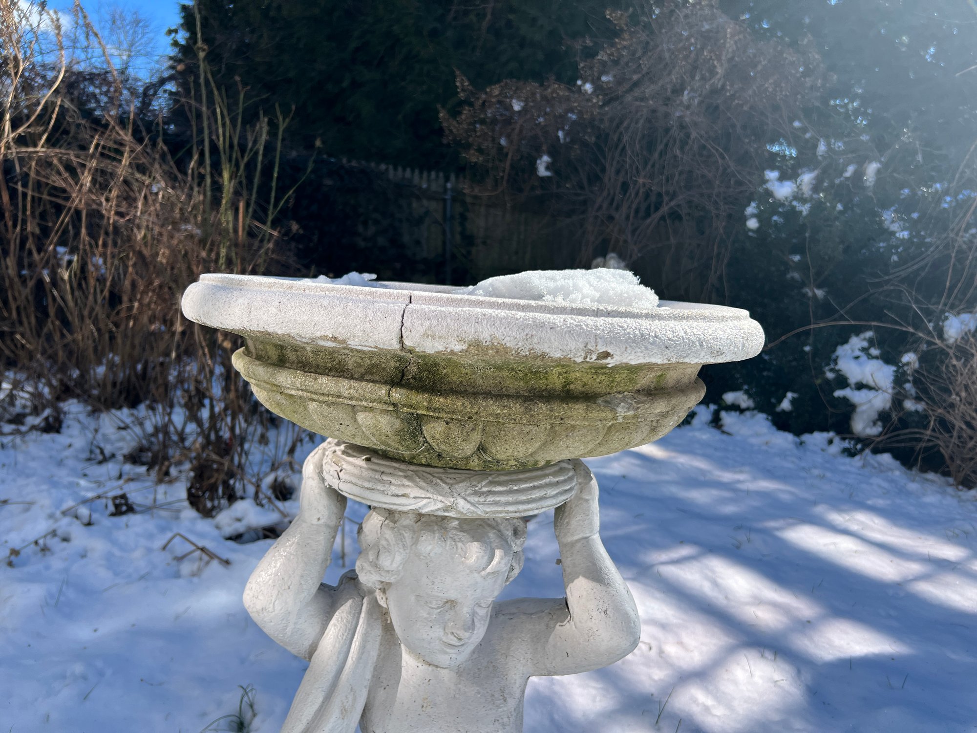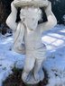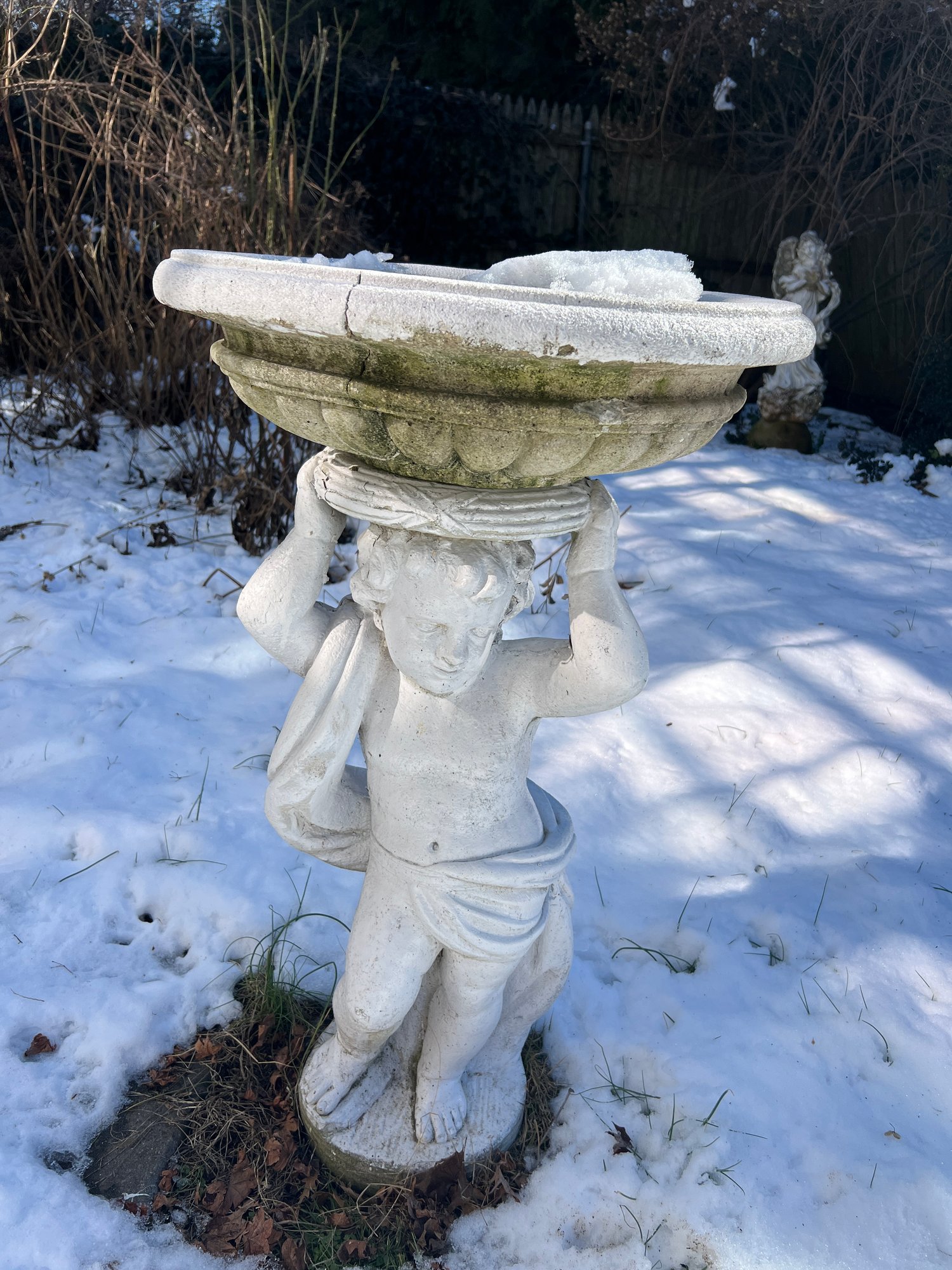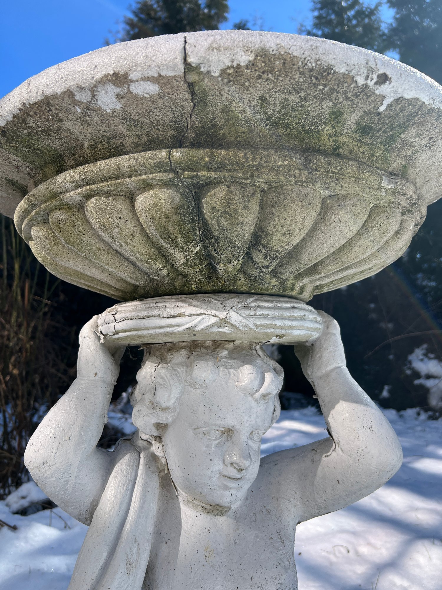 Concrete bird bath with a base in the form of a cherub bearing the bath basin on his head.
