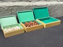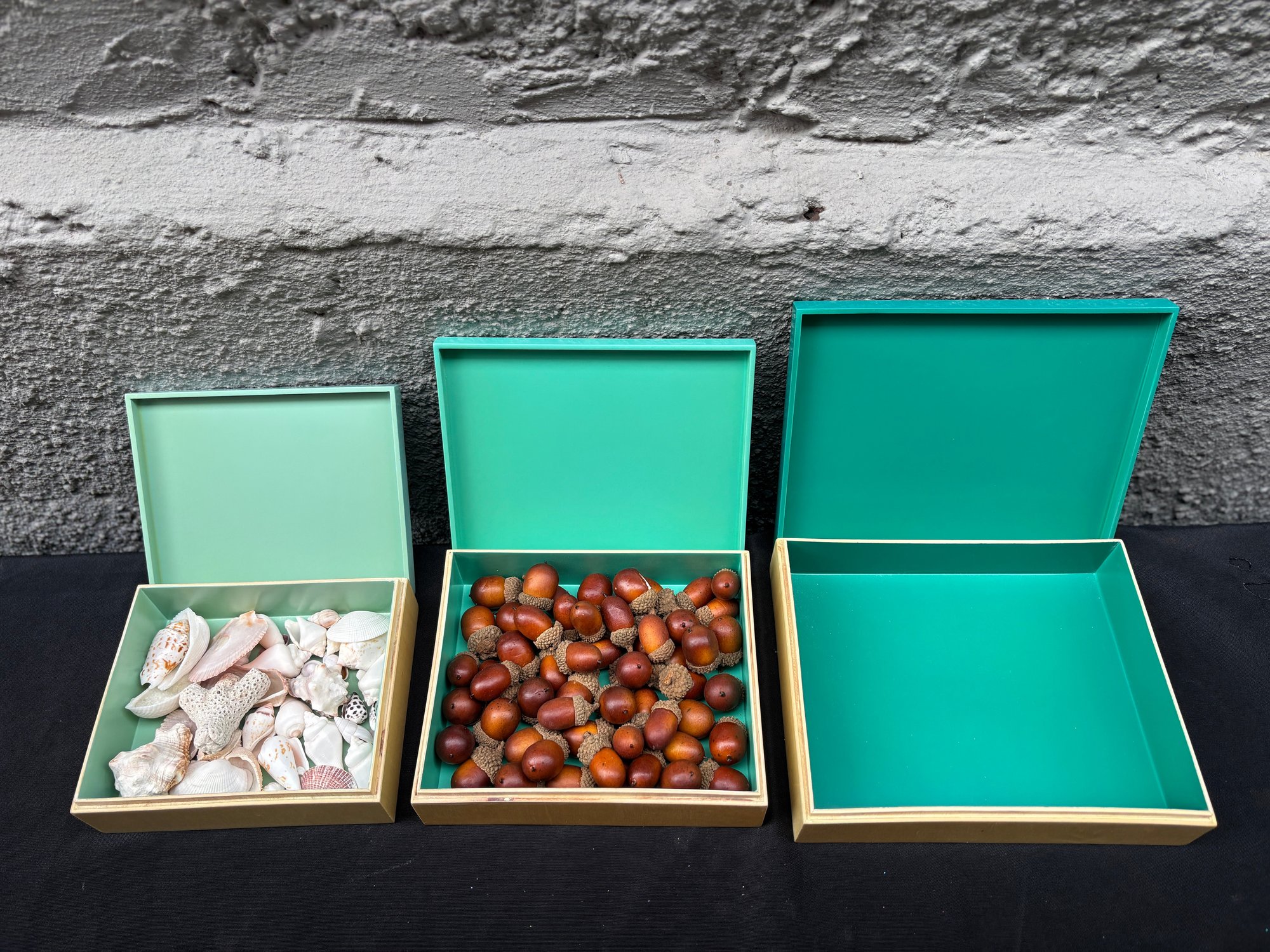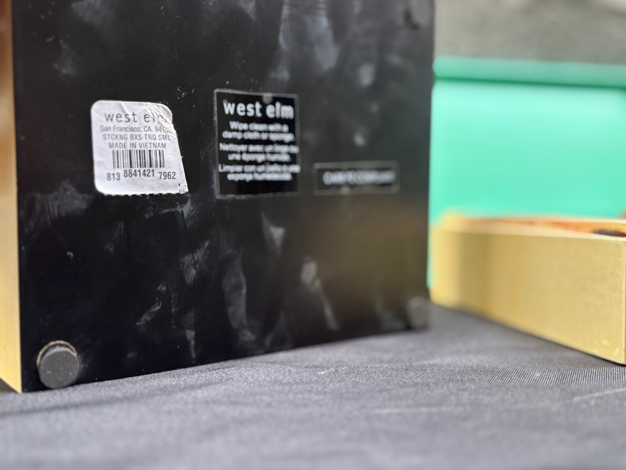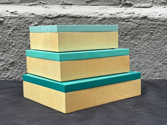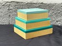 Striking set of three West Elm decorative boxes featuring a crisp turquoise interior paired with brushed gold-toned exteriors. Designed to nest neatly when stacked and shine individually when styled, these boxes walk the line between modern decor and practical storage. Perfect for jewelry, desk essentials, keepsakes, or simply adding a pop of color and polish to a shelf, coffee table, or console. Clean lines, bold color, and that unmistakable West Elm look make this a versatile accent set that plays well in contemporary, mid-century, or eclectic interiors.