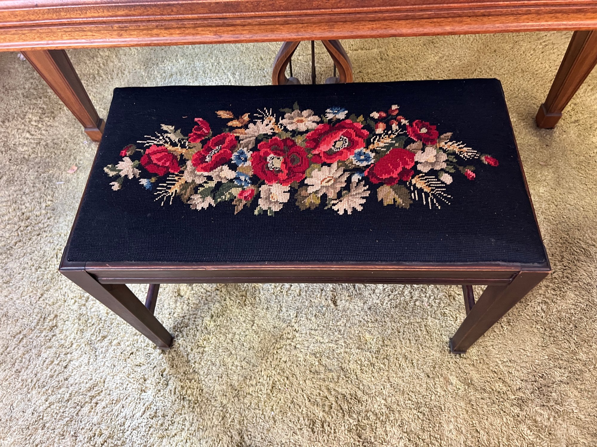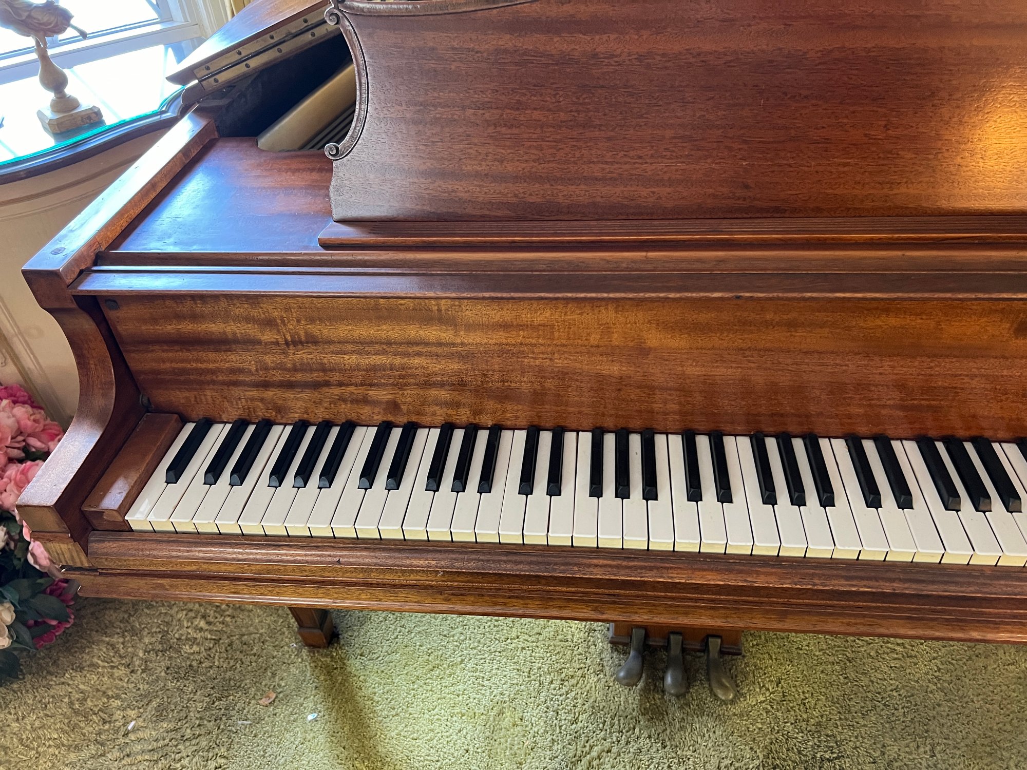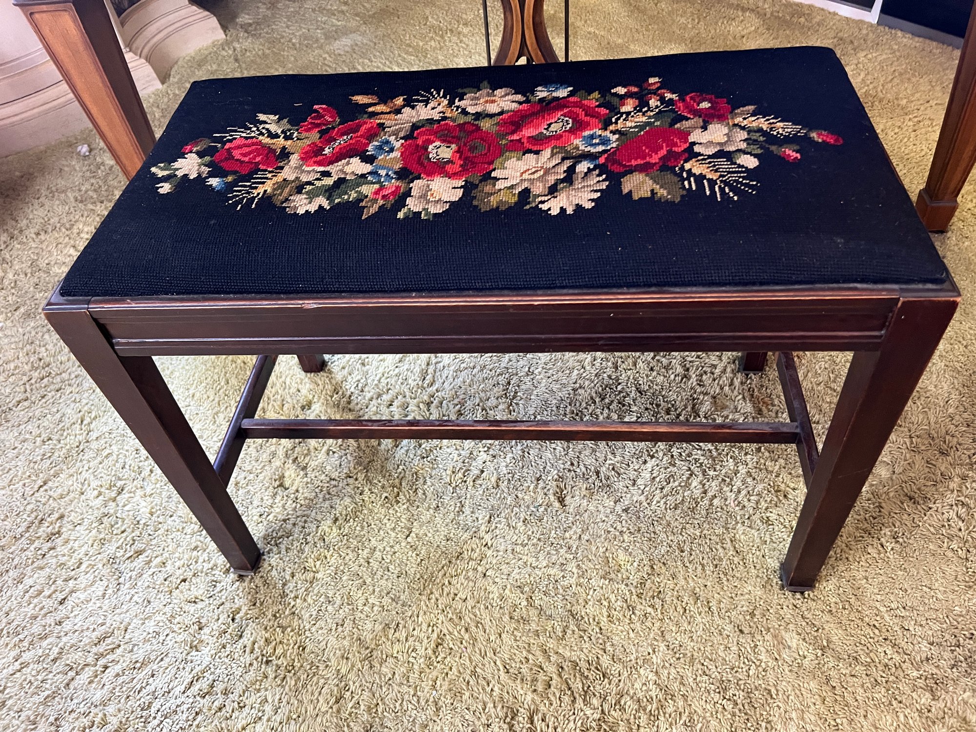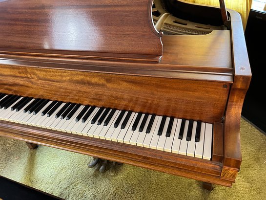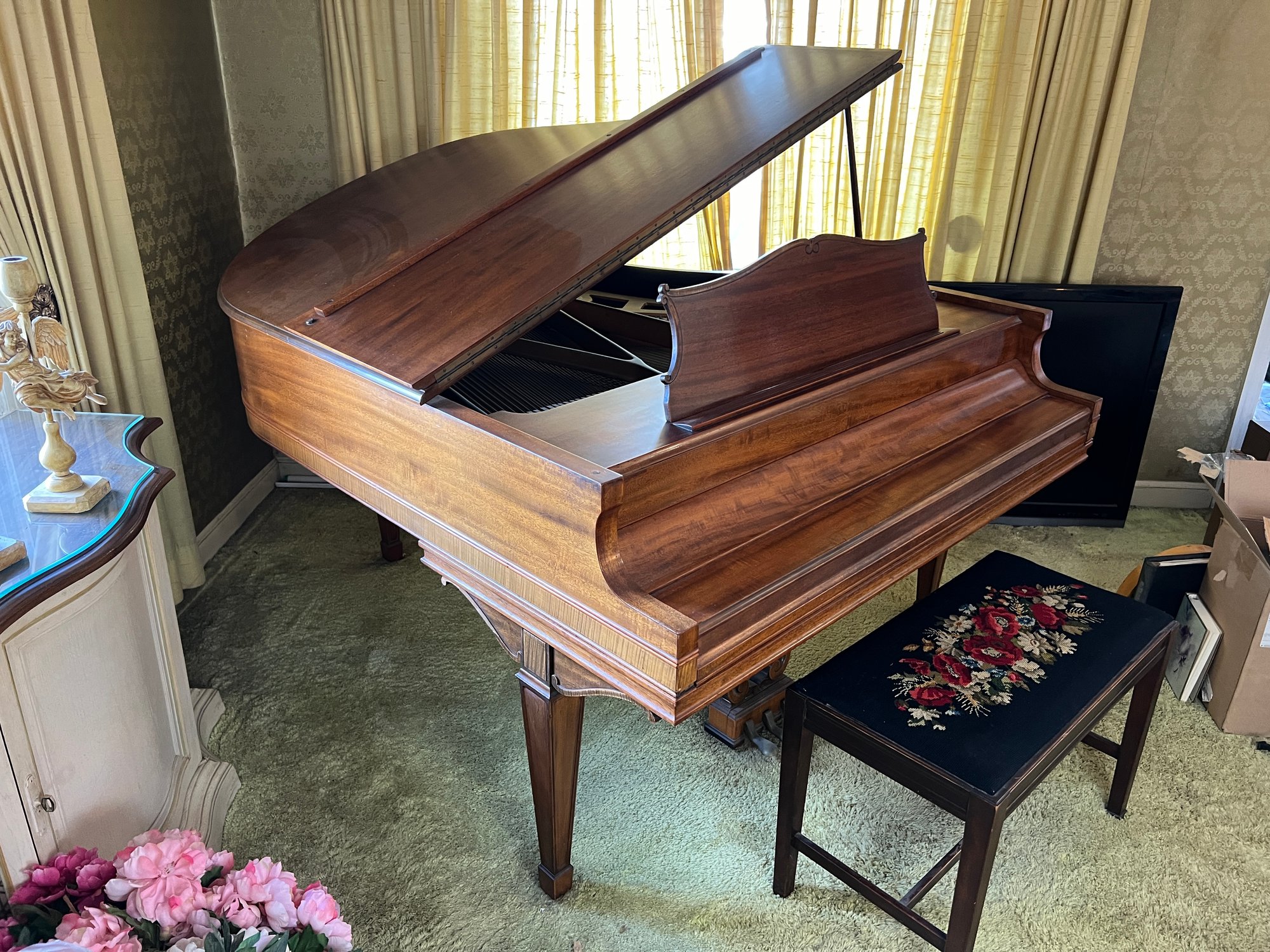 Stunning nicely refinished and well-cared-for antique Chickering baby grand piano with a floral embroidered bench. The ivory keys of this piano have been replaced with modern ones.