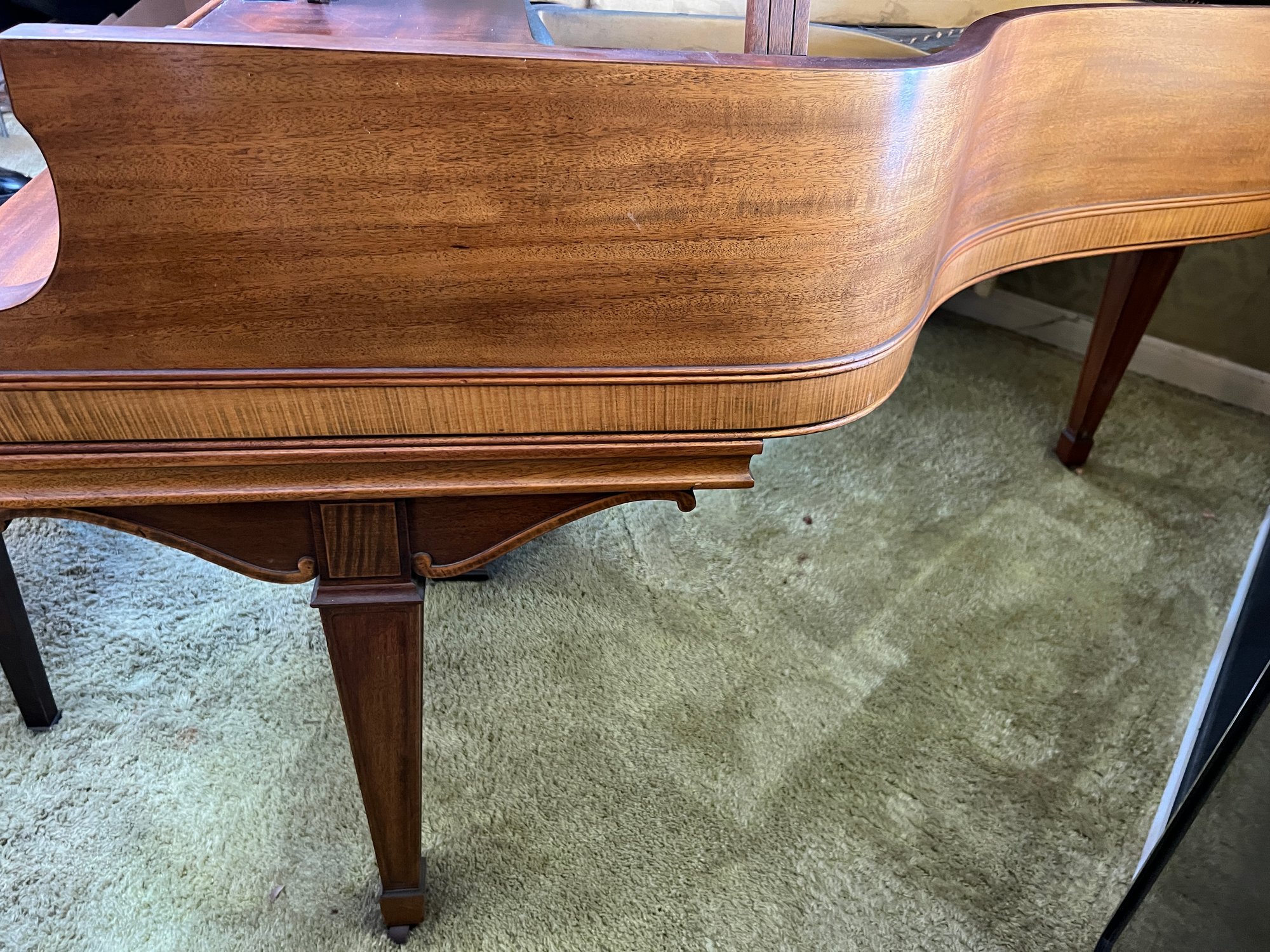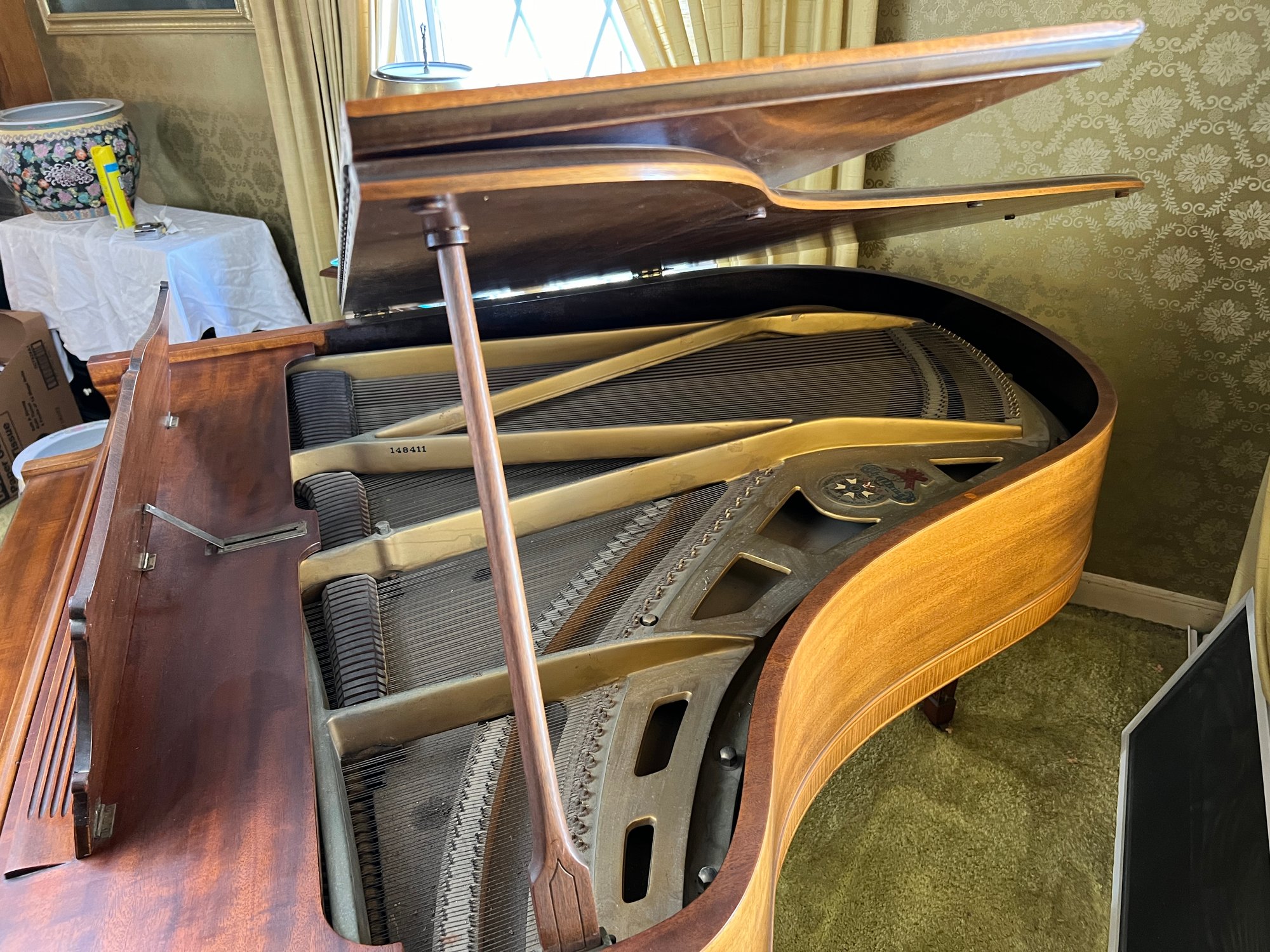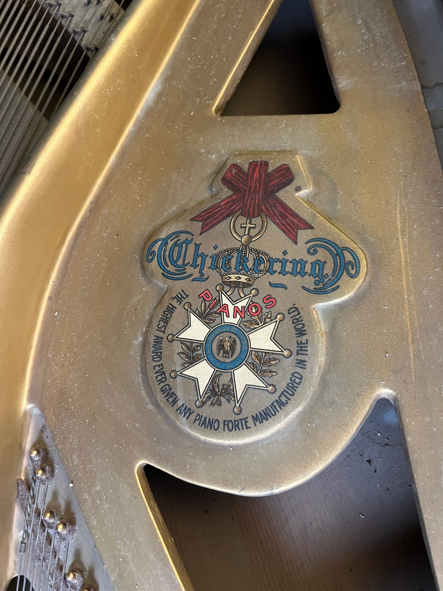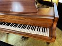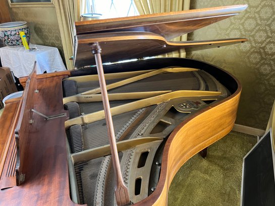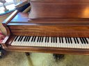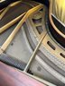 Stunning nicely refinished and well-cared-for antique Chickering baby grand piano with a floral embroidered bench. The ivory keys of this piano have been replaced with modern ones.