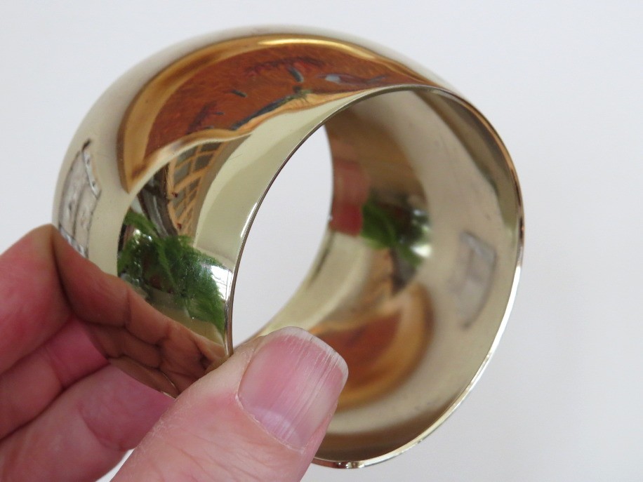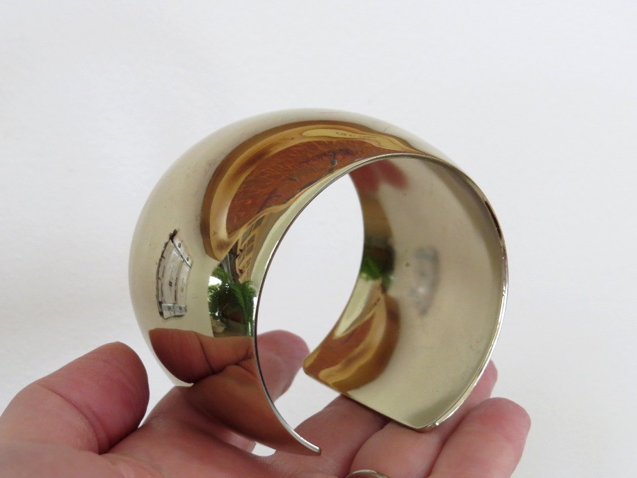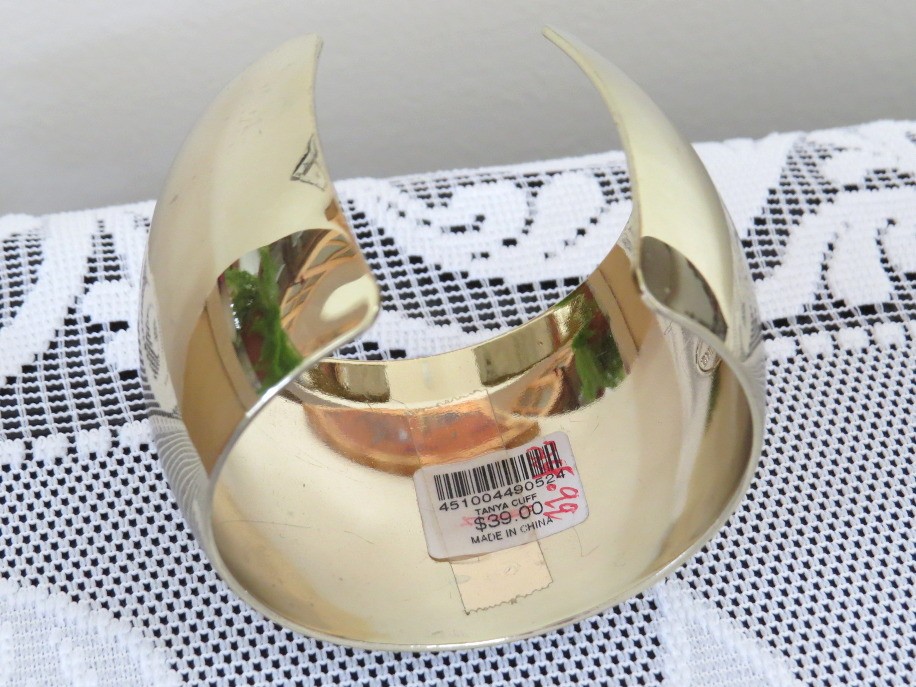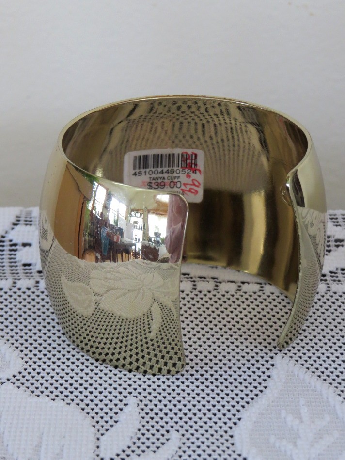 This cuff bracelet by Chico's is sure to be a statement piece in your wardrobe. Shiny gold tone finish will blend well with other metals for a mixed look or alone for that wow factor. Measures 2" wide with an interior diameter of 2 3/8" and an opening of approximately 1". Marked Chico's on the inside of the bracelet. Very challenging to get good photos as is reflects everything. There is a 1/2" scratch on the top of the bracelet, see photo.
