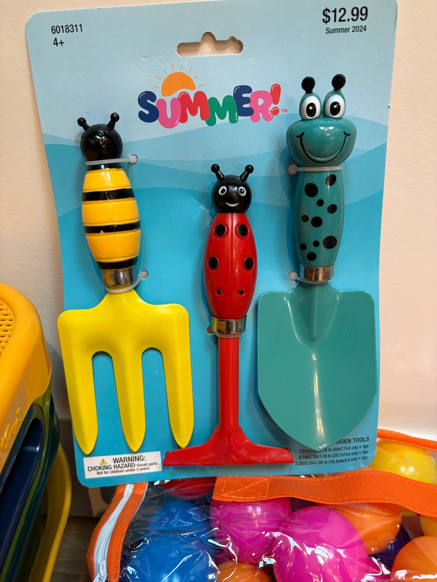 Quality beach pail with 20 pieces, two bags filled with light-weight colorful balls and some garden or beach hand tools.