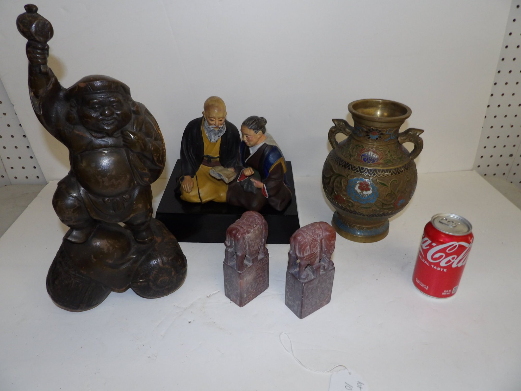 Cloisonné urn, bronze happy Buddha, Japanese family group on wood base, two carved hardstone seals