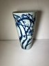 Cylindrical Chinese vase in white porcelain with blue brushstroke design with cherry blossoms and birds.