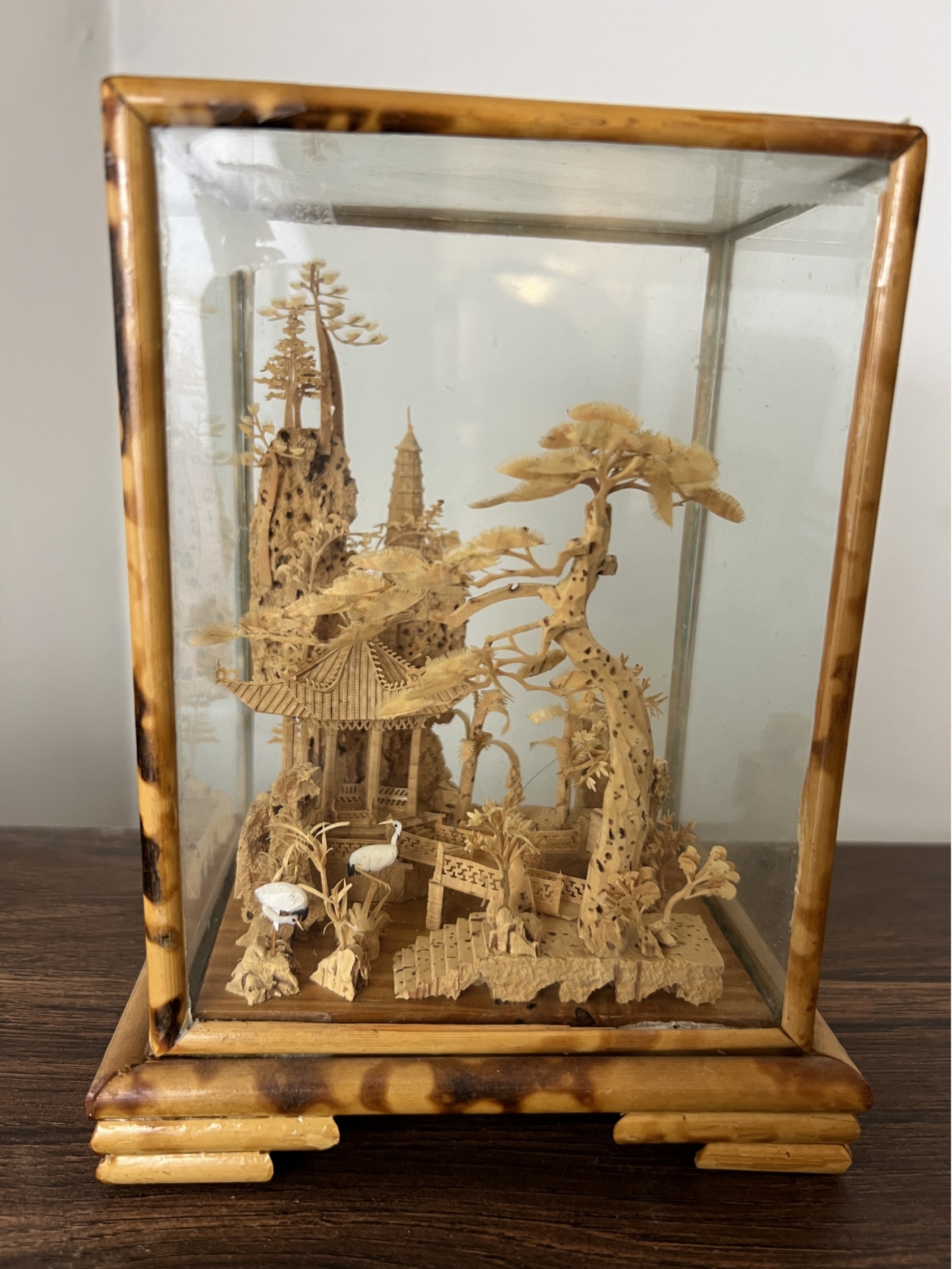 Intriguing Chinese carved cork diorama in a glass and tortoiseshell bamboo case.