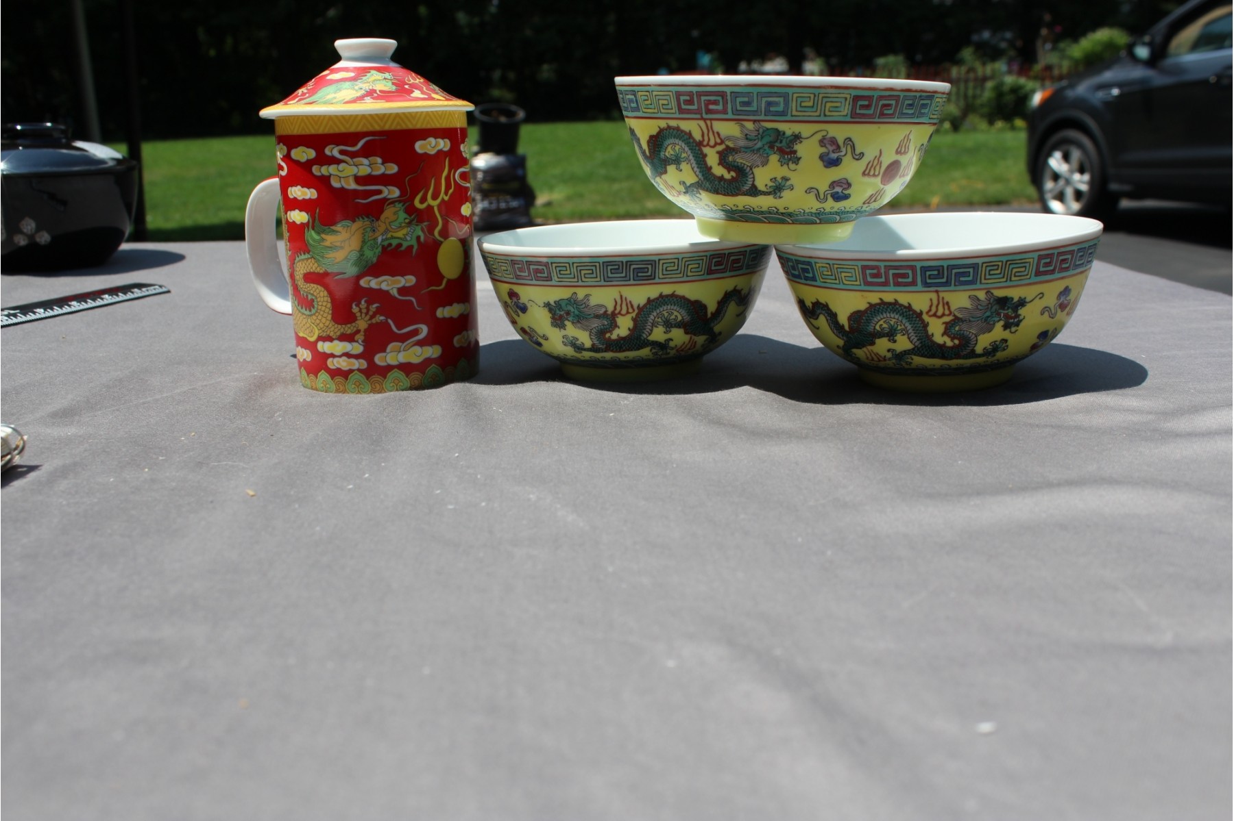 Great lot for the Year of the Dragon in 2024. 3 Rice bowls with great enamel work and gorgeous Red based glaze and work on the teacup.