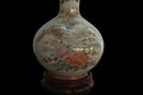 Hand decorated in bold florals with gold accents. Wooden base