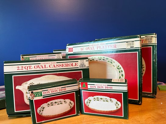 prices on these boxes would be pre l999. Includes: 2 bon, bon dishes; 2.2 qt. lidded casserole; vegetable bowl, 14" oval platter, 12 pc. dinner set; 4 soup bowls; tiered server.