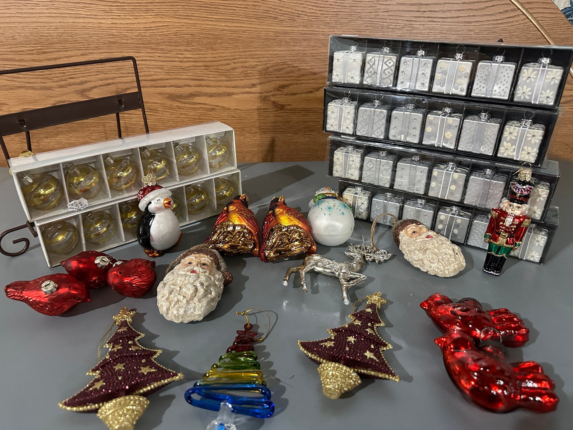 3 cardinals; 2 santas, penguin, 2 glass cardinals; snowman; soldier, 3 trees, 4 boxes of 6 each silver ornaments; 2 boxes 6 each gold balls