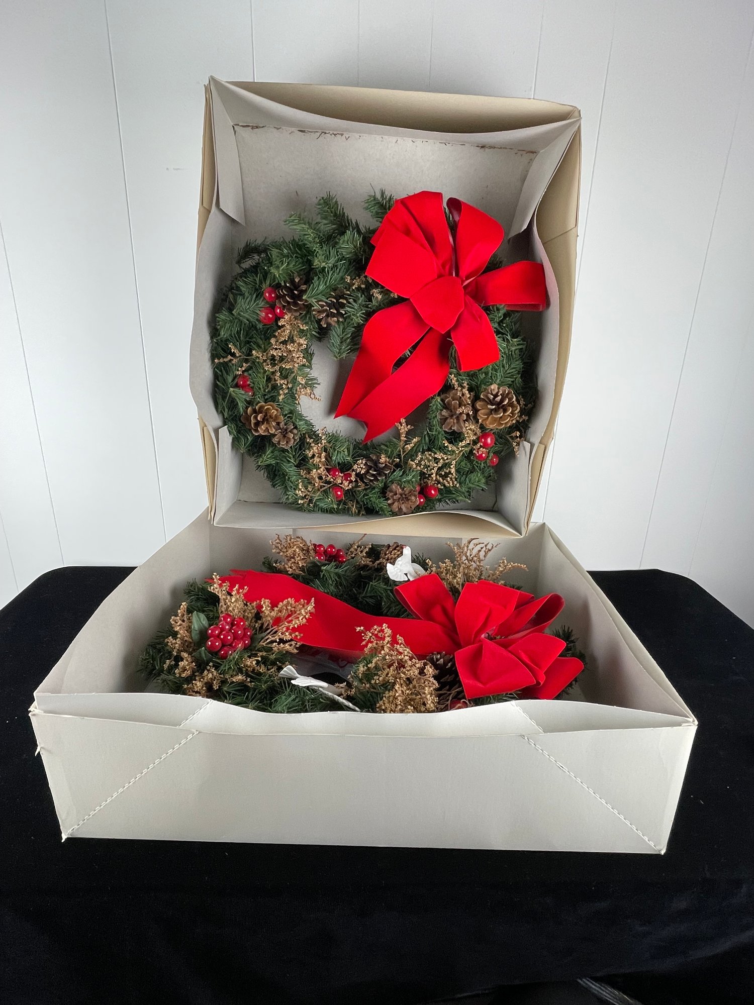 Two wreaths in set. Christmas holiday designed wreaths. Boxes included. No damages seen in images. See photos for more conditions and sizing.