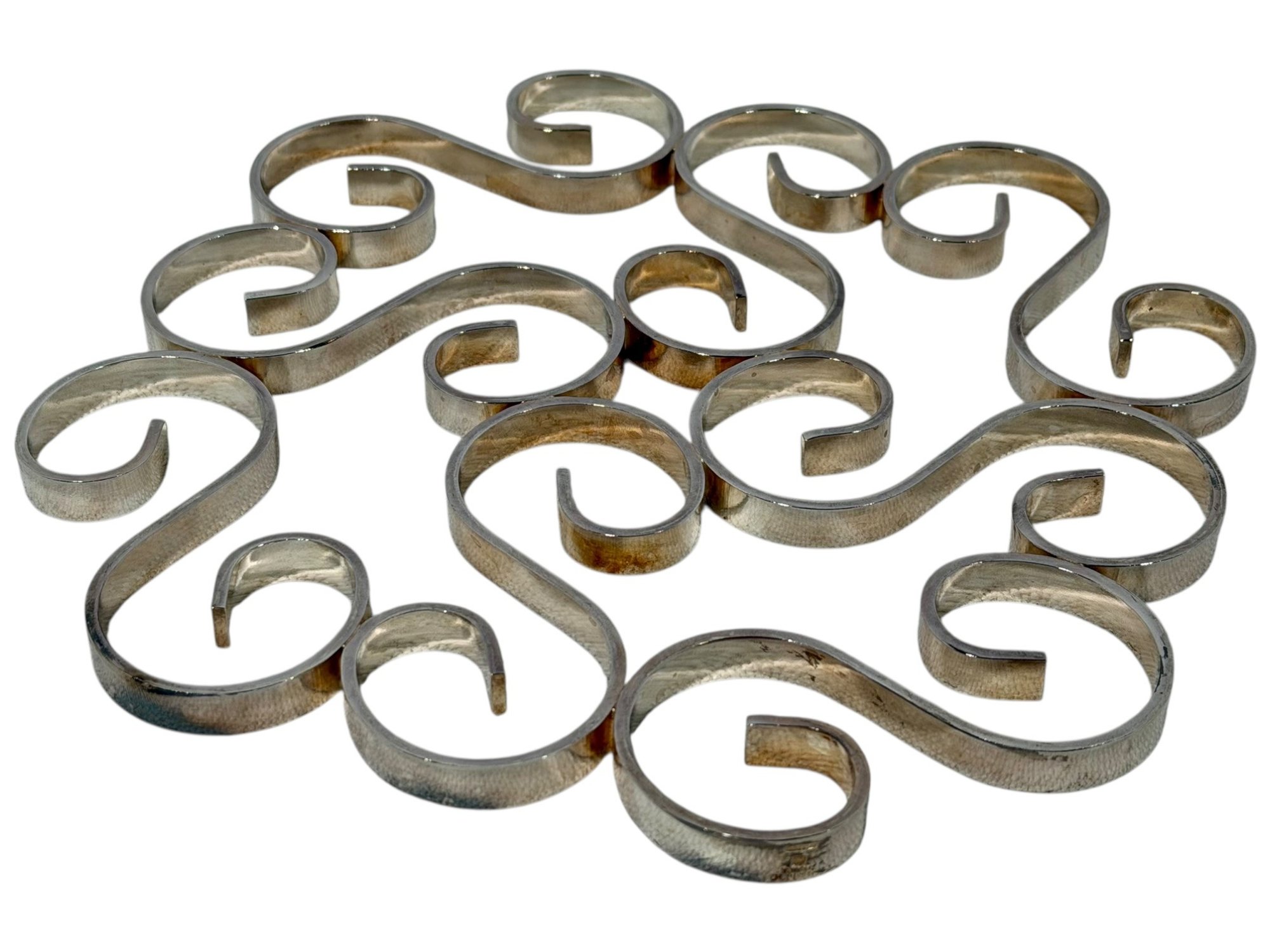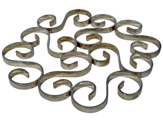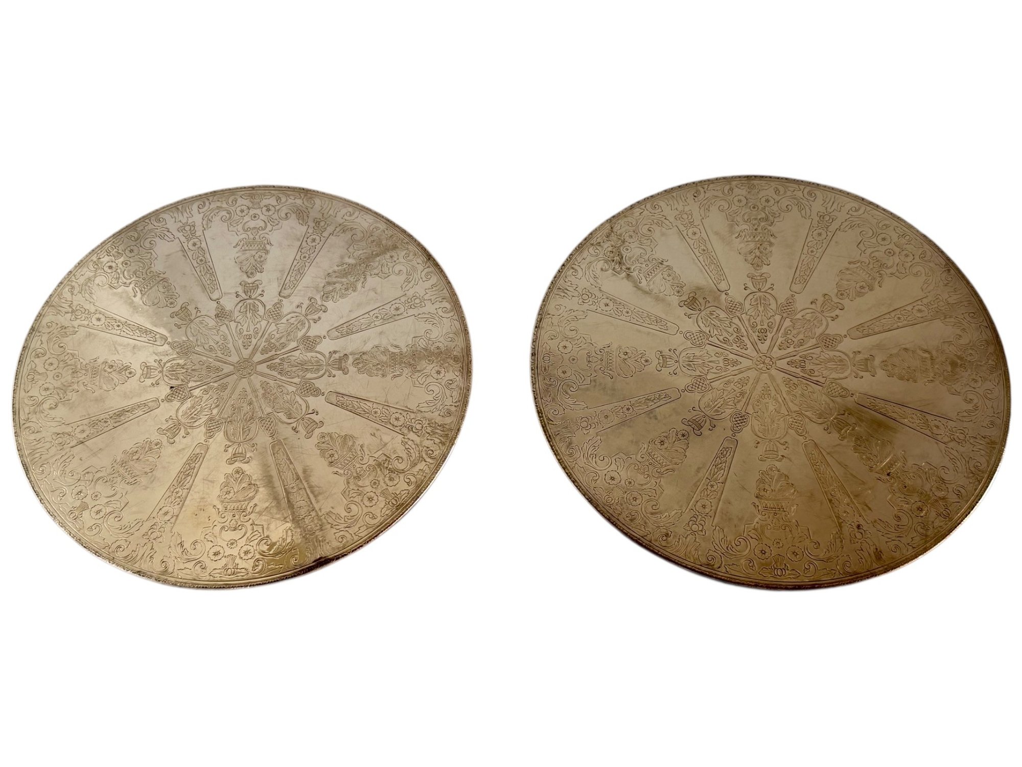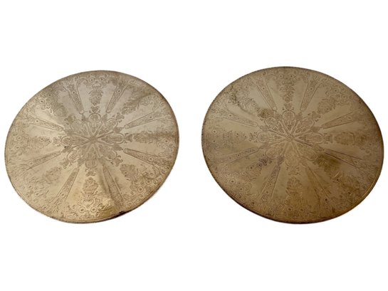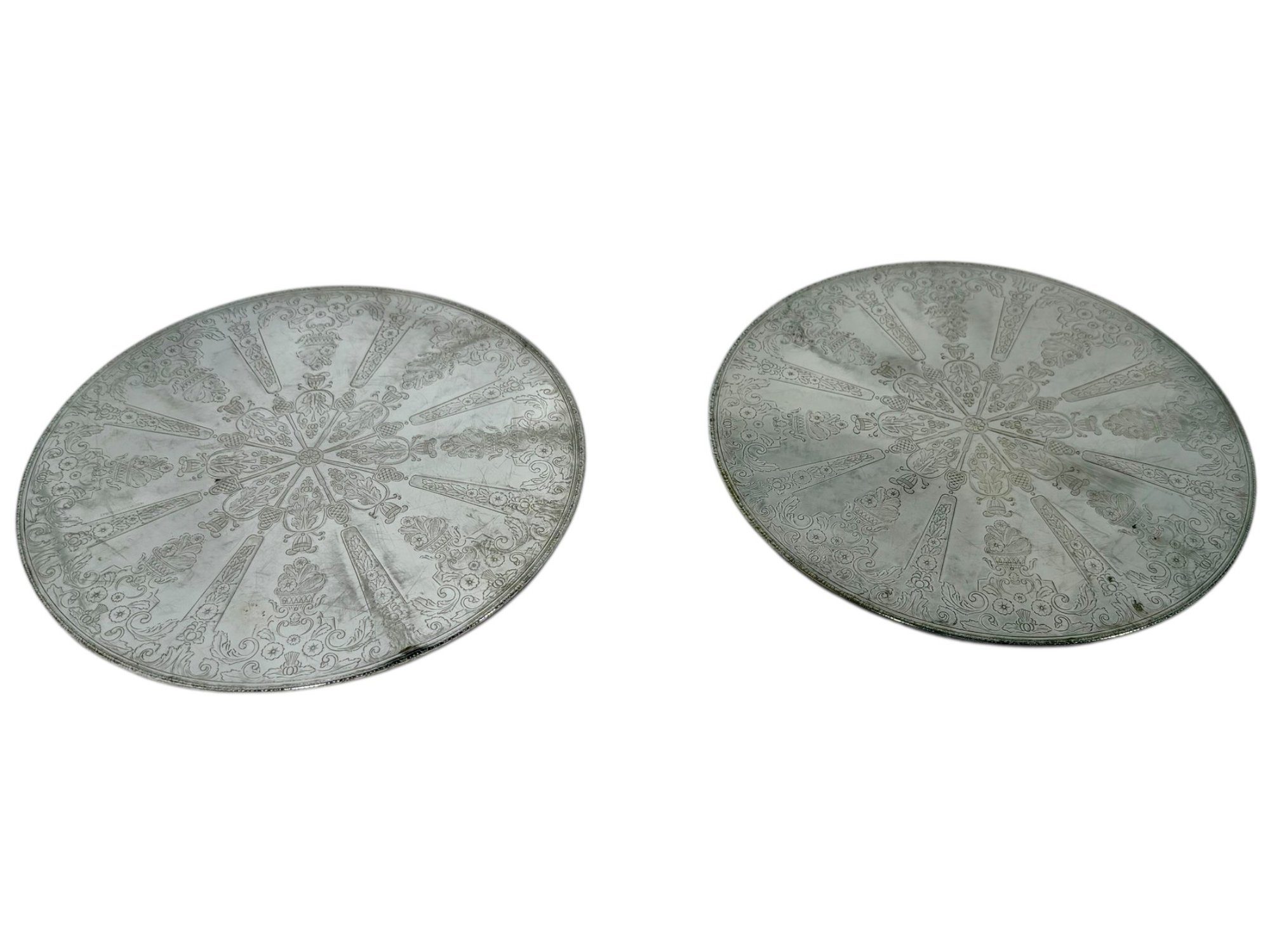 The ethed floral and filigree design ones are round and measure 8 3/4" in diameter. Larger scroll is 8 1/2"L x 8 1/2"D.