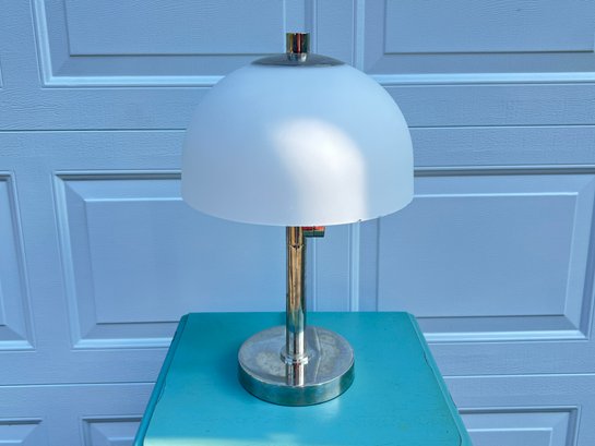 I'm not sure how old this is but it has a great look. Chrome needs cleaning, is dirty. 13" diameter, 20" height.