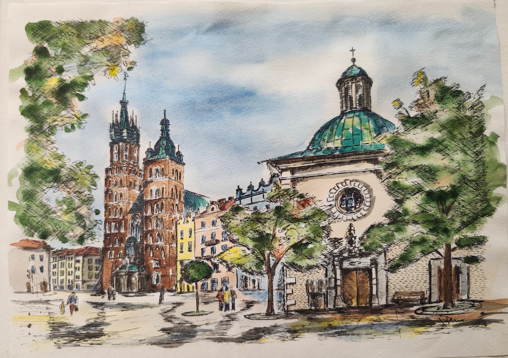 Ink Pen & Watercolor of Church of St. Adalbert in Poland.