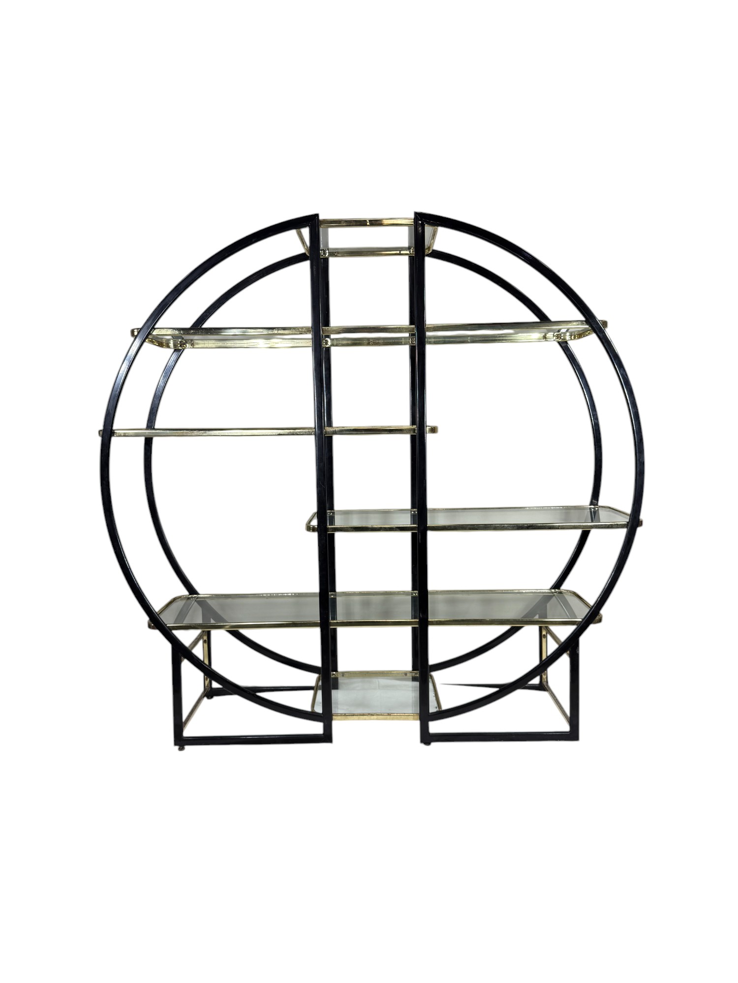 Shows chips on a few of the shelf ends, some wear to the black and brass finish.