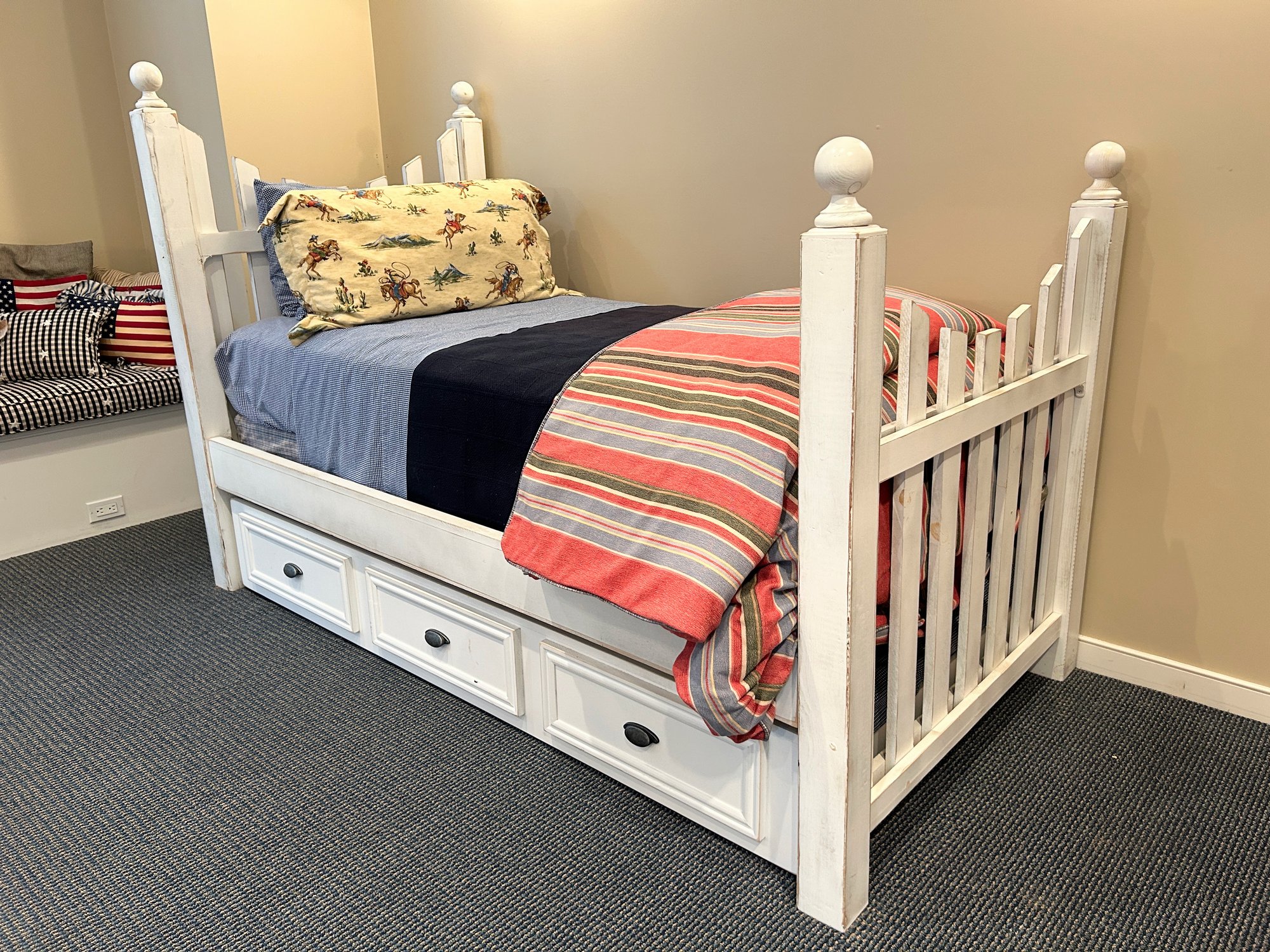 Rustic white painted pine. Trundle mattress included. No other mattress. Custom Coverlet included.
