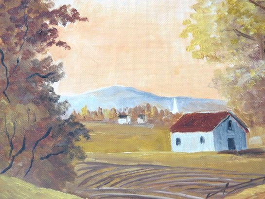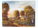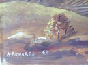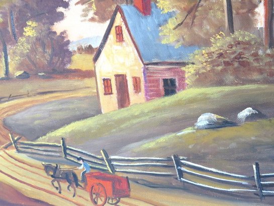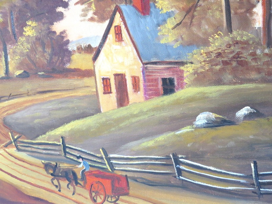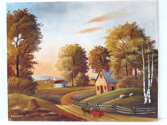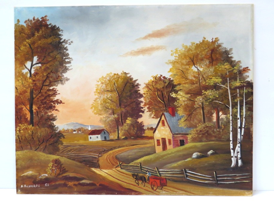 Beautiful classic country road scene oil on board painting with warm autumnal colors that really capture some of the unexpected beauty of New England. Signed by A. Richards (Arthur A. Richards), 1962. Measures 16" X 20". There are 3 additional painting in this auction from this artist.