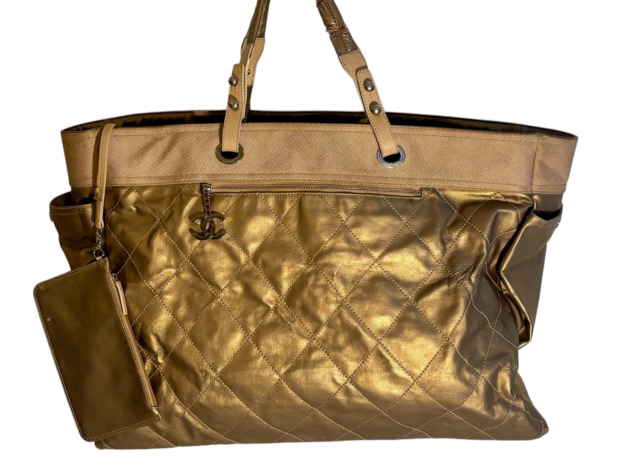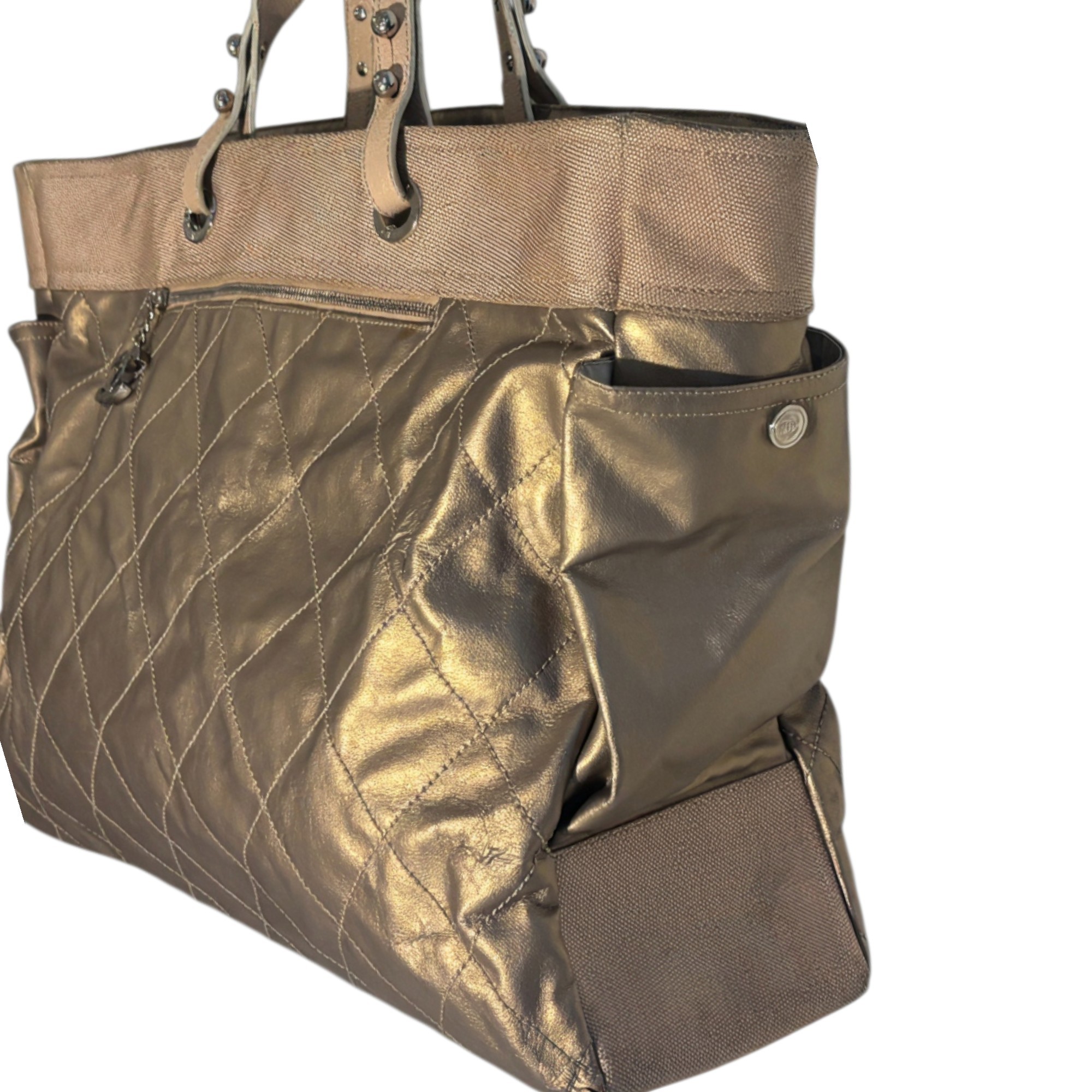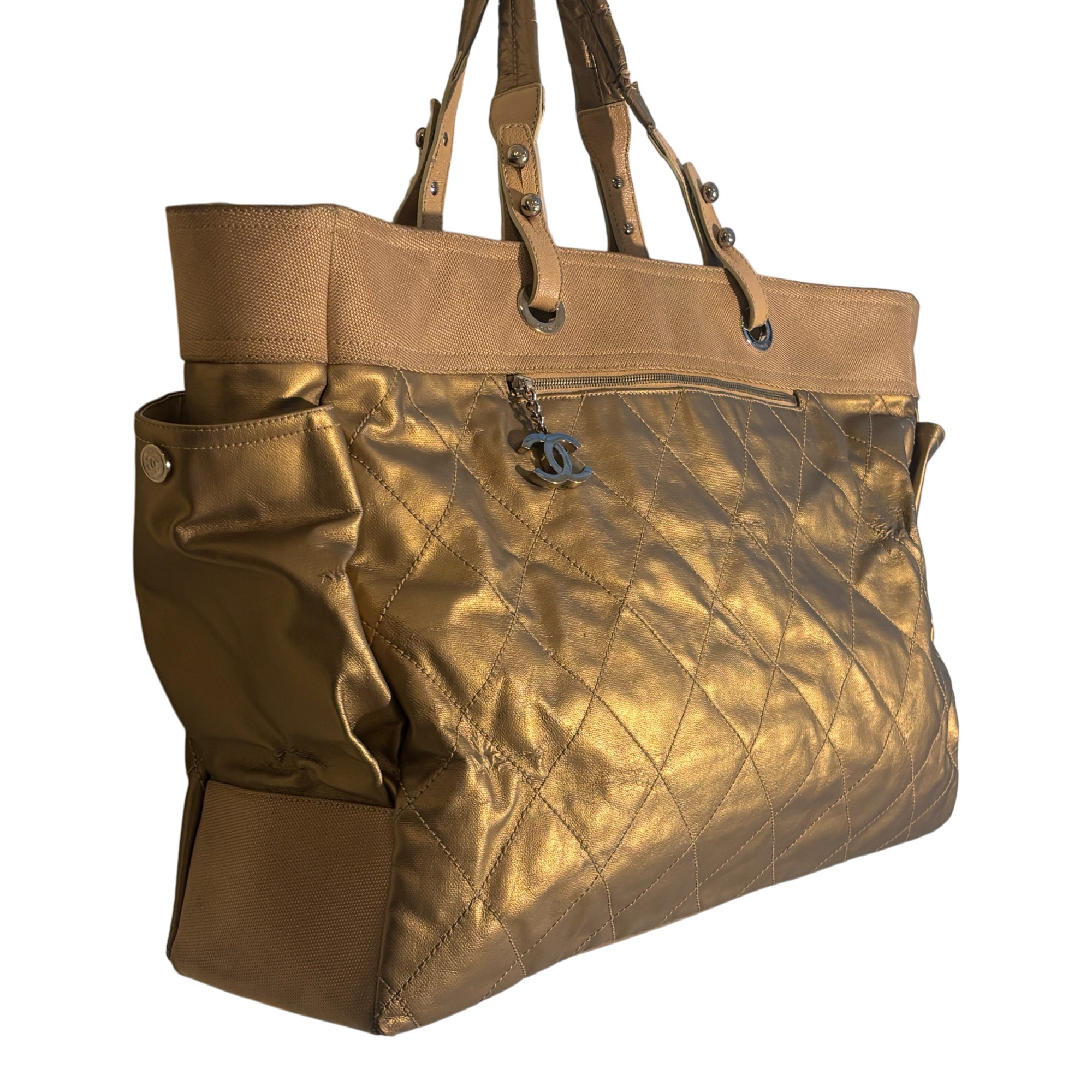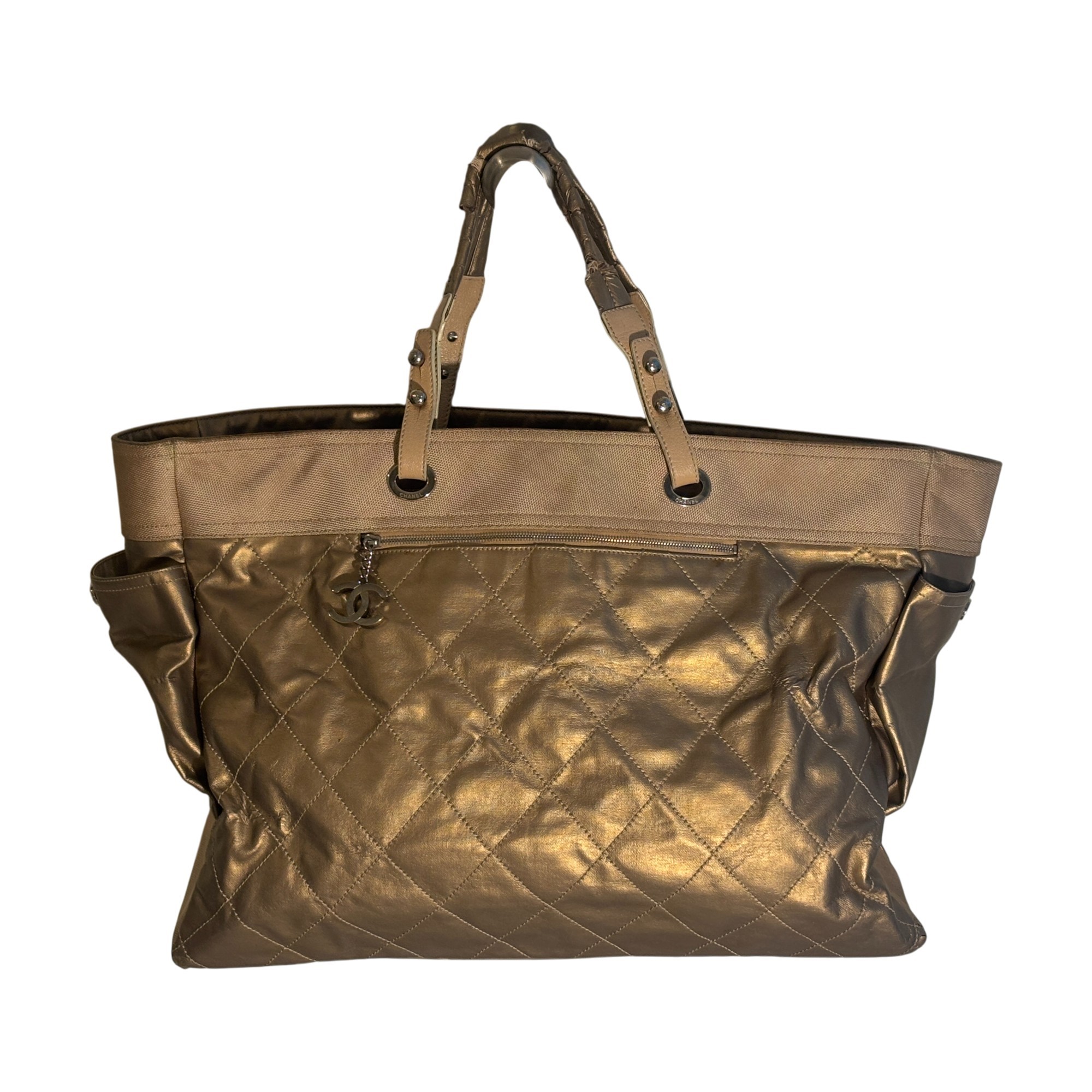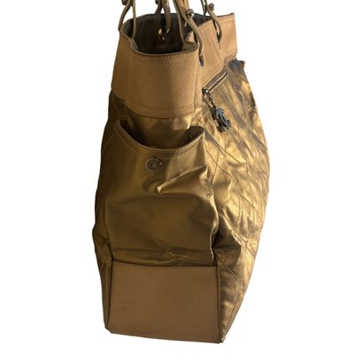 Bold, luminous, and unapologetically Chanel. This metallic gold quilted tote brings high-glam energy with diamond-stitched leather panels, canvas upper trim, leather shoulder straps with grommet hardware, and a dangling CC charm at the exterior zip pocket. The metallic finish catches light beautifully, giving the bag that liquid-gold look collectors love.