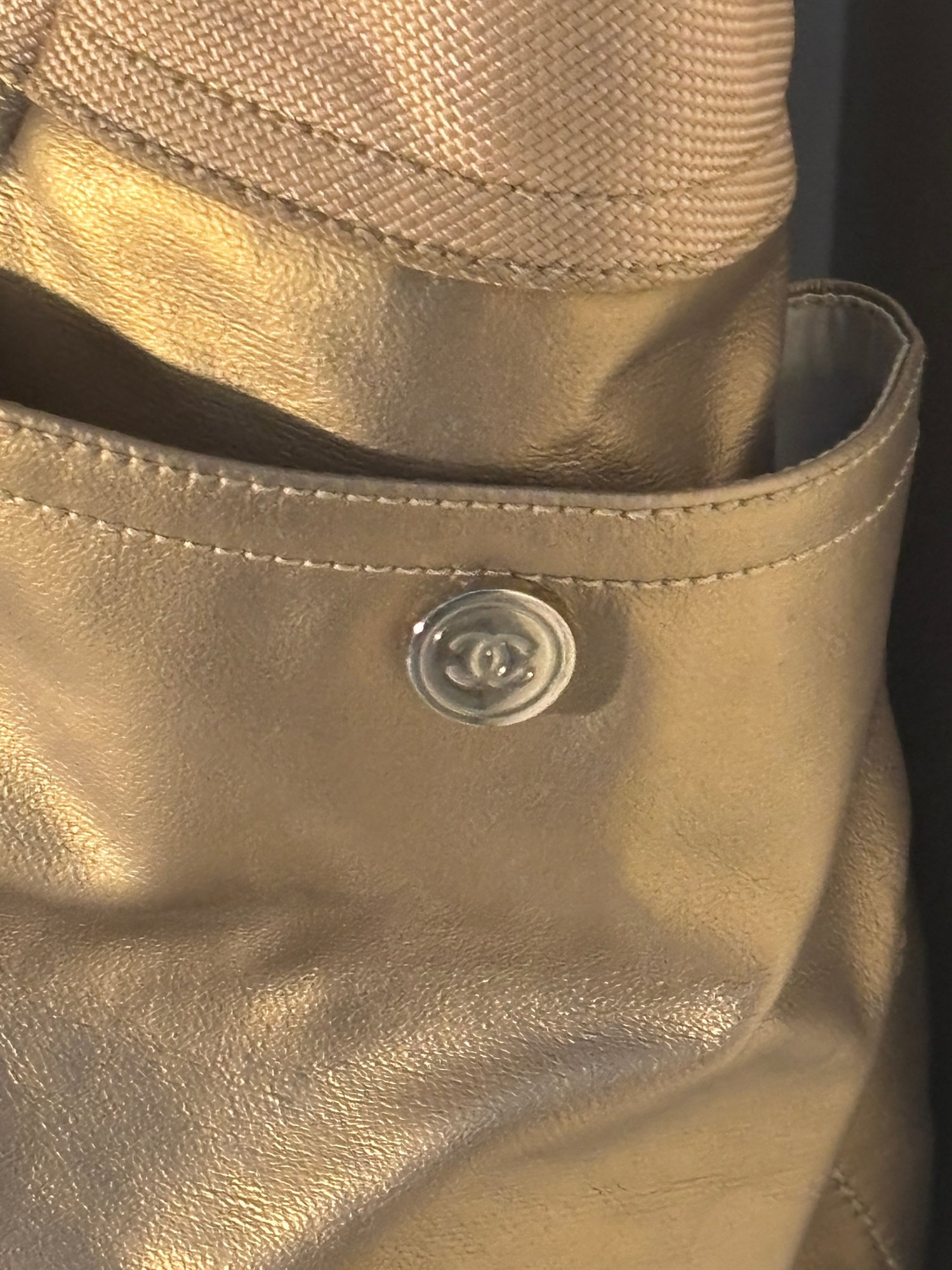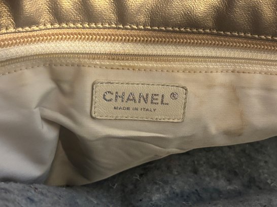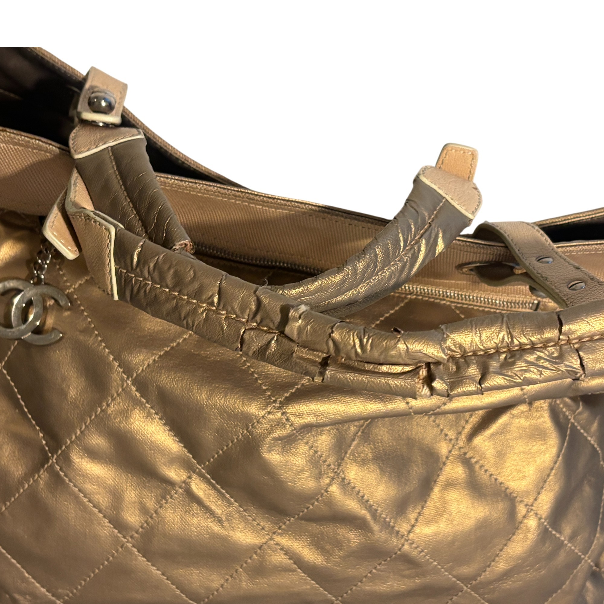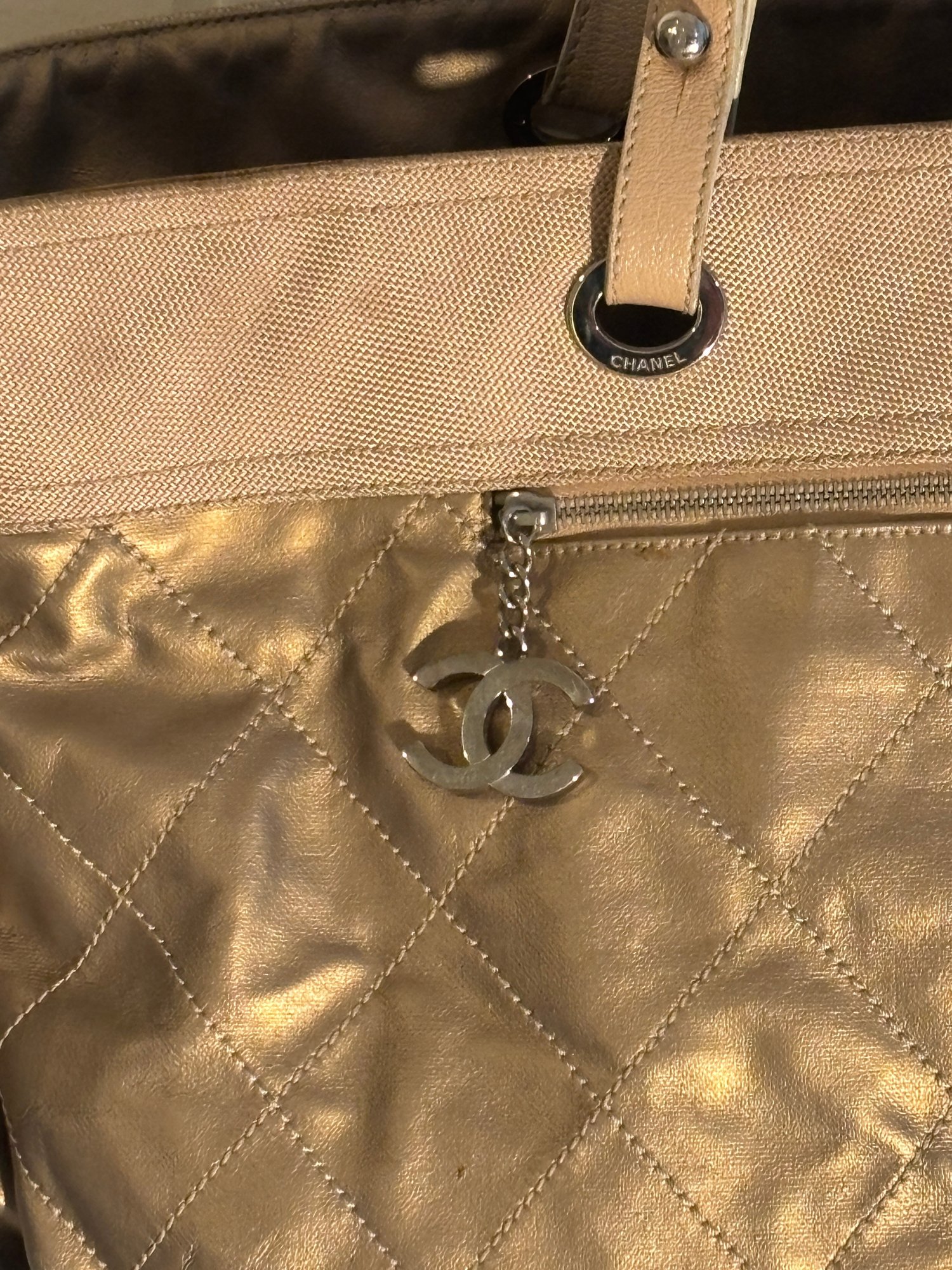 Bold, luminous, and unapologetically Chanel. This metallic gold quilted tote brings high-glam energy with diamond-stitched leather panels, canvas upper trim, leather shoulder straps with grommet hardware, and a dangling CC charm at the exterior zip pocket. The metallic finish catches light beautifully, giving the bag that liquid-gold look collectors love.