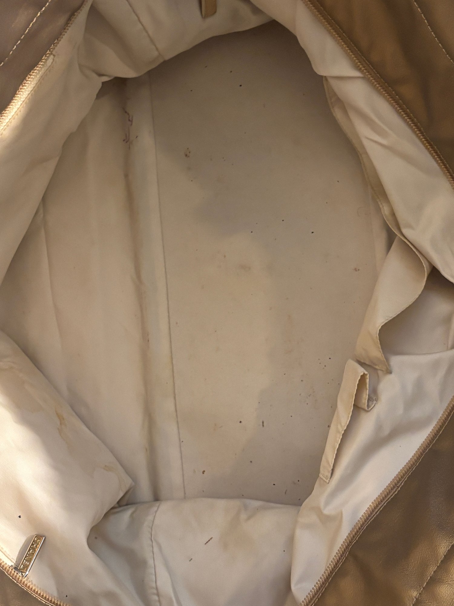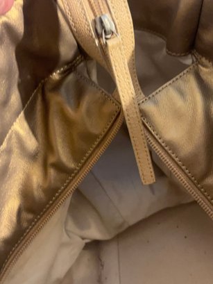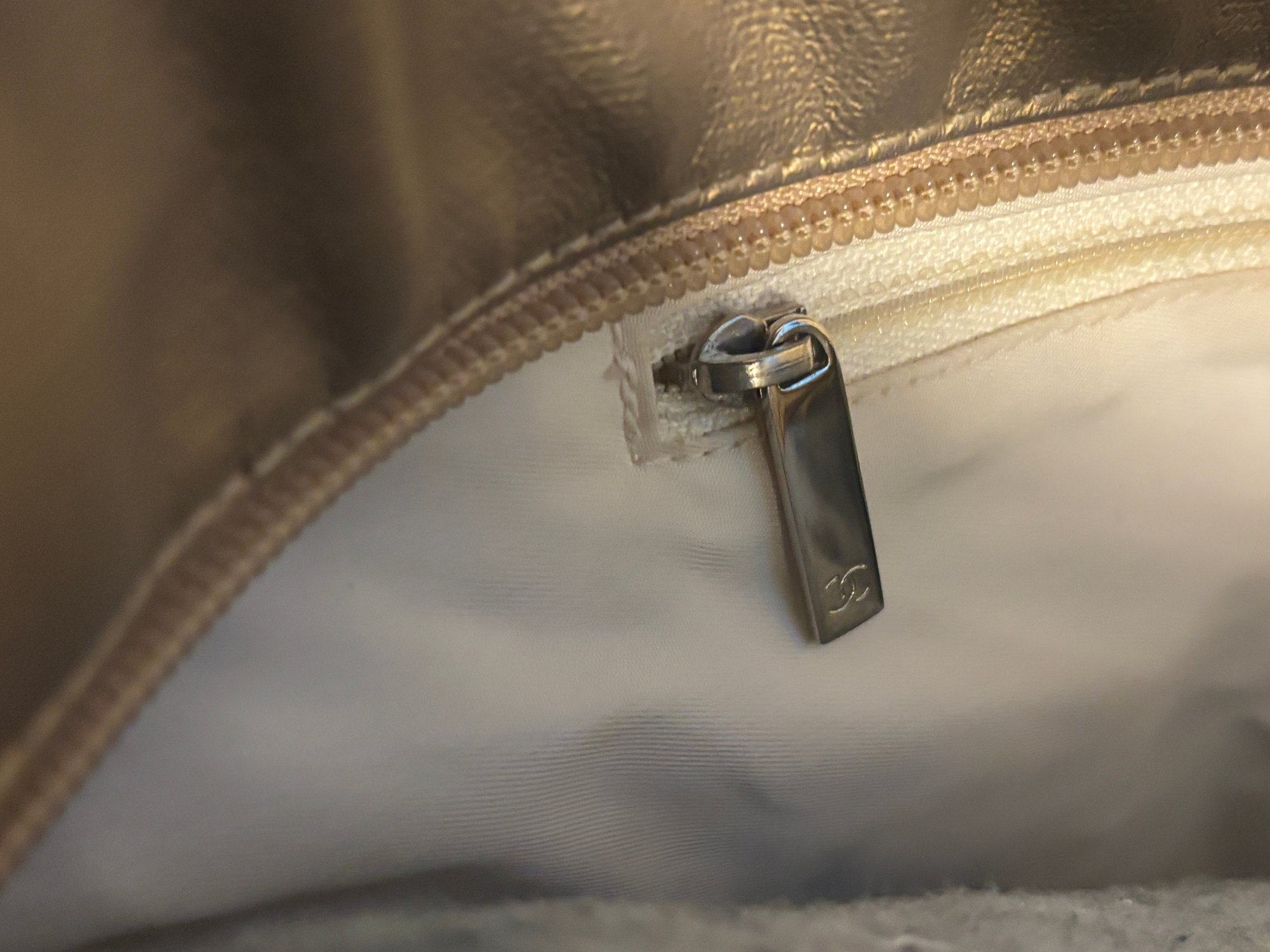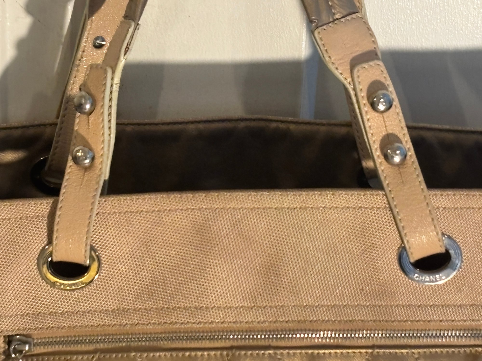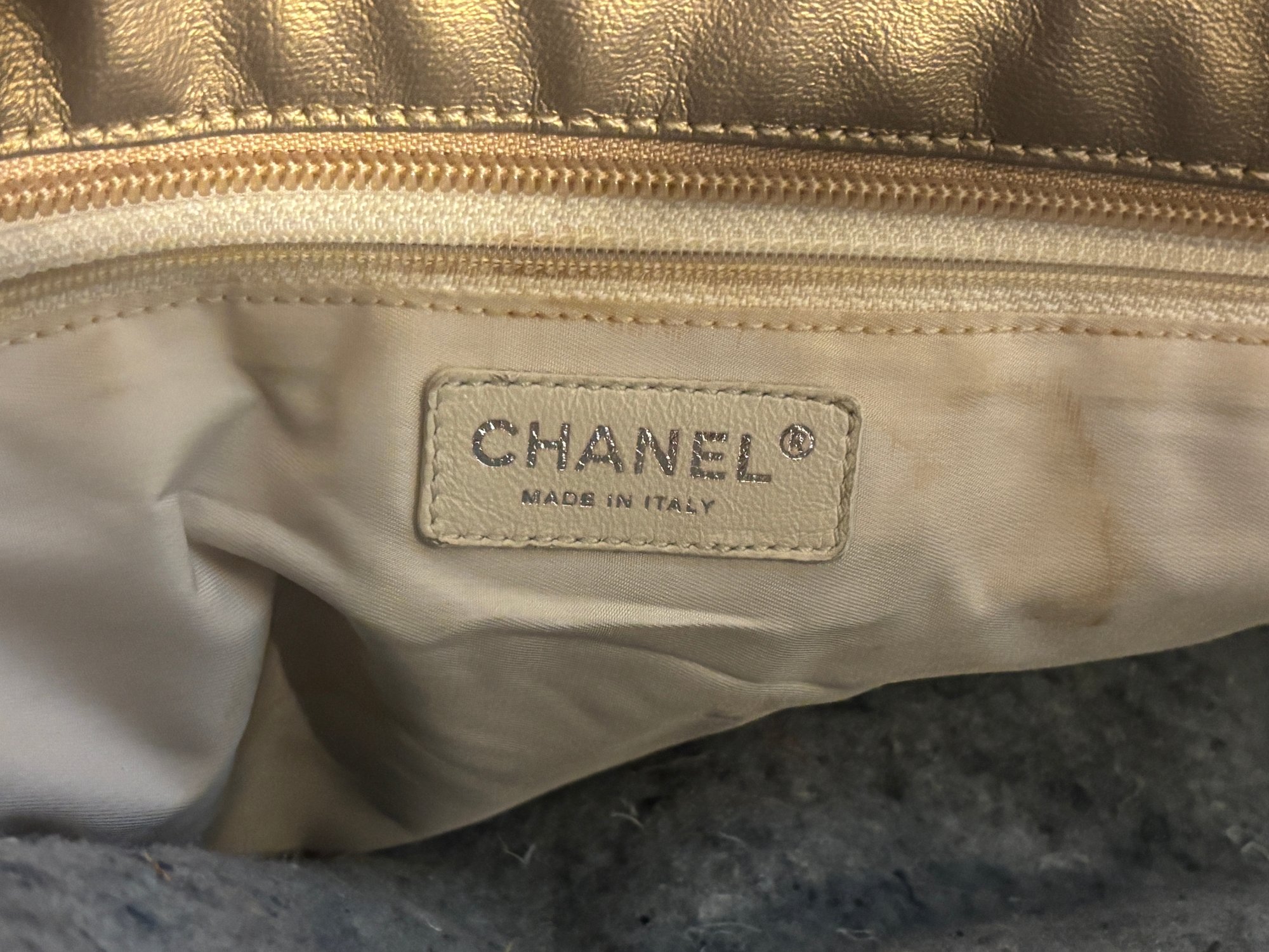 Bold, luminous, and unapologetically Chanel. This metallic gold quilted tote brings high-glam energy with diamond-stitched leather panels, canvas upper trim, leather shoulder straps with grommet hardware, and a dangling CC charm at the exterior zip pocket. The metallic finish catches light beautifully, giving the bag that liquid-gold look collectors love.