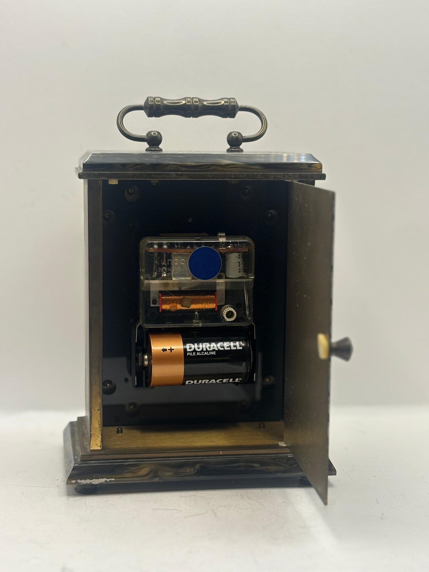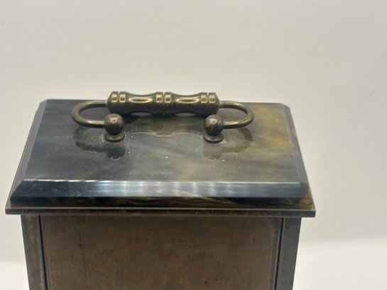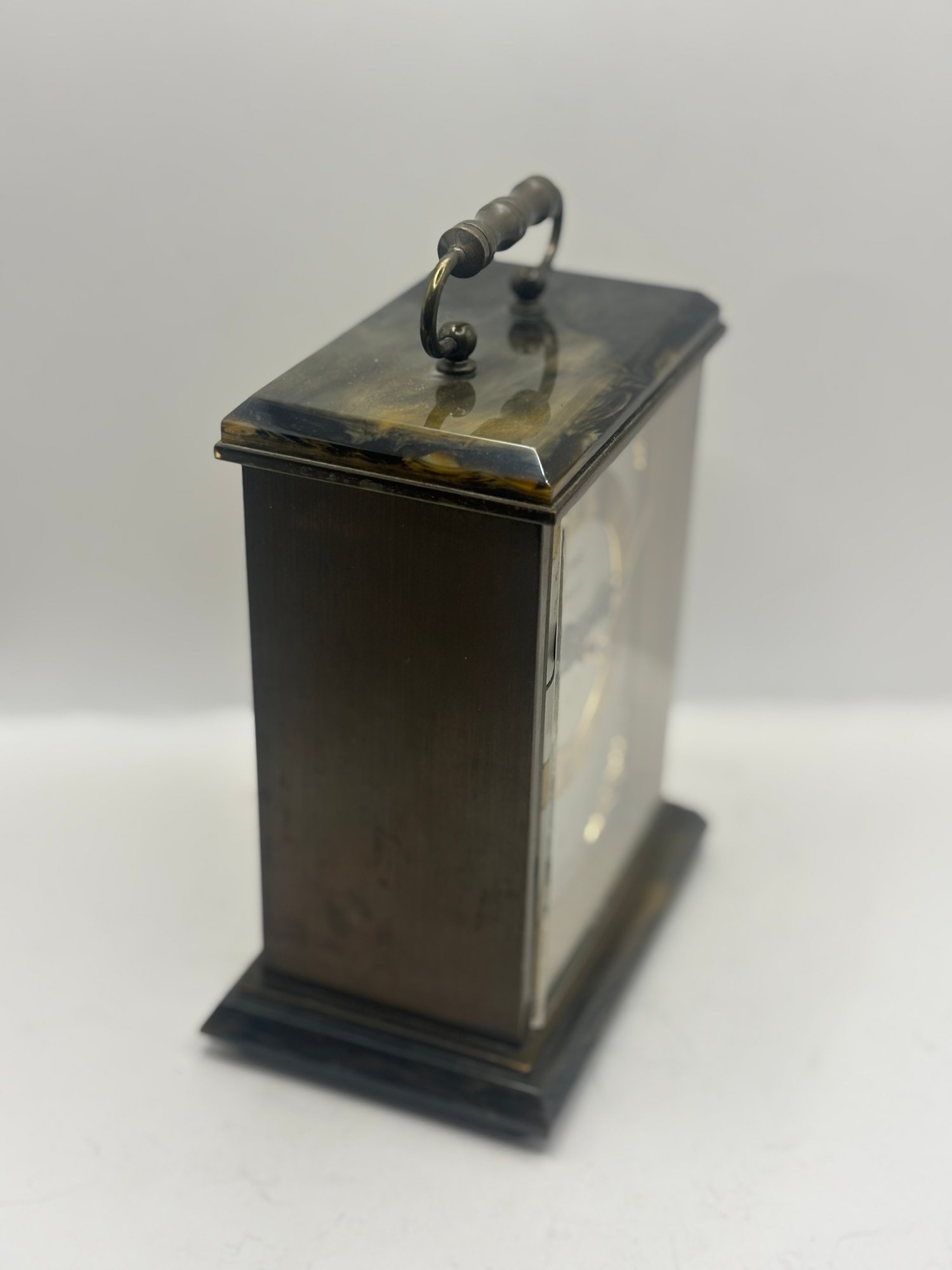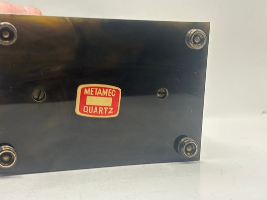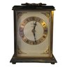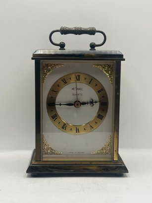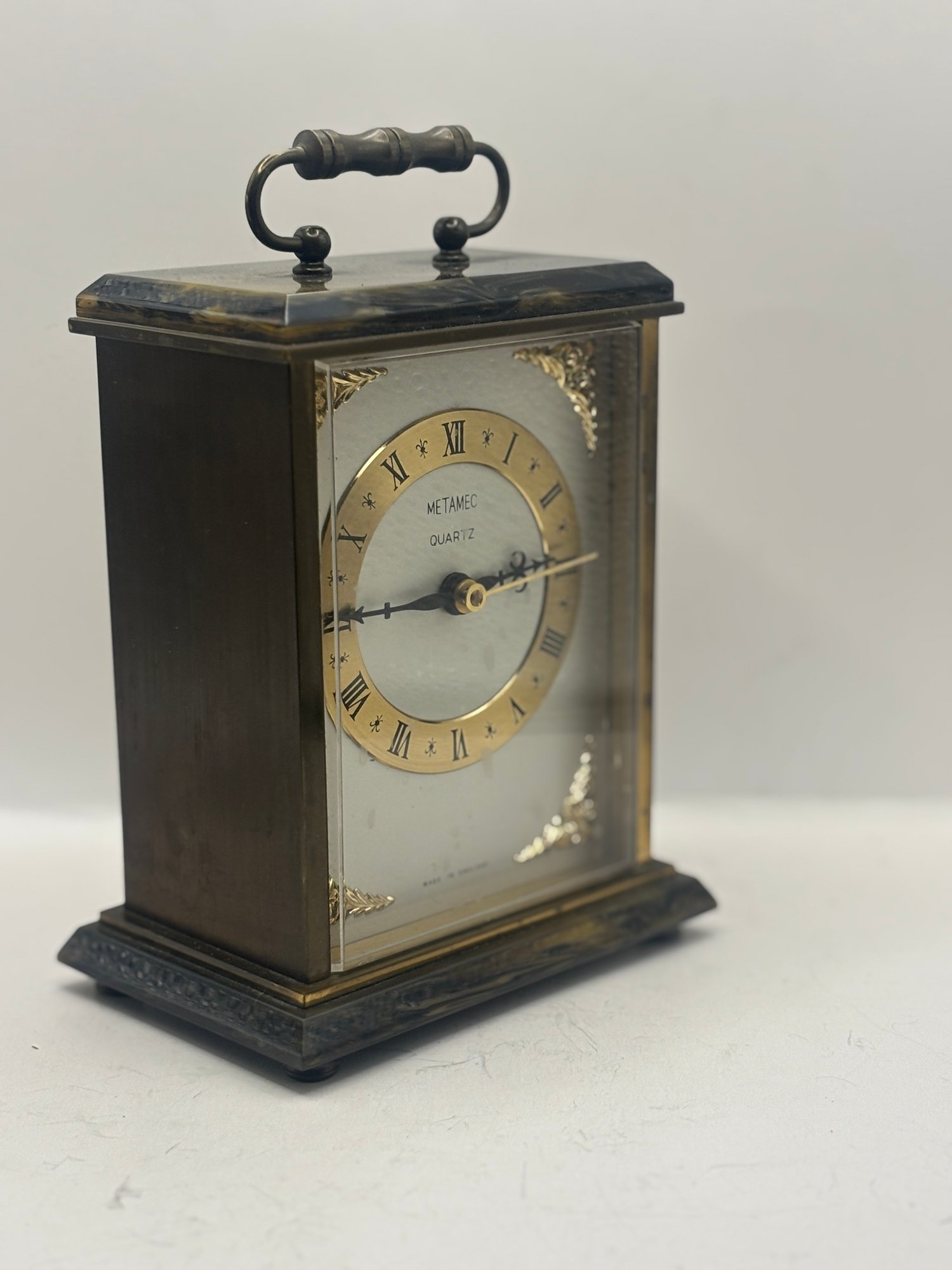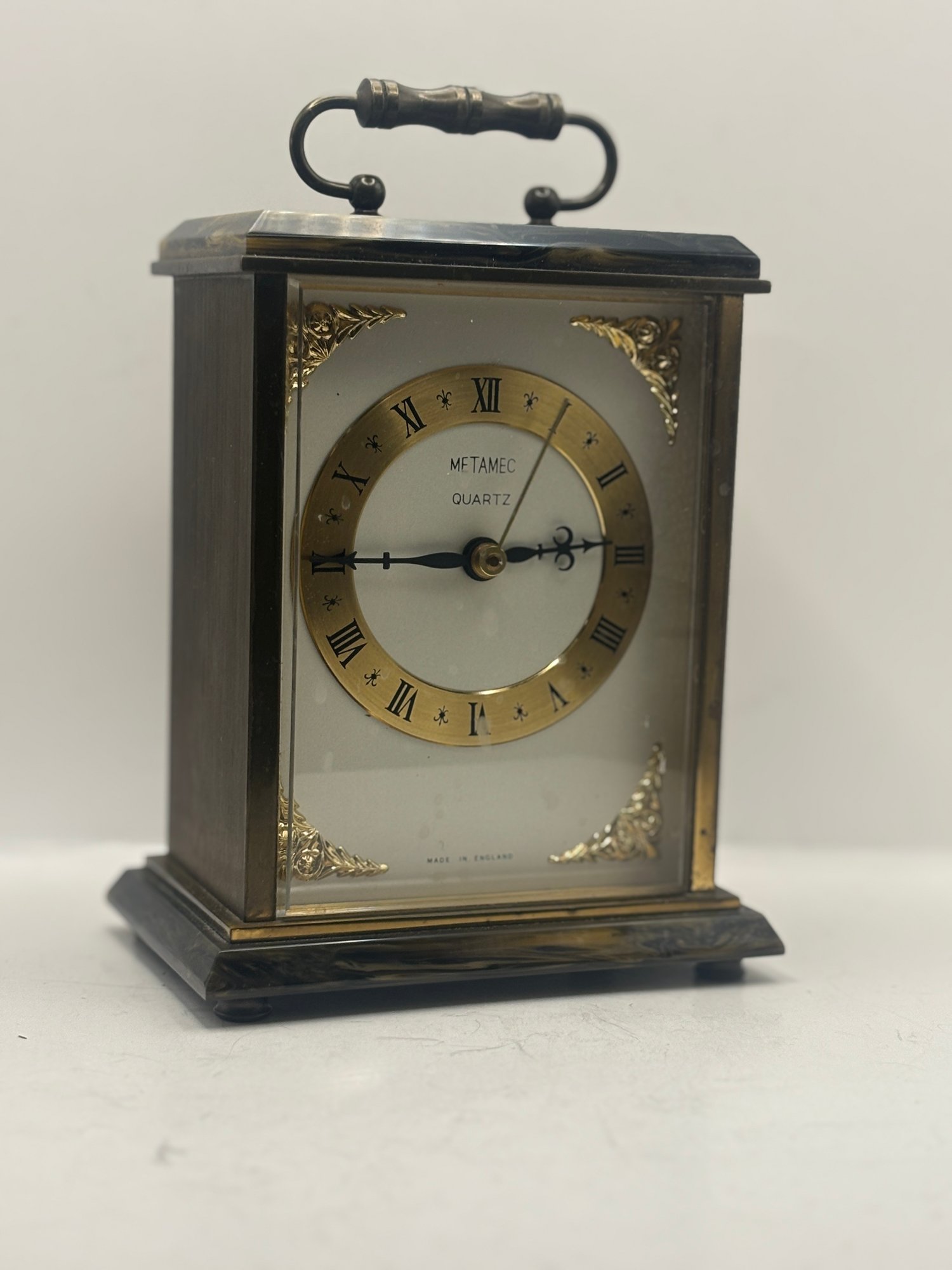 Classic Metamec quartz mantel clock with a polished brass-tone case, glass front, and decorative corner accents. The dial features Roman numerals with elegant black hands and subtle fleur-de-lis detailing. Set into a dark marble-style base and top, this piece has a traditional English mantel clock look that works beautifully on a shelf, desk, or sideboard. Marked “Made in England” on the dial.