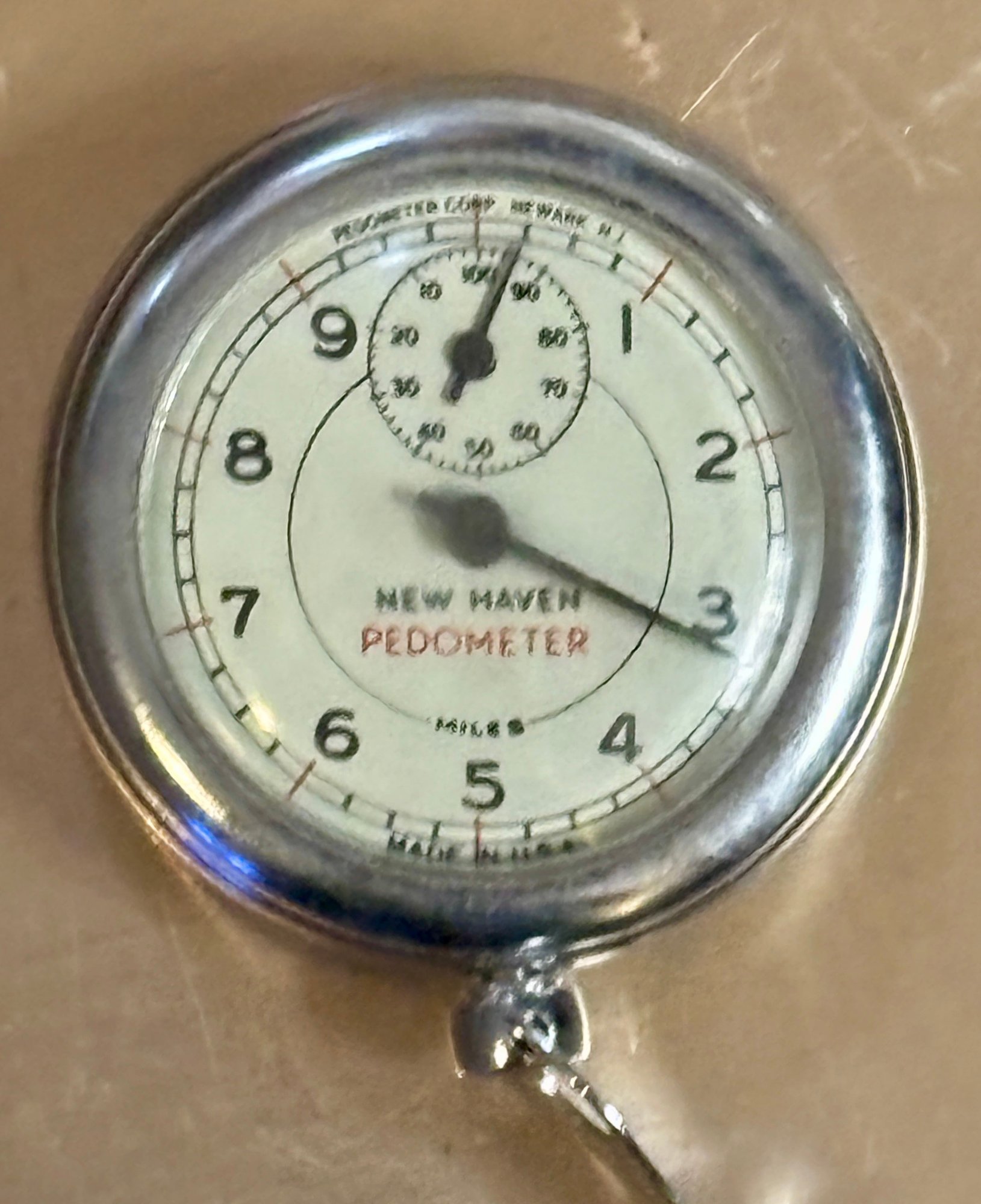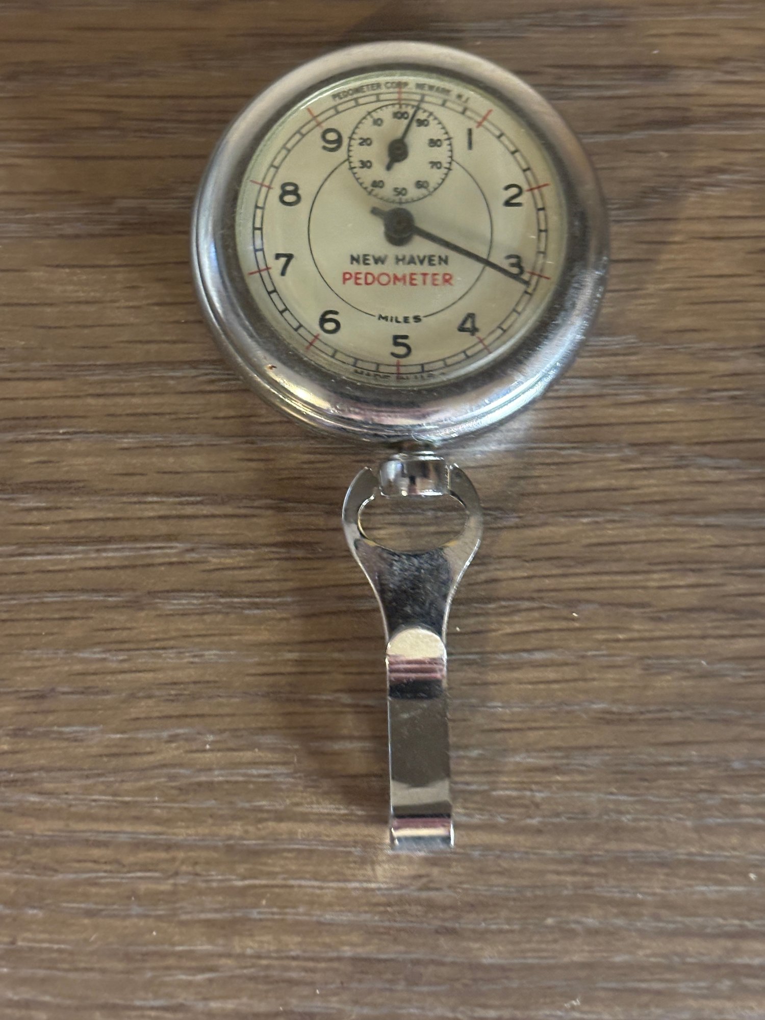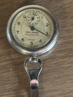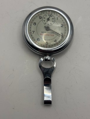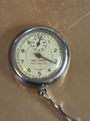 Classic mid-century mechanical pedometer by New Haven, produced by Pedometer Corp., Newark, New Jersey. Chrome-finished case with clear, easy-to-read dial marked “Miles” and secondary counter at top. Retains original belt clip on the back, designed to attach to waistband or pocket for everyday use. A charming piece of American-made fitness and gadget history, equally appealing to collectors of vintage instruments, industrial décor fans, or anyone who appreciates well-designed mechanical objects.