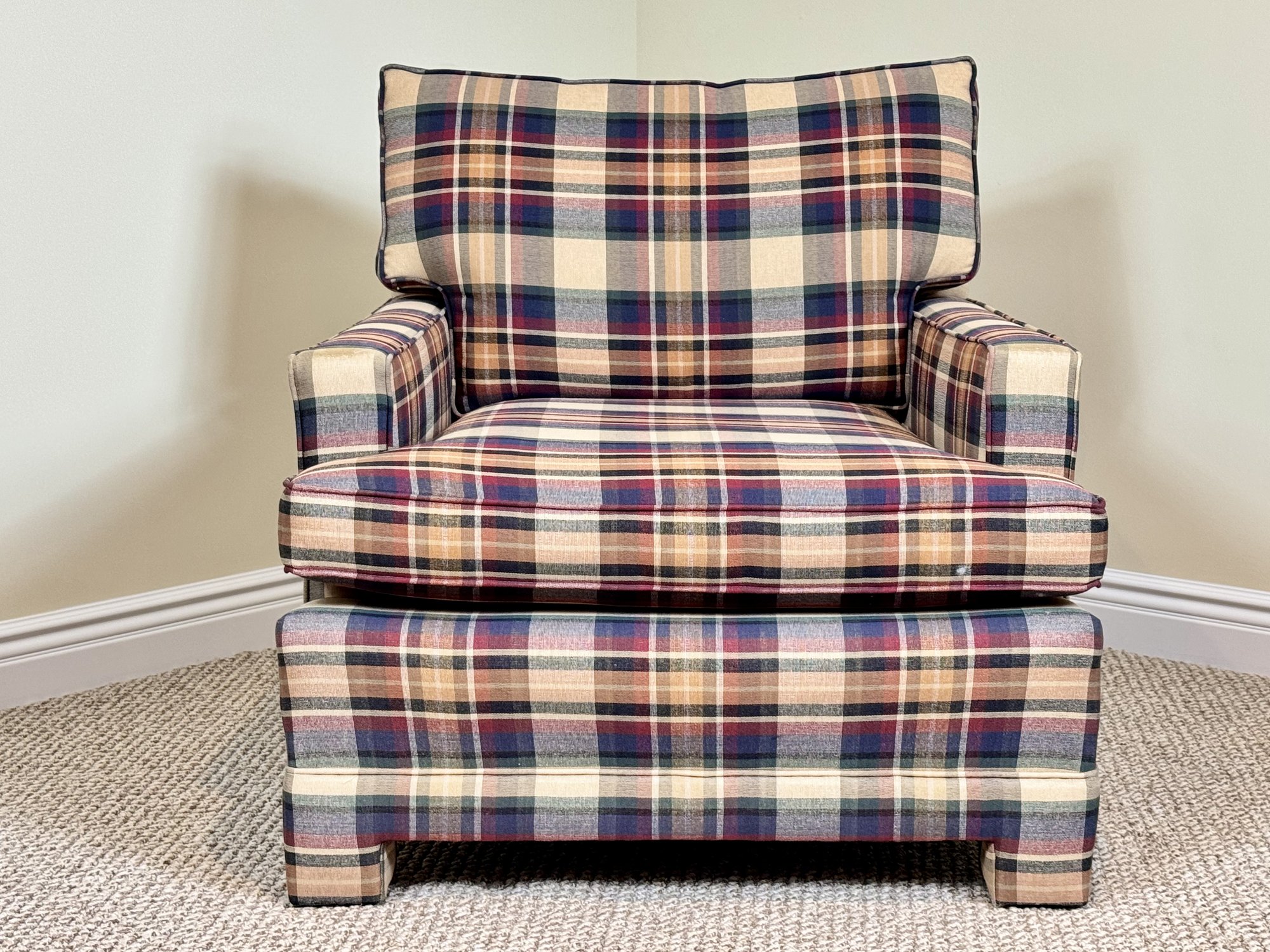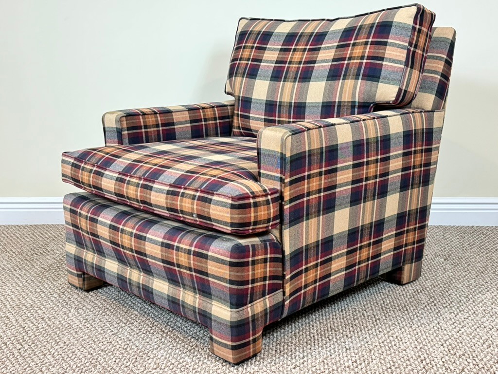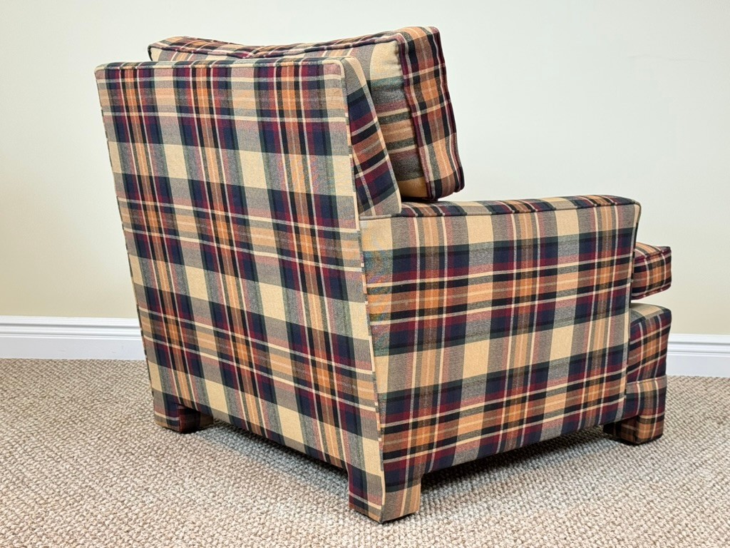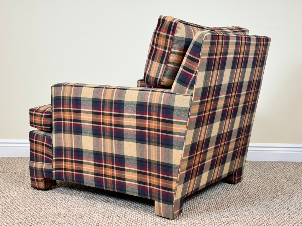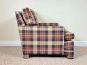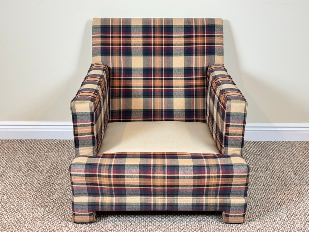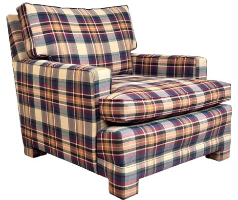 This substantial upholstered club chair features a tailored silhouette wrapped in a traditional plaid fabric in warm, earthy tones — navy, burgundy, forest green, camel, and cream. The cushions both have zip closures.