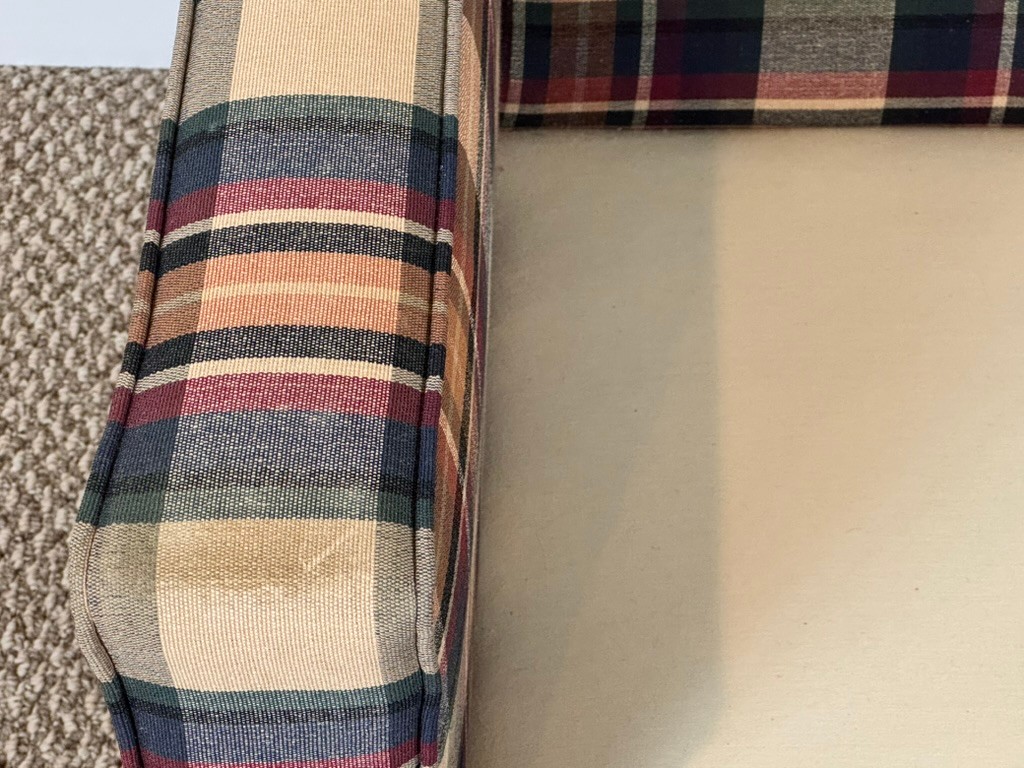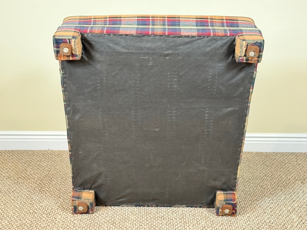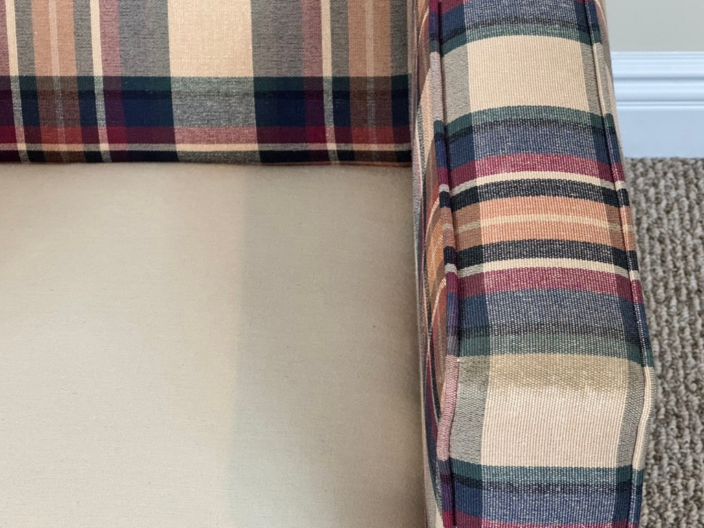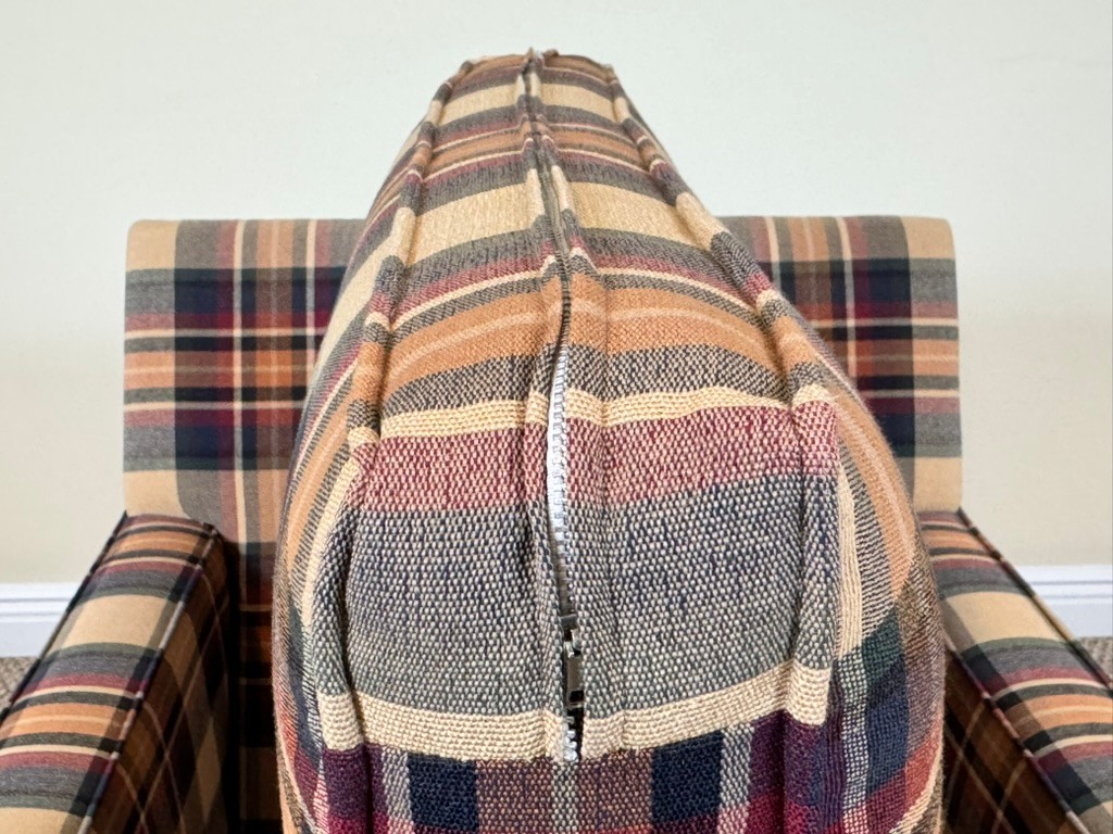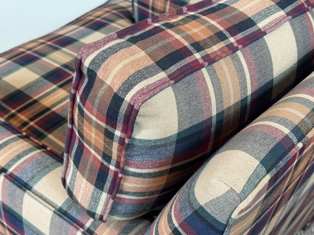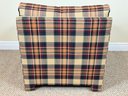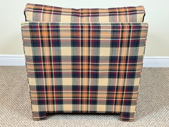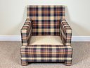 This substantial upholstered club chair features a tailored silhouette wrapped in a traditional plaid fabric in warm, earthy tones — navy, burgundy, forest green, camel, and cream. The cushions both have zip closures.