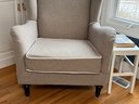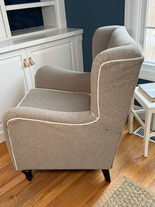 Classic upholstered wingback accent chair featuring a neutral grey textured fabric and crisp white piping that highlights the elegant lines of the frame. The chair offers supportive high-back comfort with gently curved wings, rolled arms, and a generously cushioned seat.