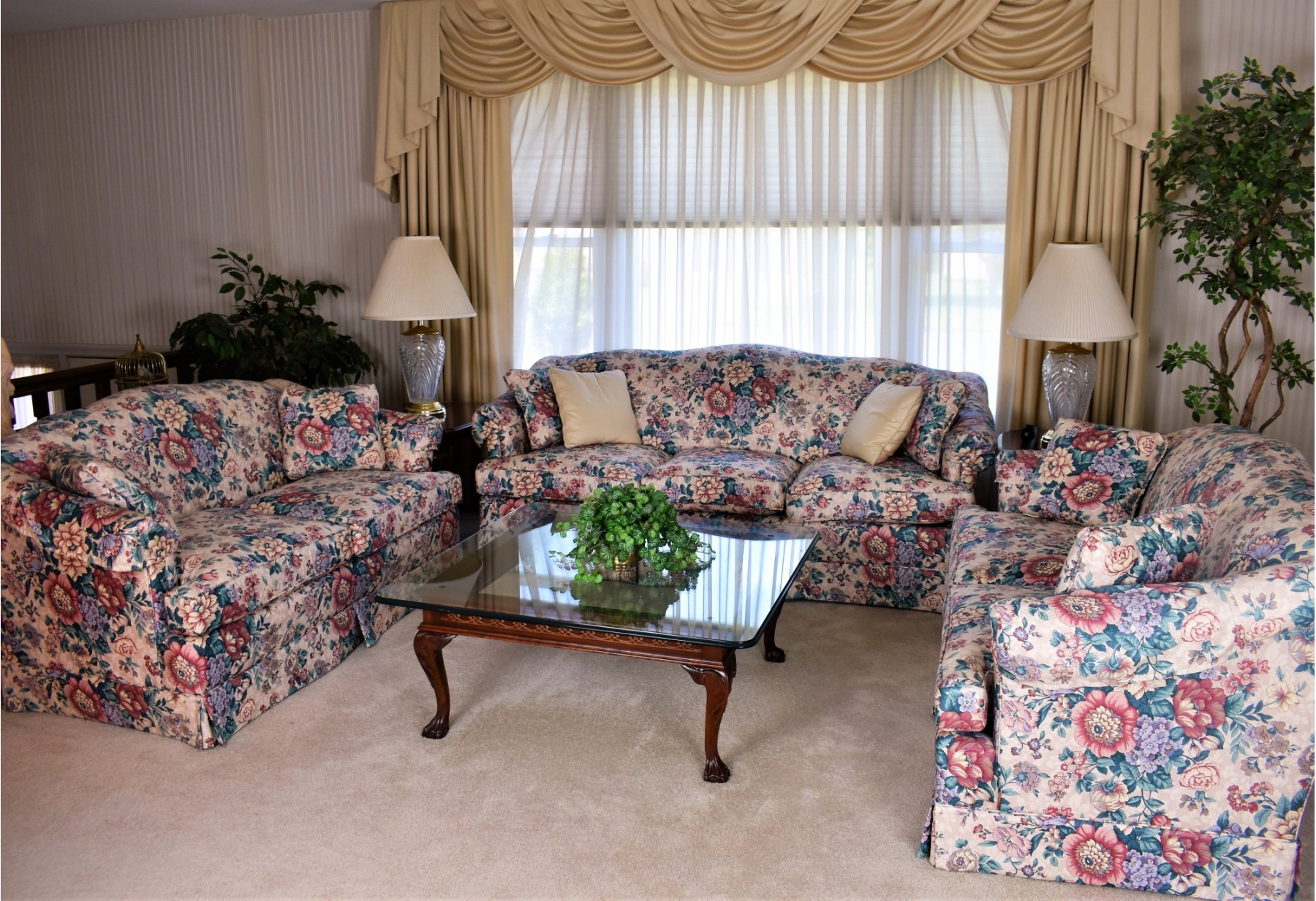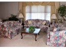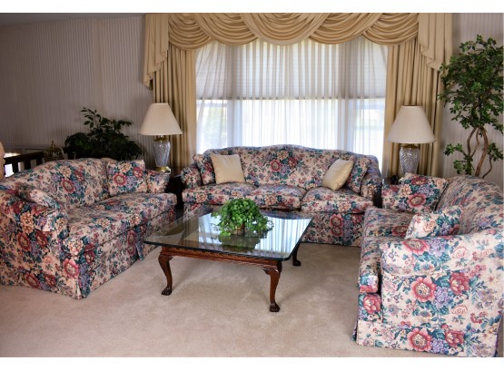 Three piece set in good condition, free from tears or stains. From pet and smoke free home. Pieces were well cared for and used in formal sitting room. Loveseats measure 62”x 32”. Sofa measures 77” x 32.5”. Great look for a Florida room or formal setting.