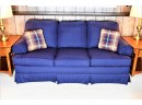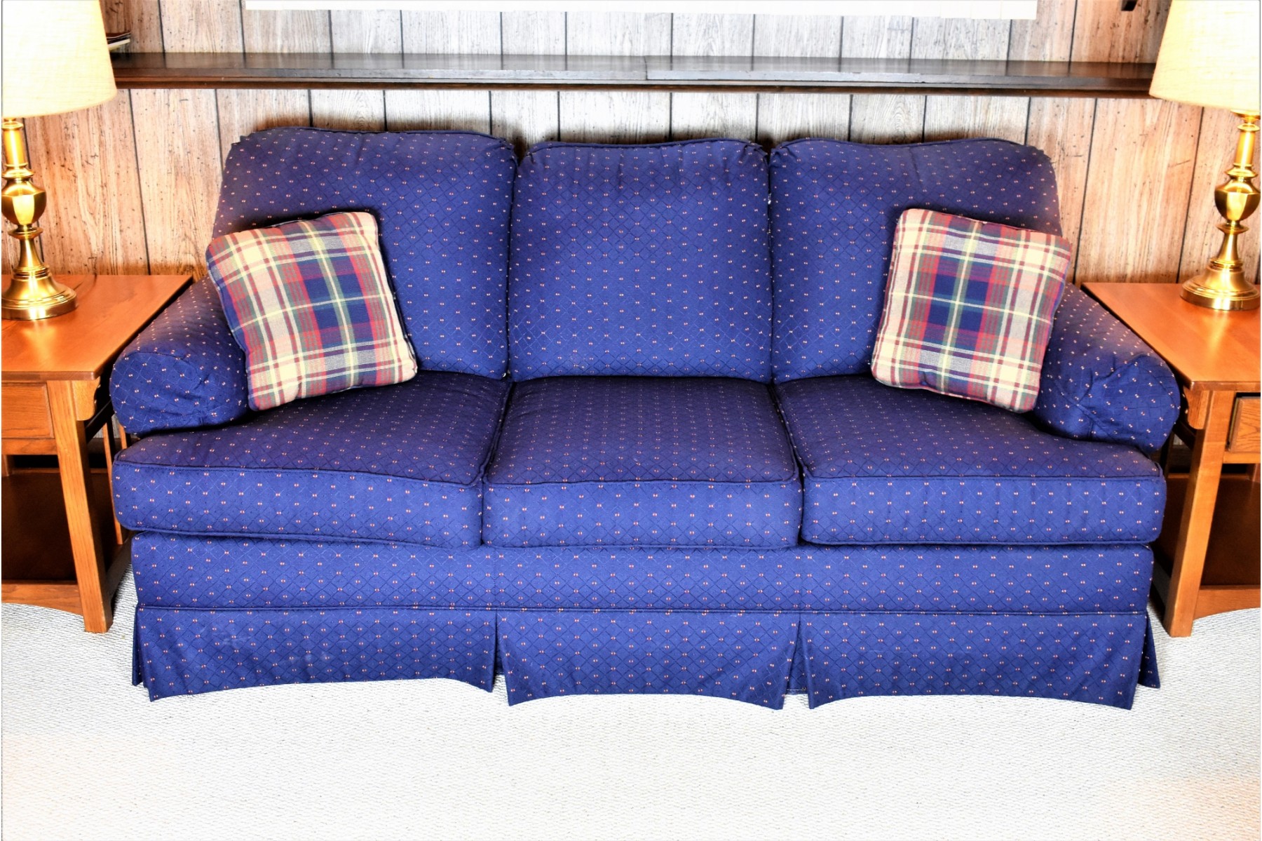 Sofa is in very nice condition. Upon quick visual inspection the Mattress appears clean as well. Sofa is very lightly used. Well kept. Measures 76"x 37"x 36". Has matching throws. Plaid throws do not go with couch.