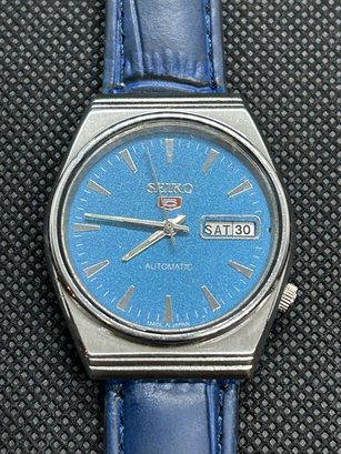 It has a sleek design, with thin stainless-steel case, bold blue dial with day-date window, and working automatic self-winding movement. As with anything Seiko, very good quality.
