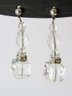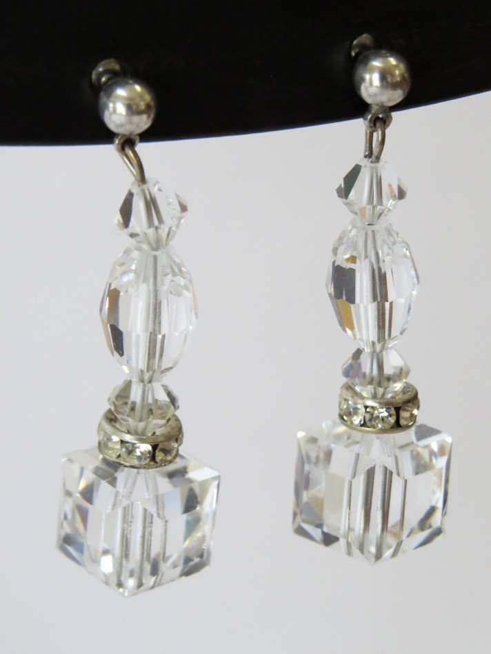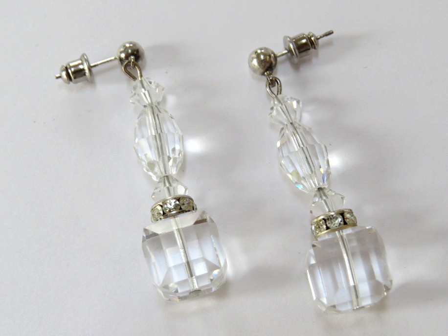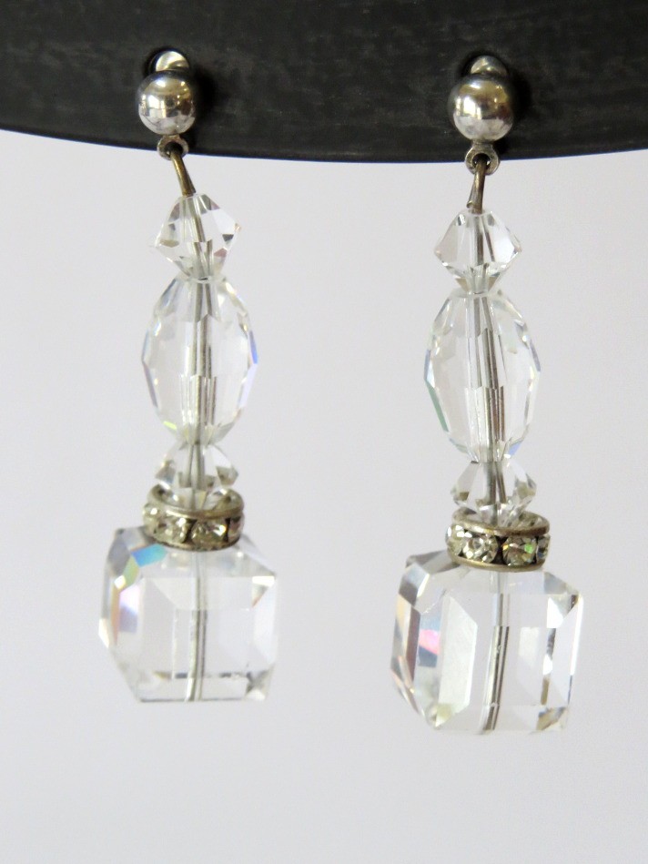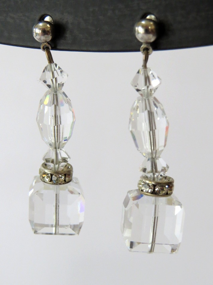 Sparkly clear faceted glass bead dangle earrings. These earrings have a silver tone stud with matching silver rhinestone band around the lower portion of the earring. Earrings measure 1 3/4" long.