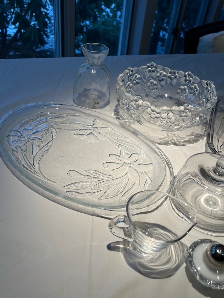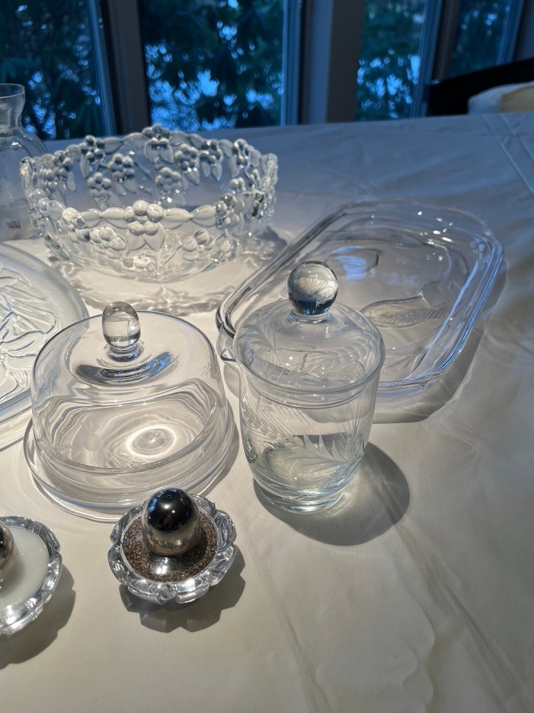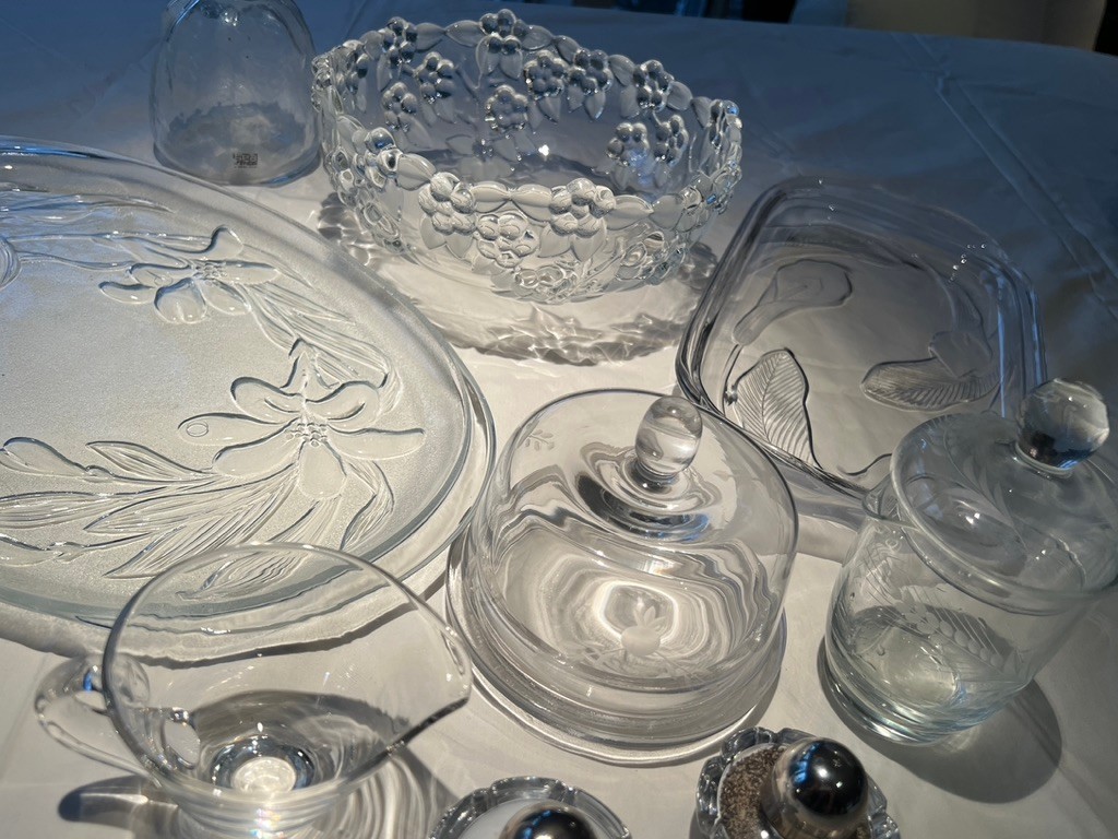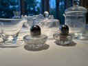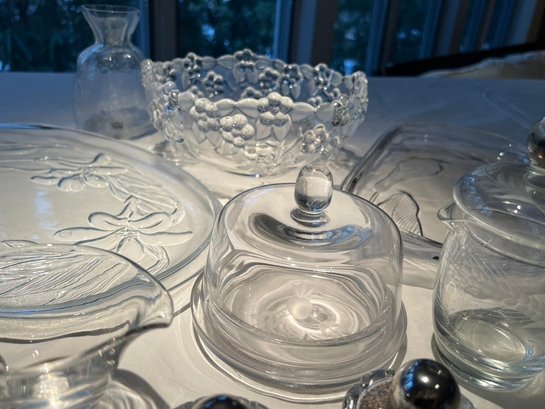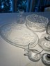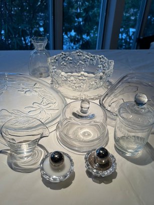 Clear, wheel cut, frosted glass lot, some new, some old, lovely lot of mixed use glass and crystal, covered butter dish, blows, S & P, platters, and more